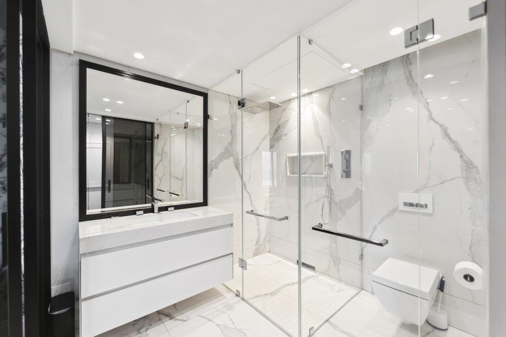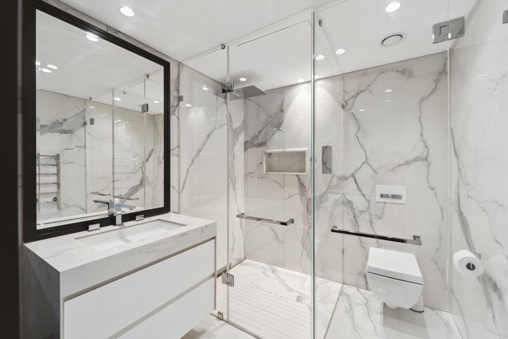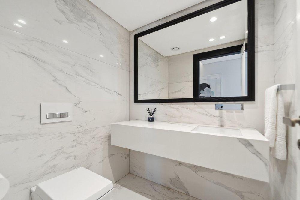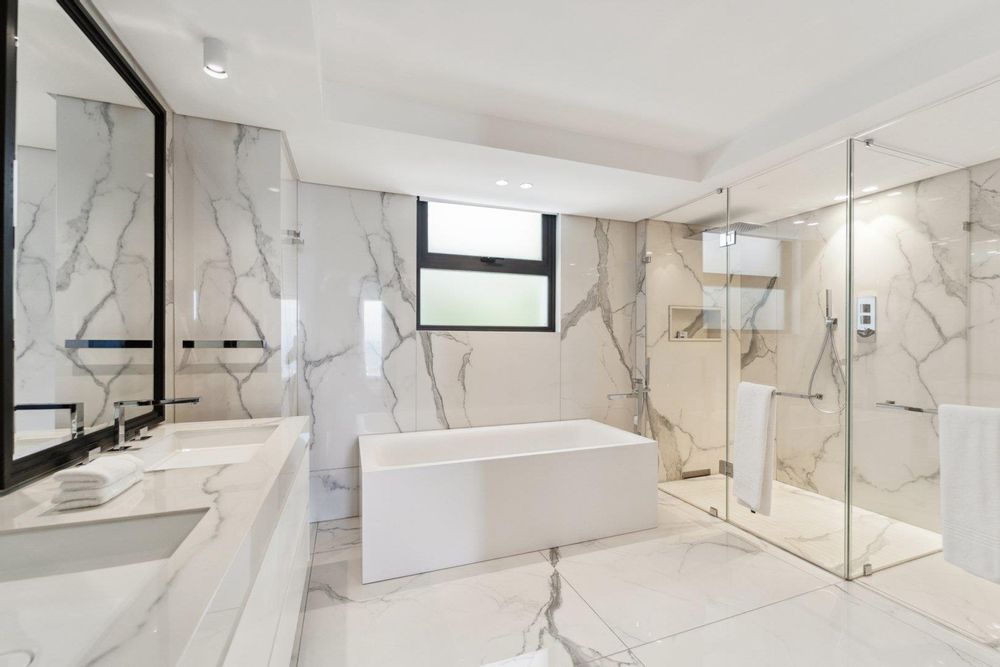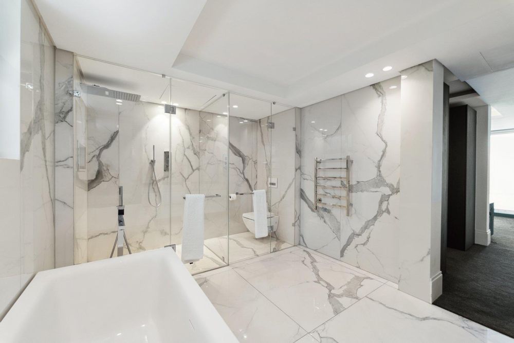The large bathrooms all have spacious showers with independent water equalizer systems, heated towel rails and separately enclosed toilets with floating vanities, except the main master en-suite that offers a bit more - a full bathroom with a free-standing bath, large shower and floating double basin vanity.