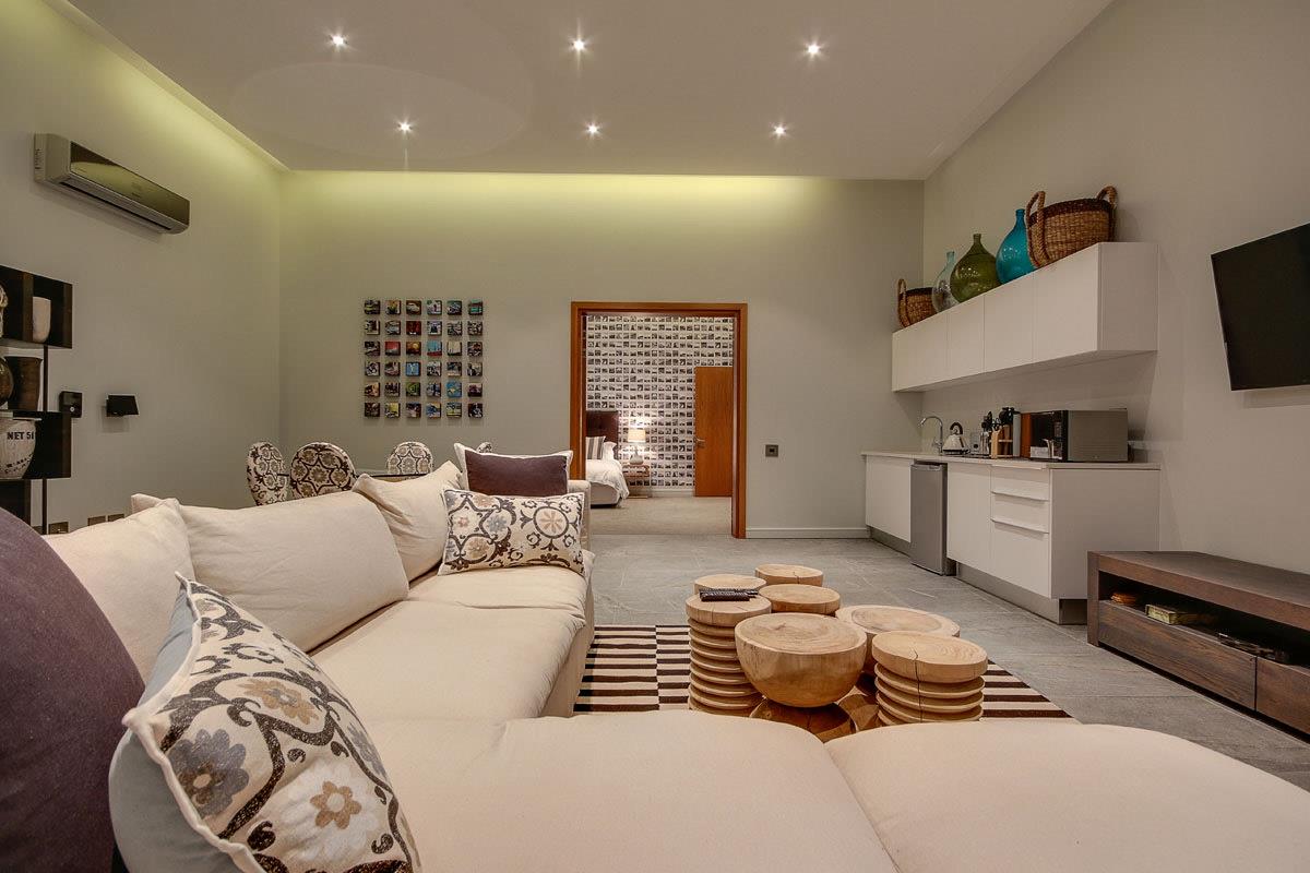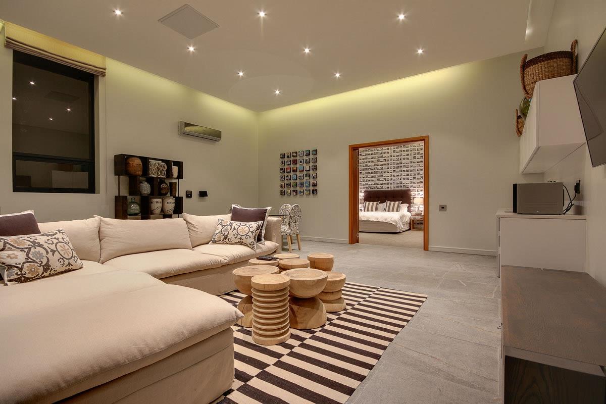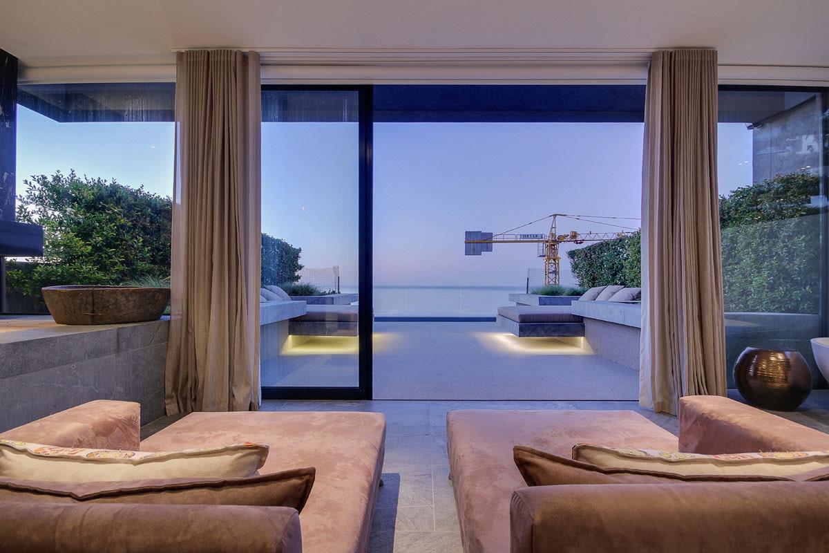 A private lift connects every level, gliding you from the dramatic double-volume living area to the serene garden terrace. The main living space combines a chef’s kitchen, sculpted bar, scullery, dining area, and lounge — all opening to panoramic sea views.