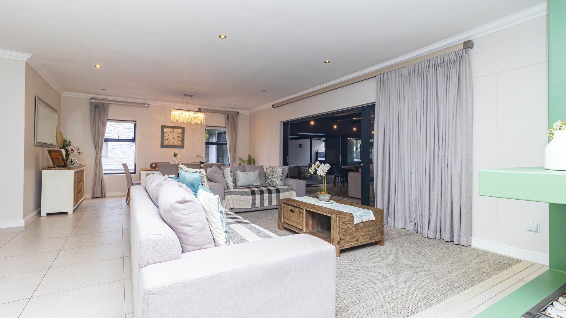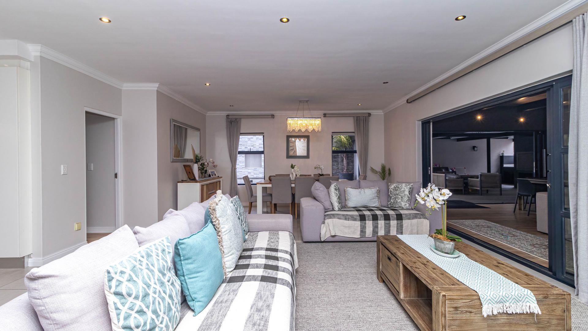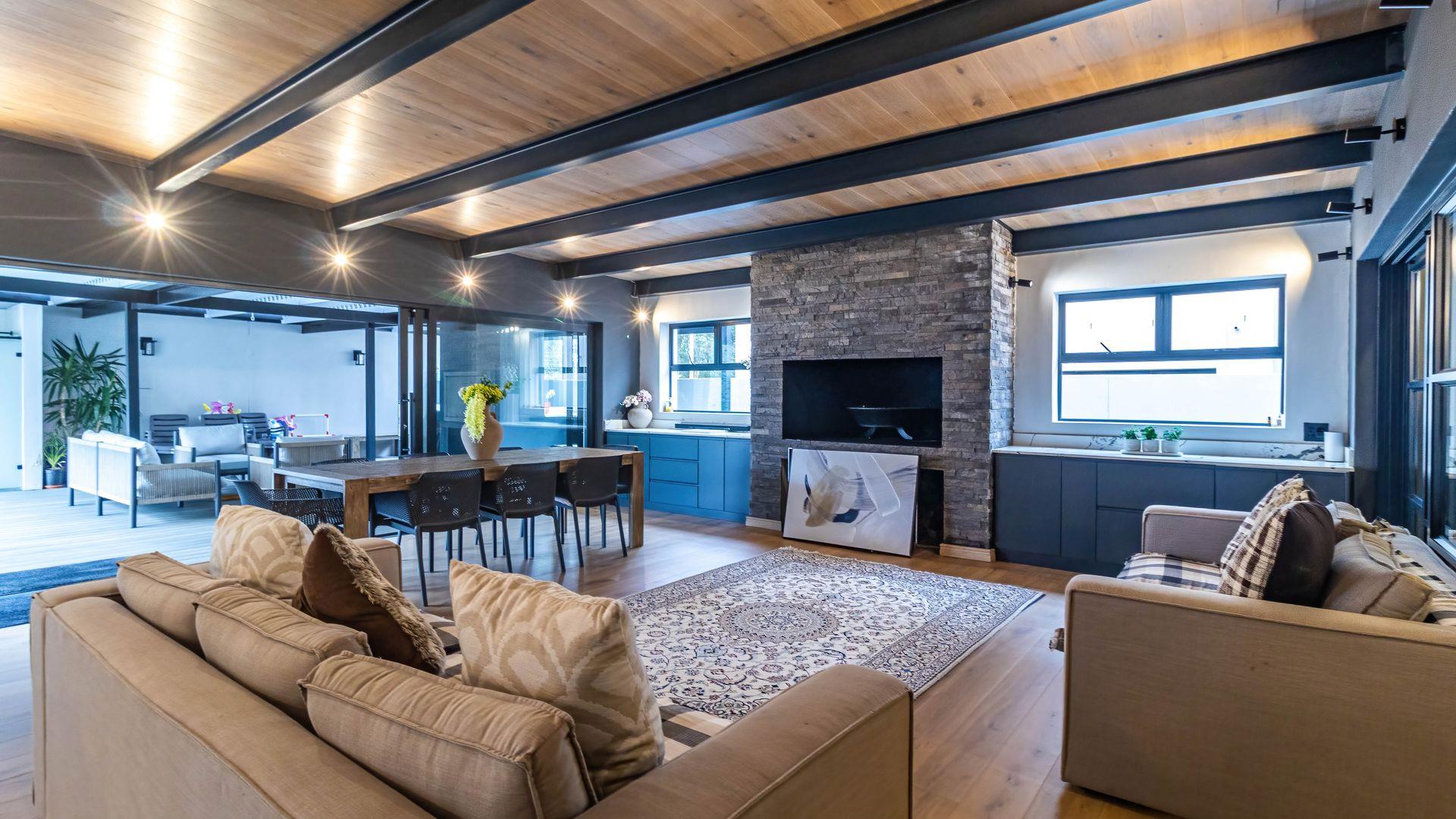 At the heart of the home, the sleek open-plan kitchen makes a bold statement with its contemporary finishes, generous workspace, and separate utility room for streamlined functionality. The adjoining dining and lounge areas create an easy indoor flow, leading into a light-filled entertainment room complete with an indoor braai—perfect for hosting in any season.