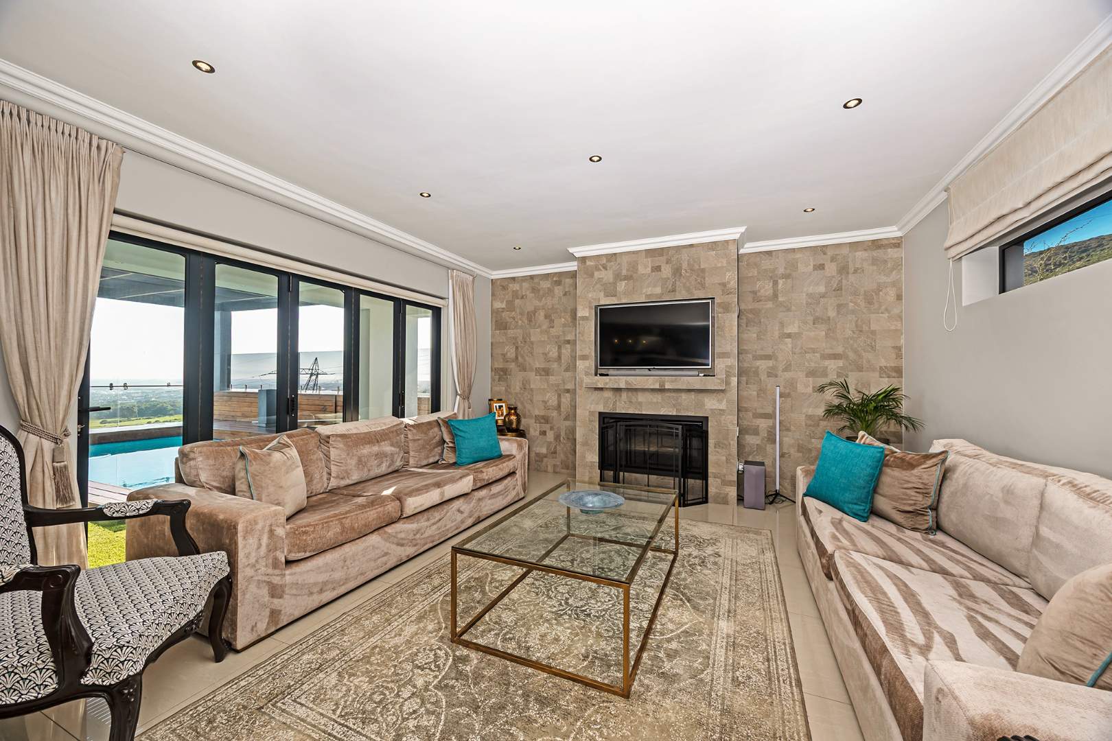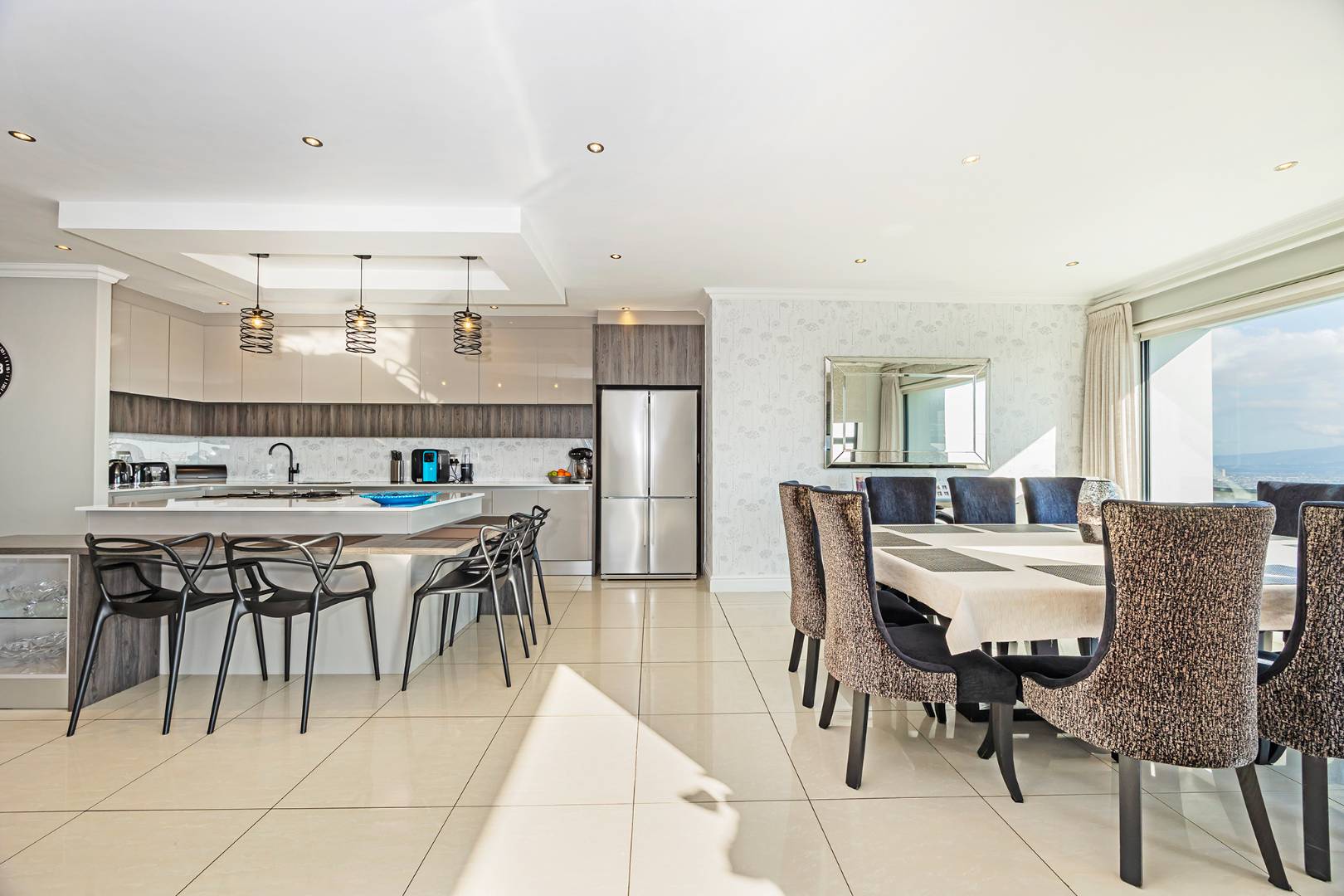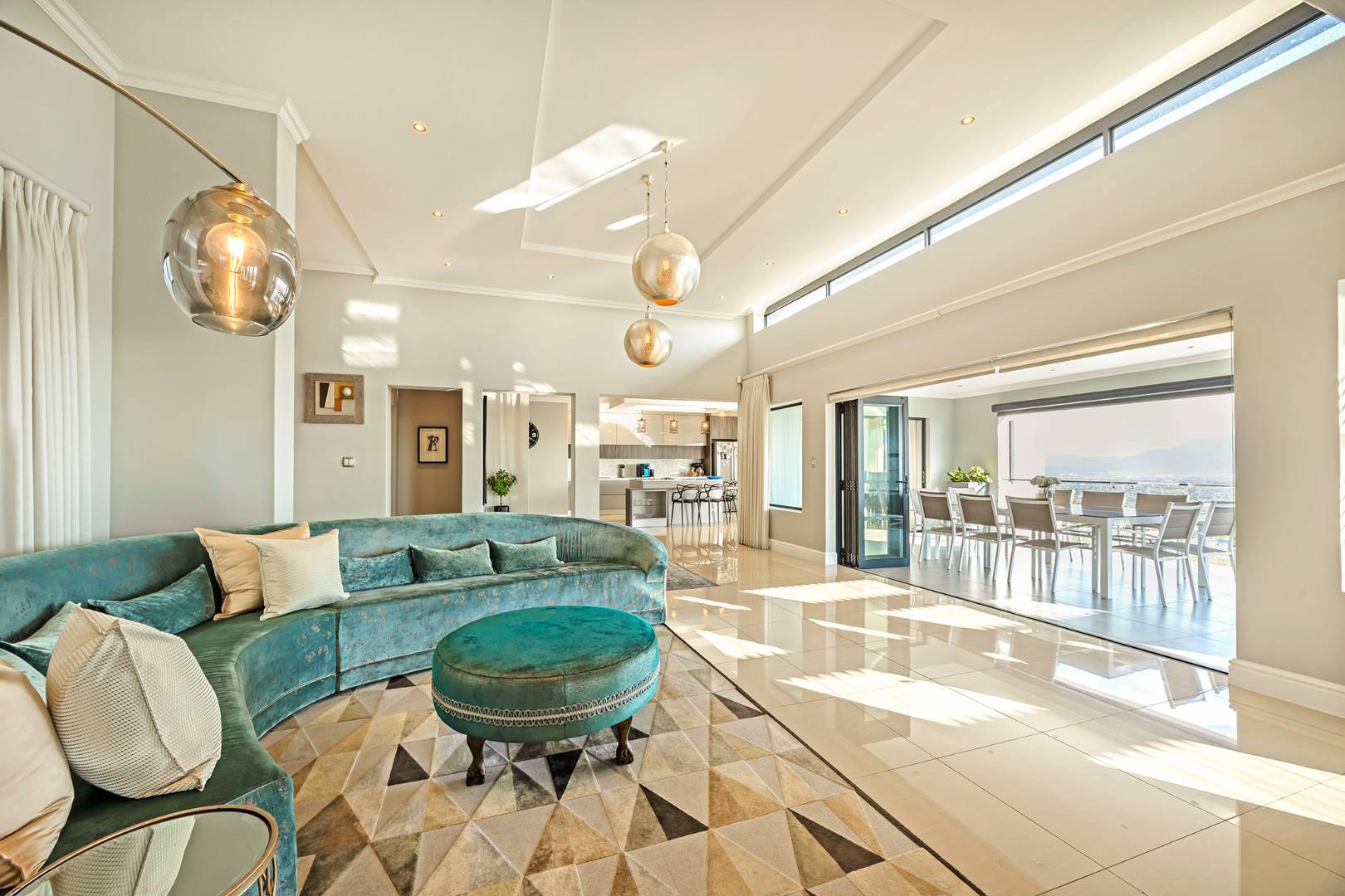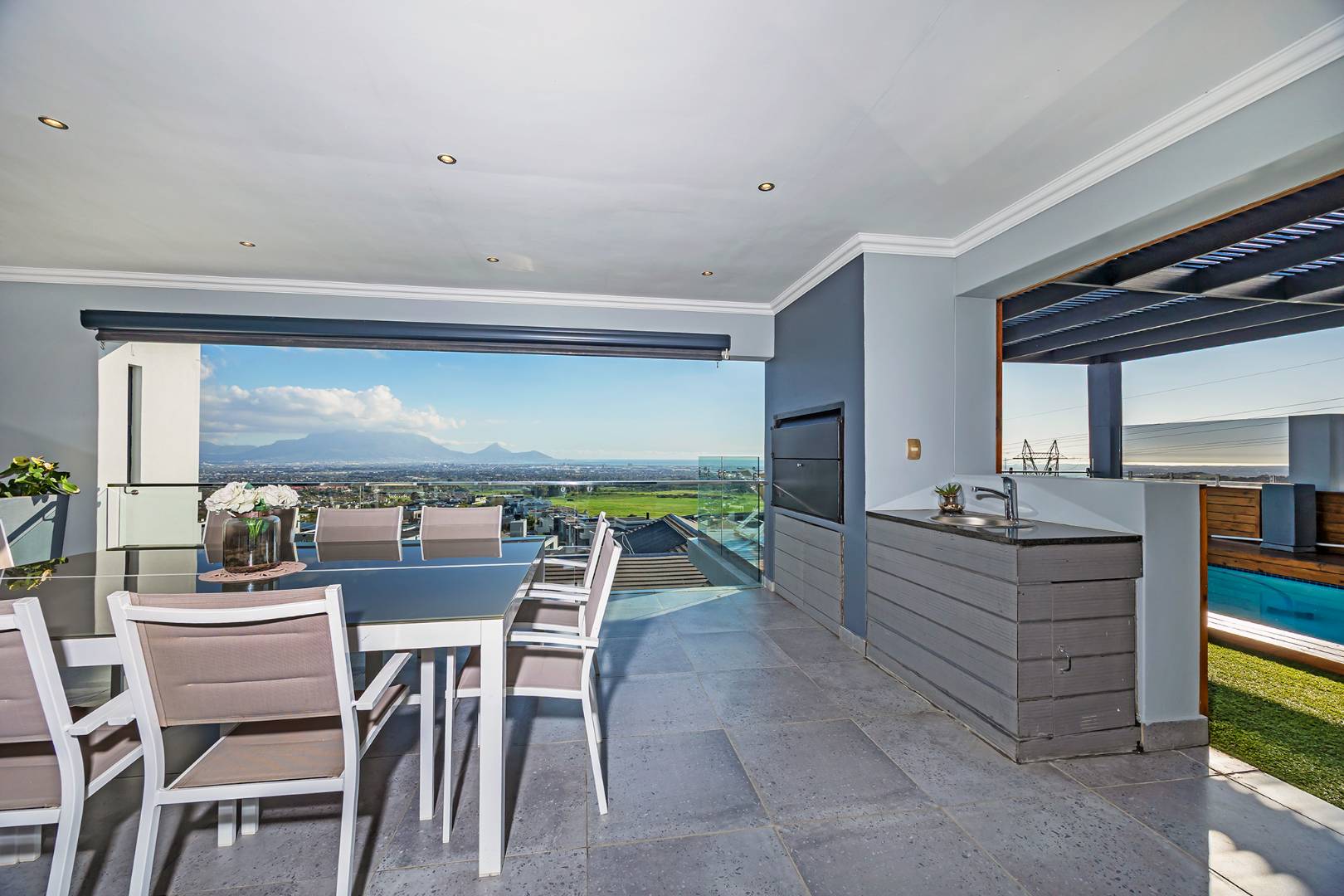 Flowing seamlessly across three levels, the home has been designed for effortless living and exceptional entertaining. At its heart, a bespoke designer kitchen — a hobby chef’s dream — integrates beautifully with an elegant dining area, where a wide picture window captures the ever-changing mountain skyline. Expansive reception areas open to a sunlit patio with a stylish undercover braai, leading to a heated pool that offers both privacy and world-class views.