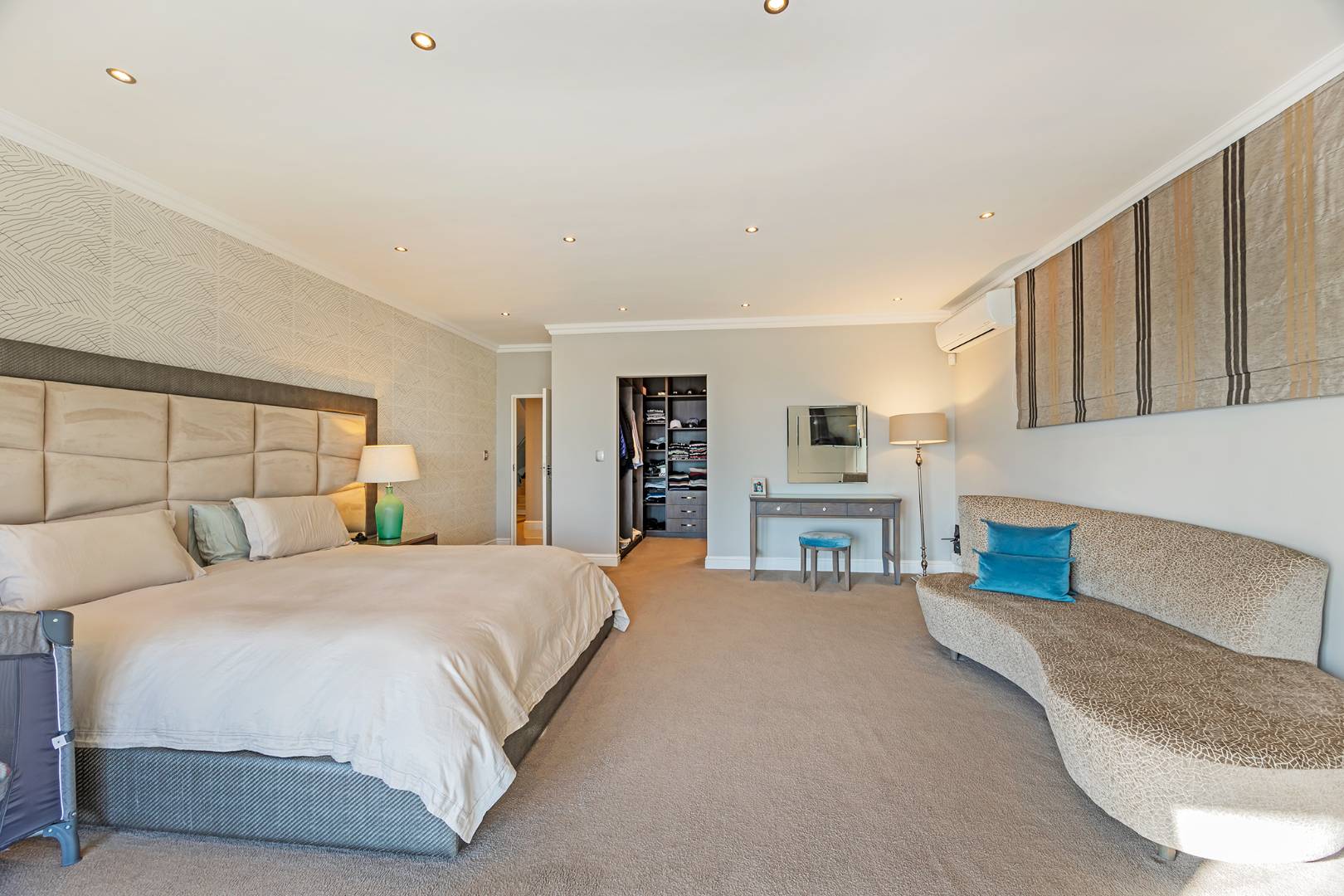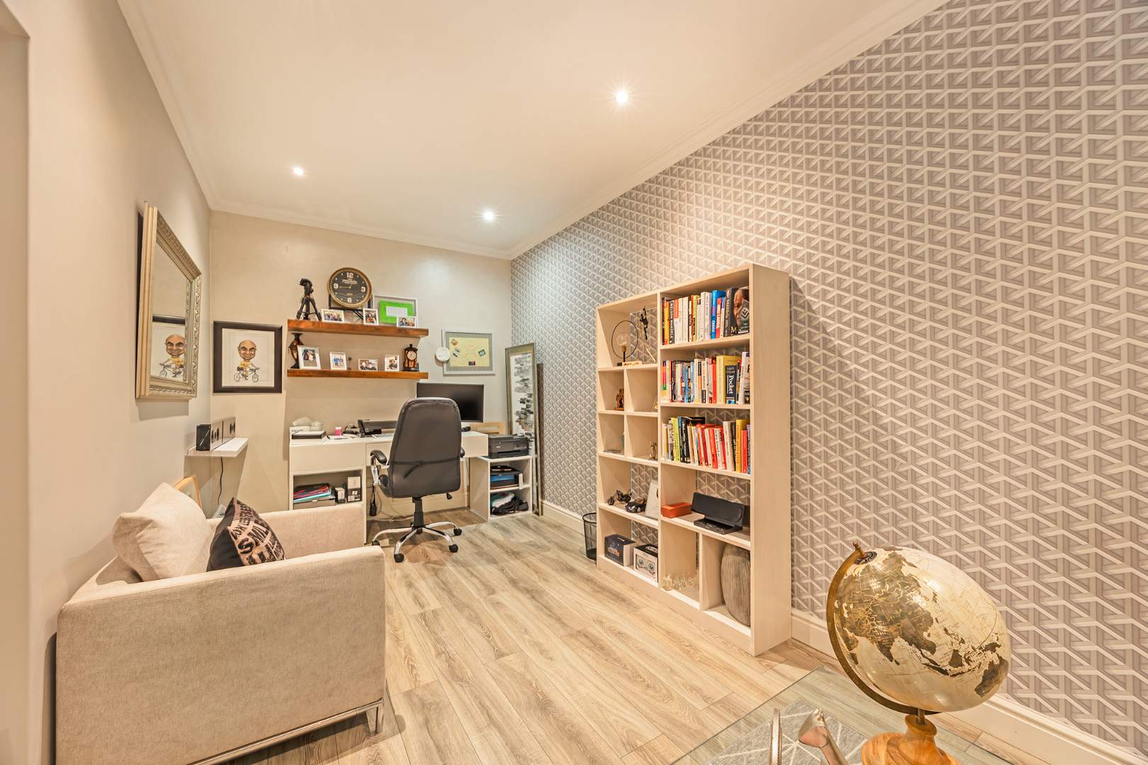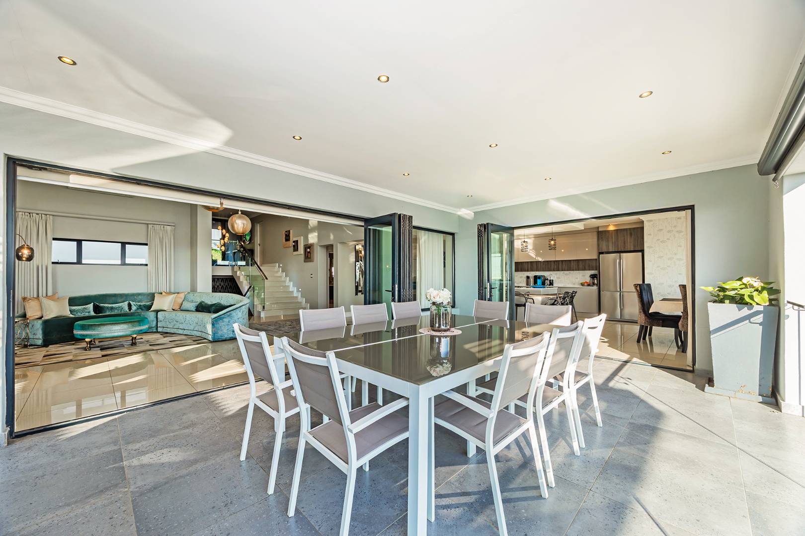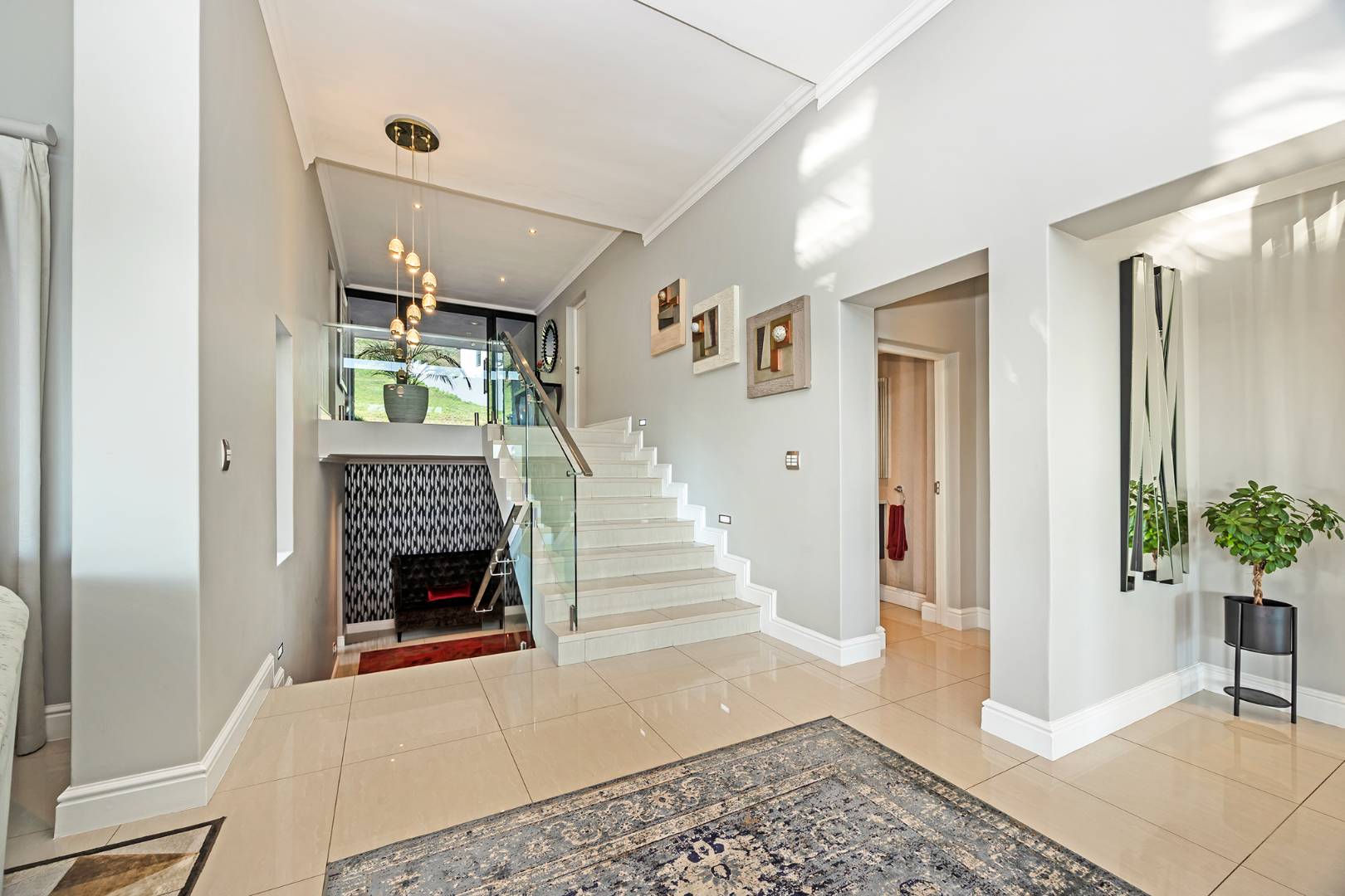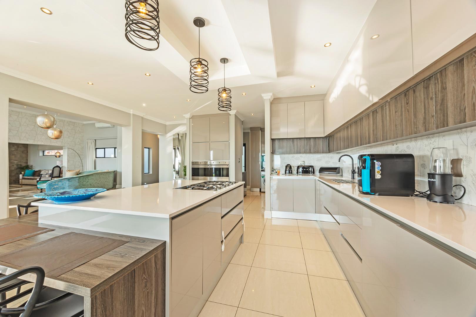 Additional features include three garages, off-street parking for four vehicles, a fully equipped gym, staff accommodation, and a storeroom. Sustainable living is made easy with a battery backup inverter system and solar geyser.