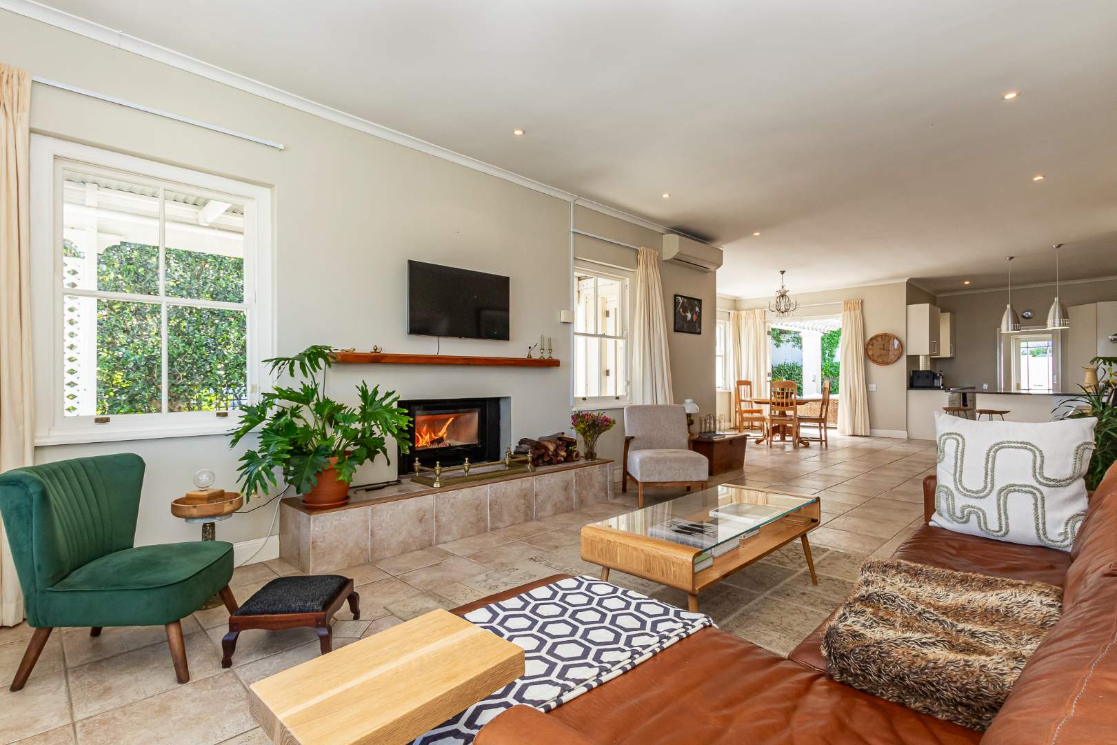 The property includes two cozy reception areas, with the main lounge featuring a lovely fireplace, creating a warm and welcoming atmosphere. The home boasts three well-appointed bedrooms: a master bedroom with a large en-suite bathroom, and two additional bedrooms that share a full bathroom.
