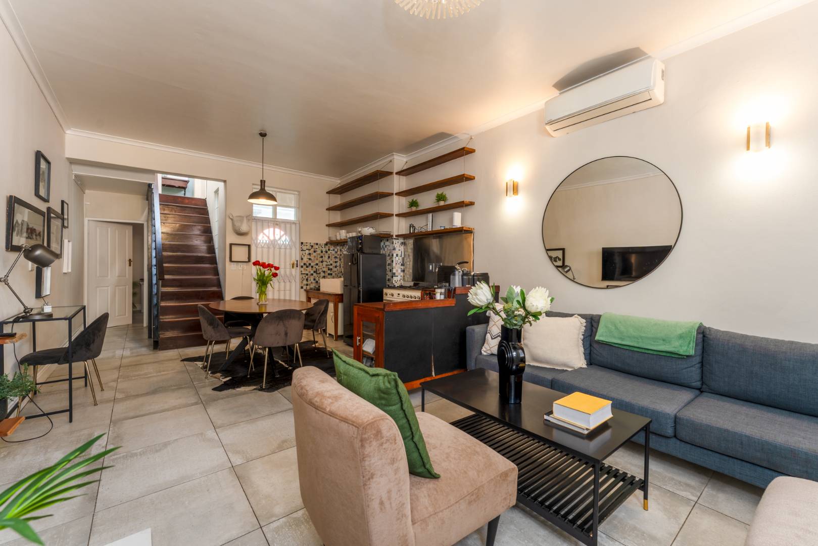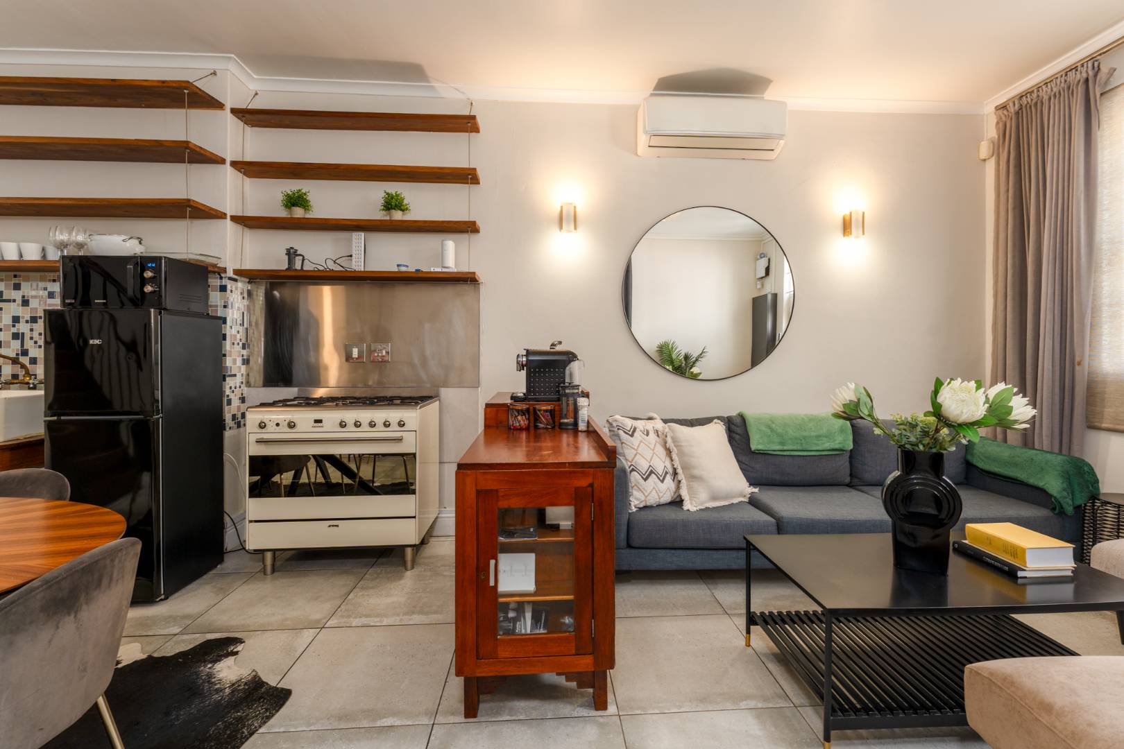 The open-plan lounge, dining, and kitchen area is warm and inviting — featuring a cosy wood-burning fireplace, modern air-conditioning, and tiled flooring that flows seamlessly throughout. The kitchen is both stylish and functional, with open shelving, a freestanding gas stove, and mosaic backsplash. Clever use of space includes a fitted washing machine and dryer neatly tucked under the staircase.
