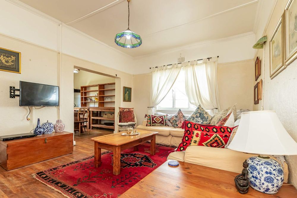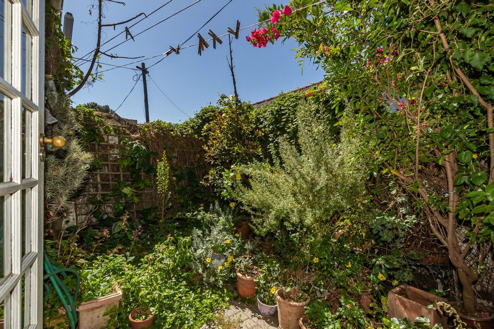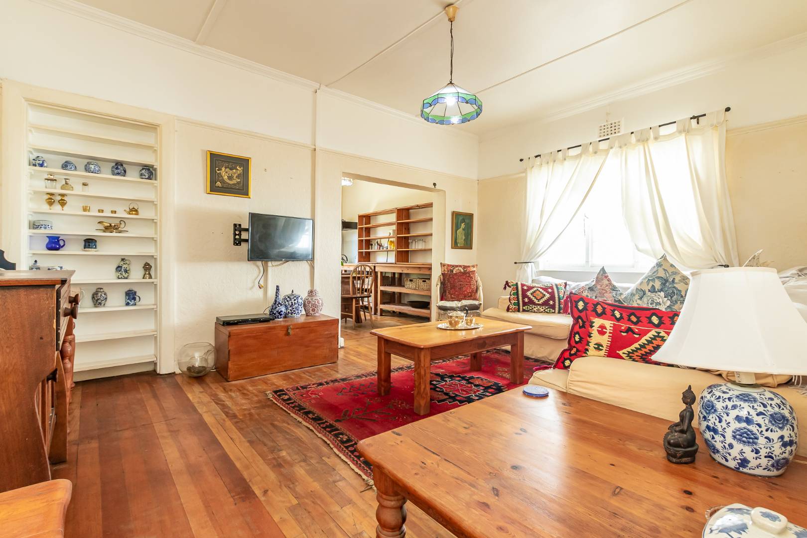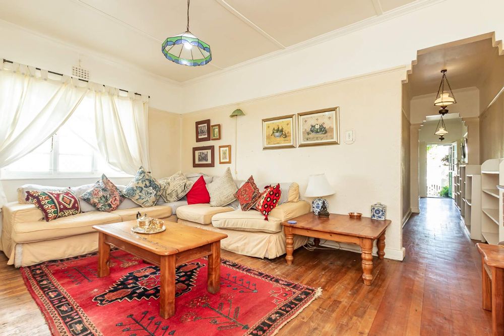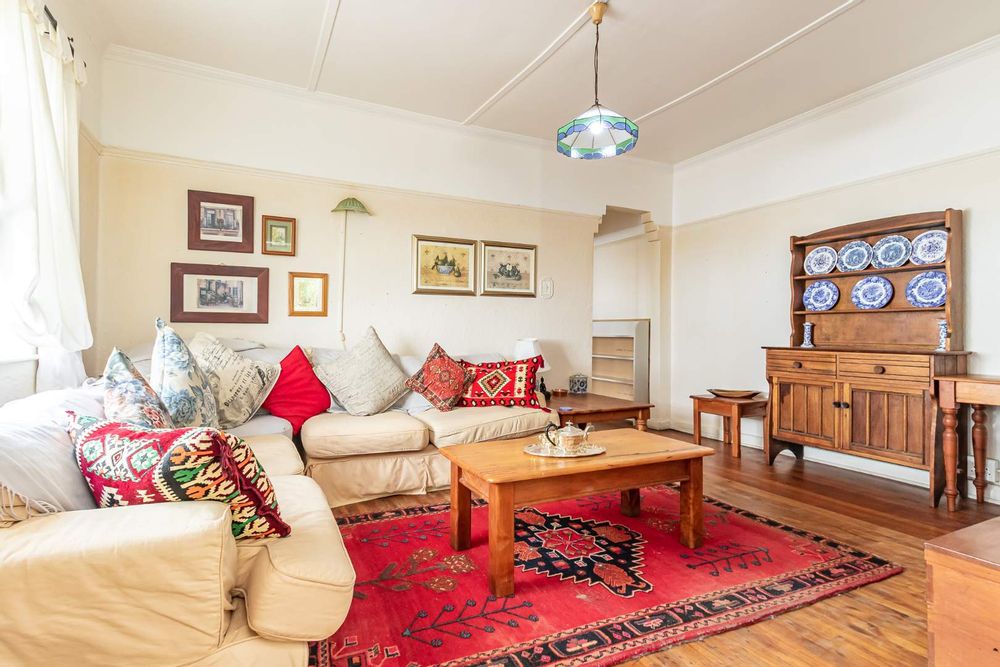 Sunny lounge, open plan to kitchen with doors leading to courtyard.