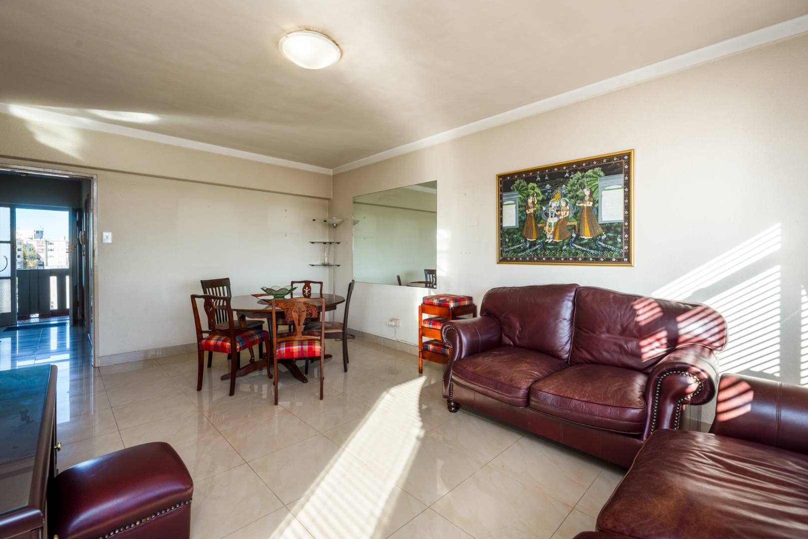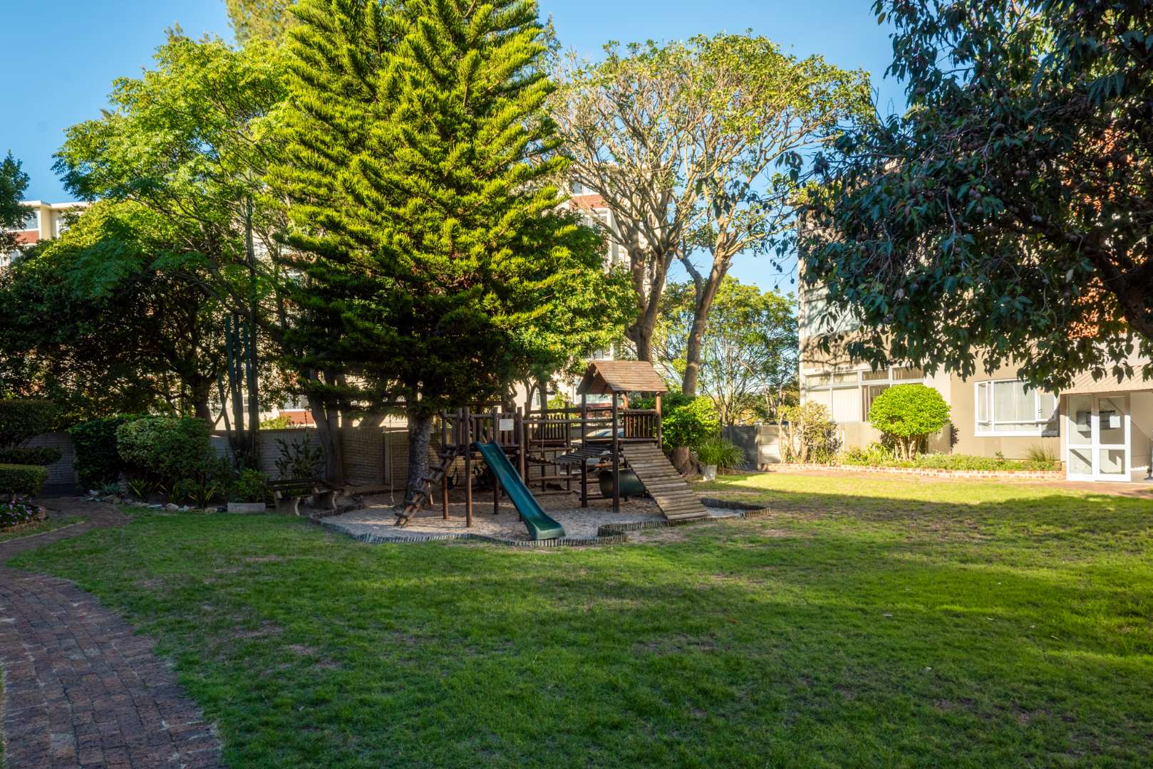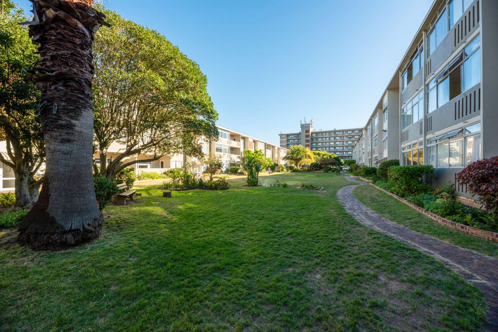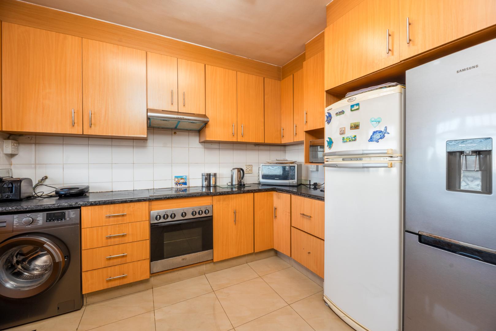 Neat well appointed flat with tiled open plan lounge/dining area. Access to a north facing balcony from both the lounge and bedroom. Three spacious bedrooms with generous built in cupboards. Well equipped kitchen plumbed for dishwasher, washing machine and space for a tumble dryer. Sufficient size opening for a double door fridge/freezer. An under counter oven with a glass top hob and extractor fan. Additional study for work from home situation. Large ground for children to play in. Stunning mountain views. One parking bay and ample unreserved off street parking.