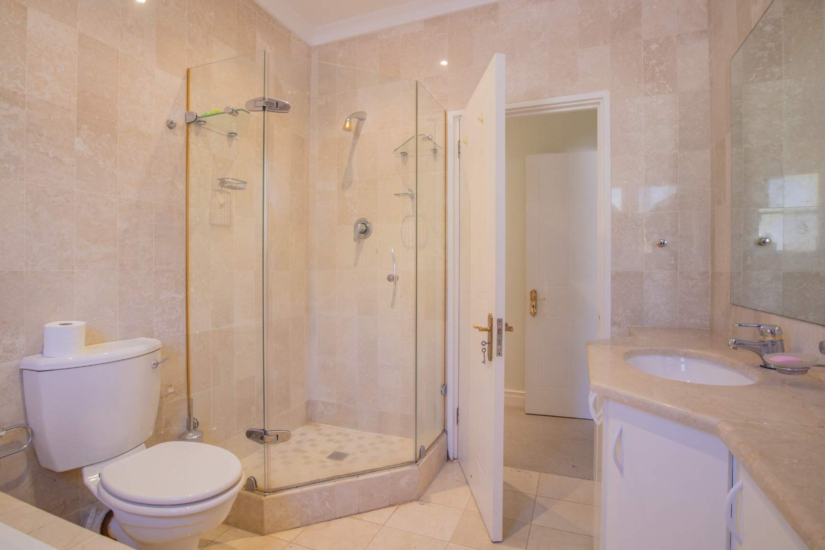 The ground floor also includes a separate study with ample built-in cabinetry, a guest cloakroom, and a generous storage room tucked beneath the staircase. Security is paramount with CCTV cameras, an alarm system, and electric fencing securing the property. The double automated garage includes additional built-in storage, while off-street parking can easily accommodate two to three additional vehicles. A wendy house provides convenient outdoor storage, and an external domestic suite with en-suite bathroom and built-in cupboards completes the lower level.