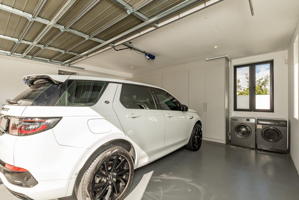Conveniently, the scullery provides access to the garage, which can fit 2 sizable cars. Additionally, the garage has been thoughtfully designed to include a laundry area, with plumbing for both a washing machine and a tumble dryer.