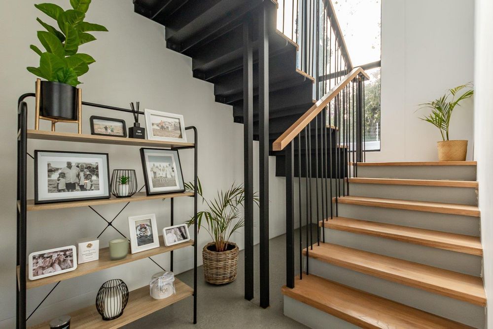The signature wooden and steel staircase leading to the second floor features a modern design, providing access to two bedrooms with built-in cupboards.