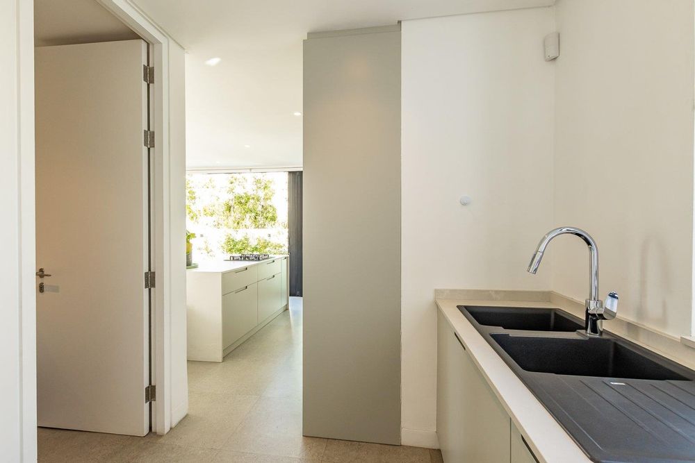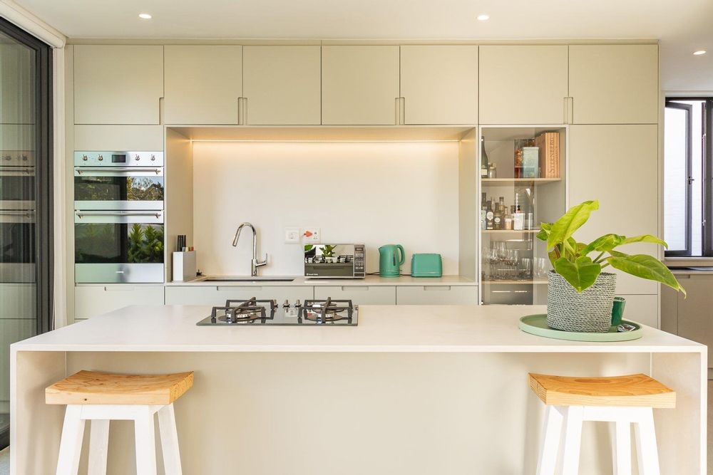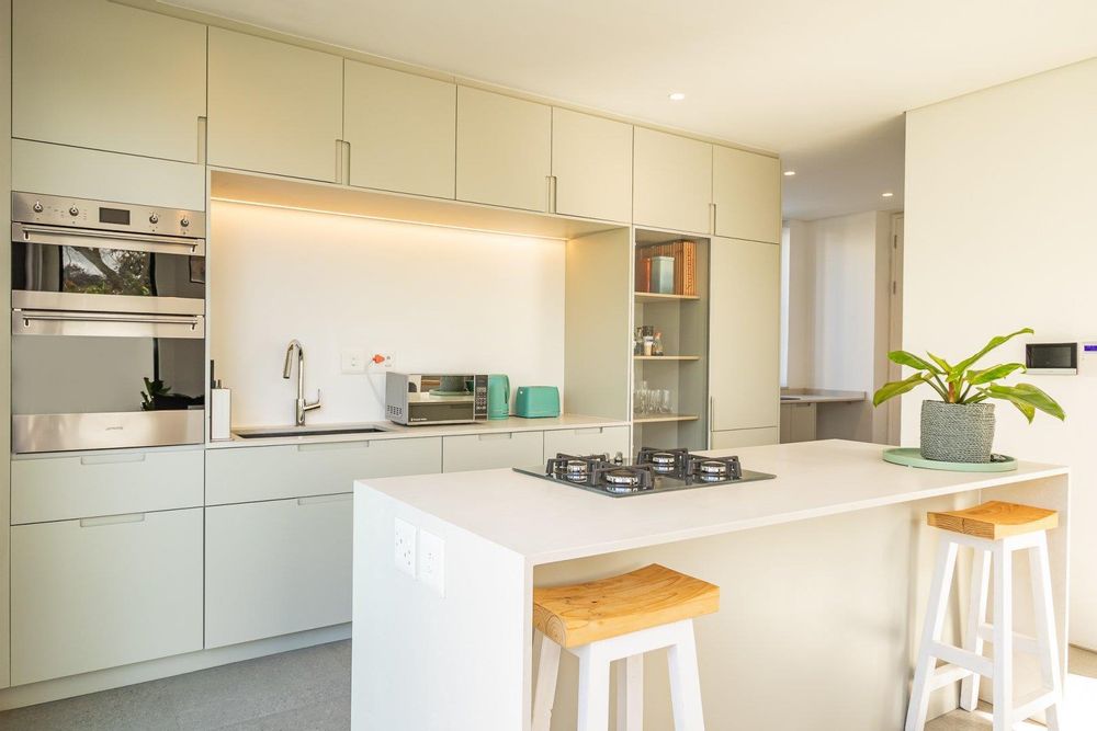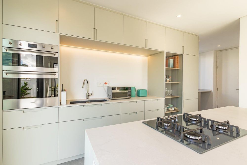 The modern open-plan fully equipped kitchen is cleverly designed with Caesar stone countertops and a spacious island that comfortably seats 4 people.