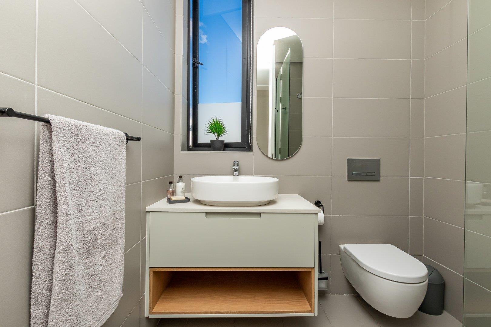 These bedrooms share a bathroom complete with a shower, basin, and toilet.