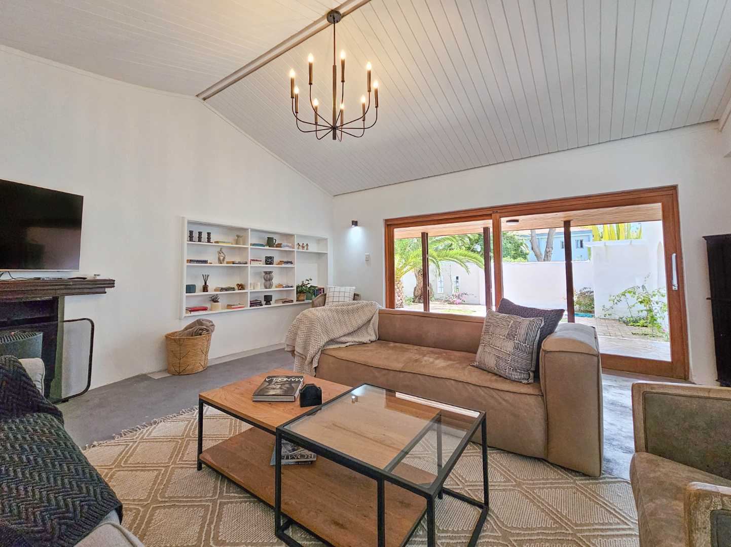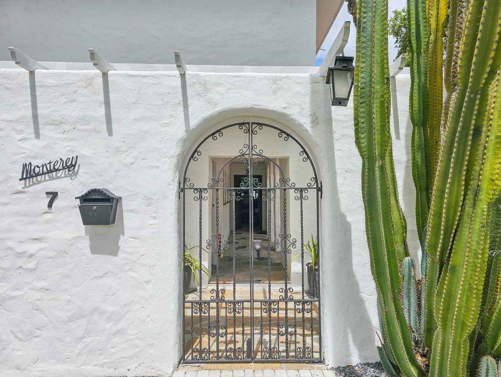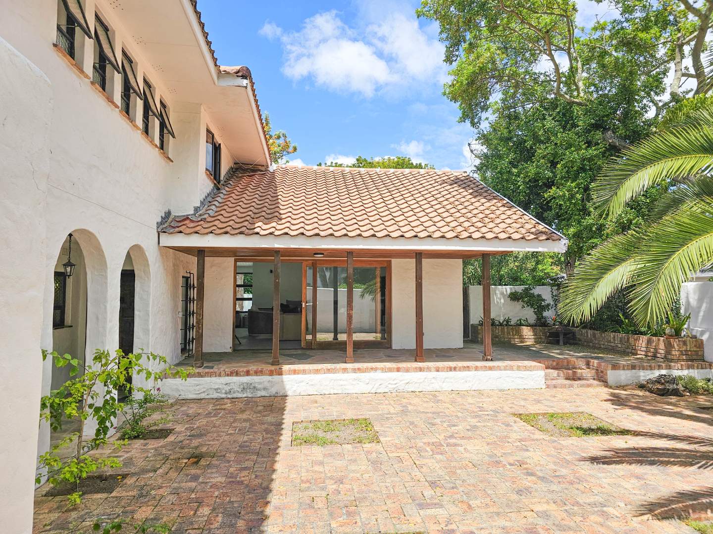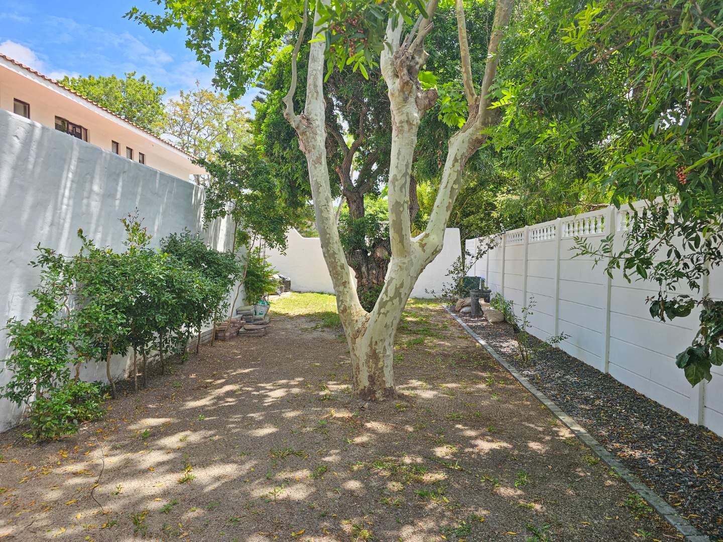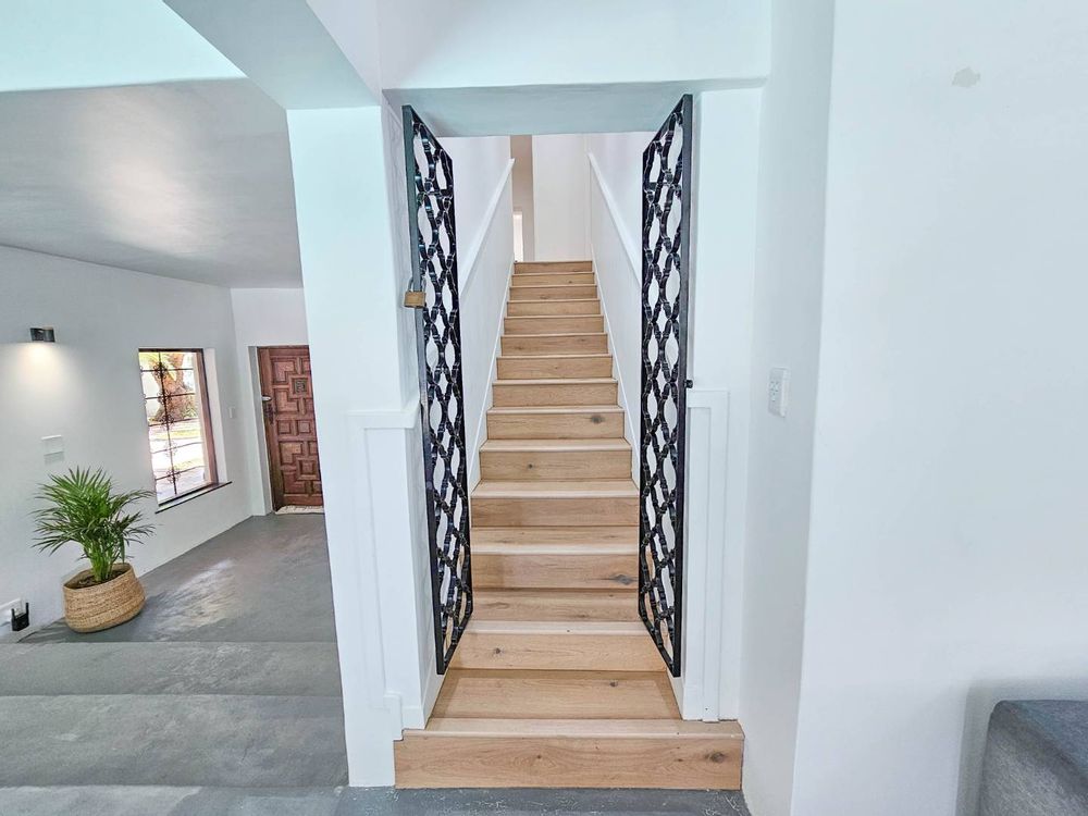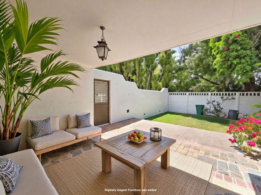 The double garage has a door into a covered walkway, so you won’t get wet bringing in your groceries. The house is in a safe, quiet neighbourhood with a very active crime watch. In the large back garden, you will find a sparkling pool with trendy black and white tile, tall trees, and a covered patio with braai. With its classic white walls and black trim this house has a traditional feel with Spanish style accents.