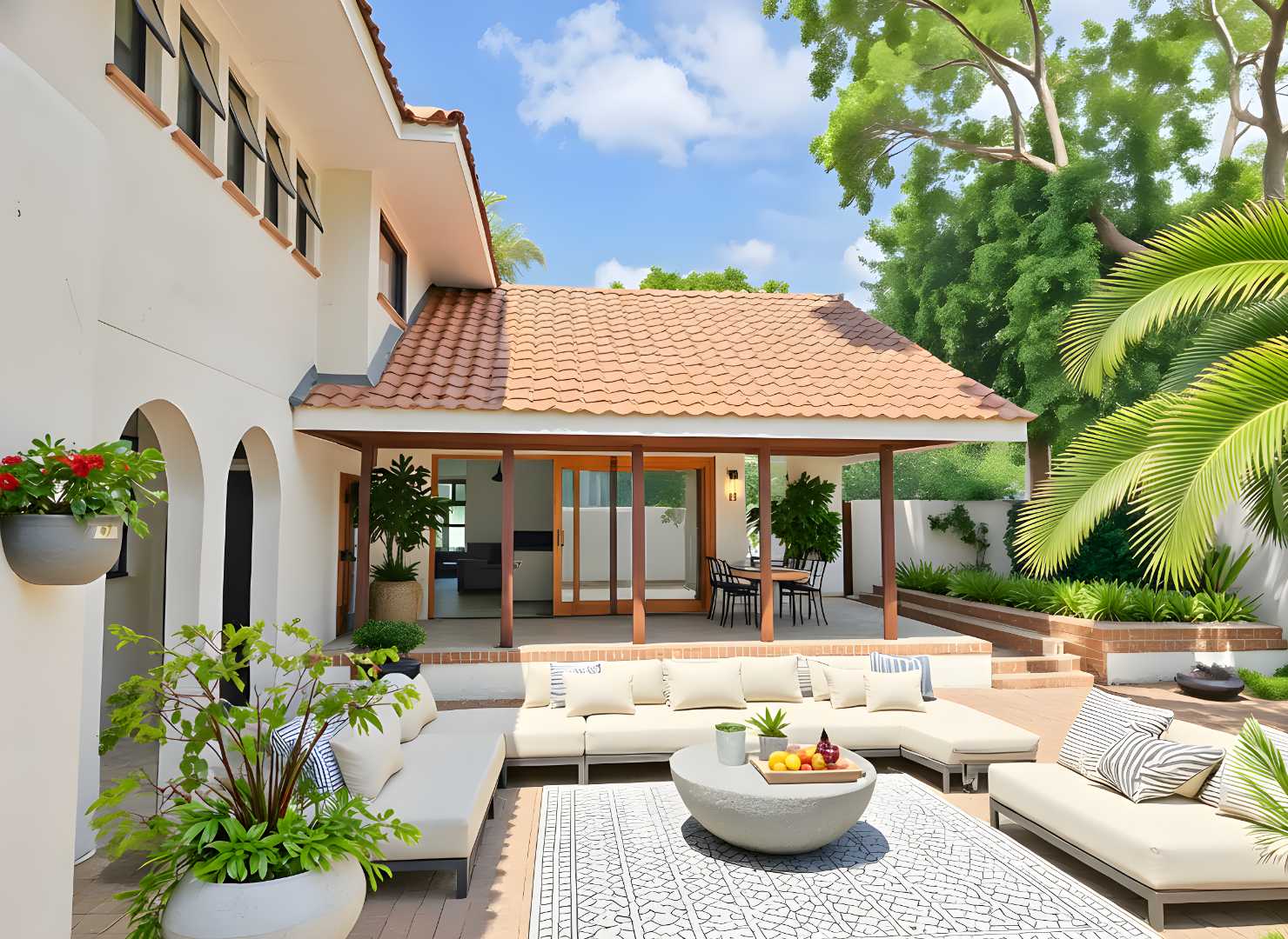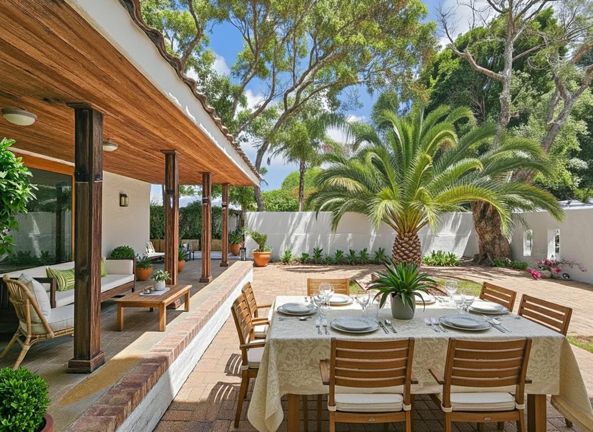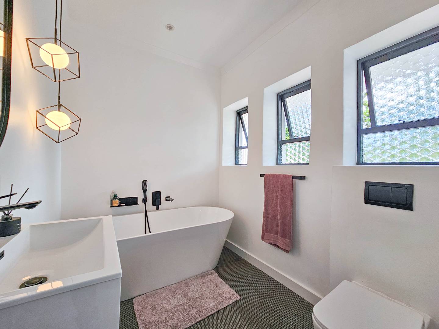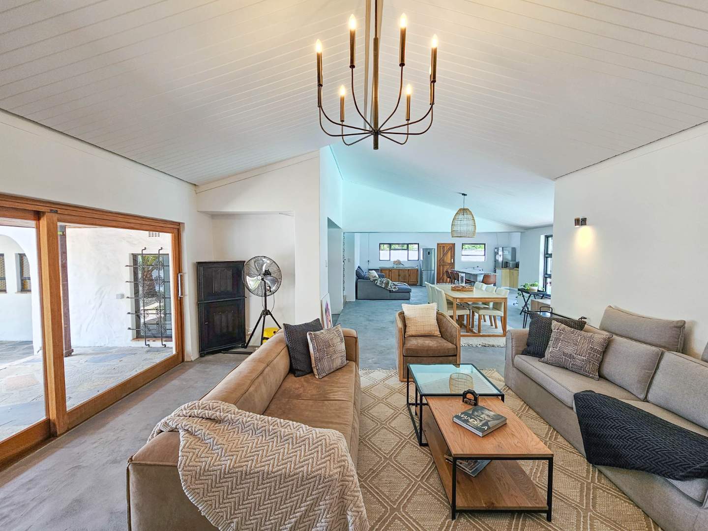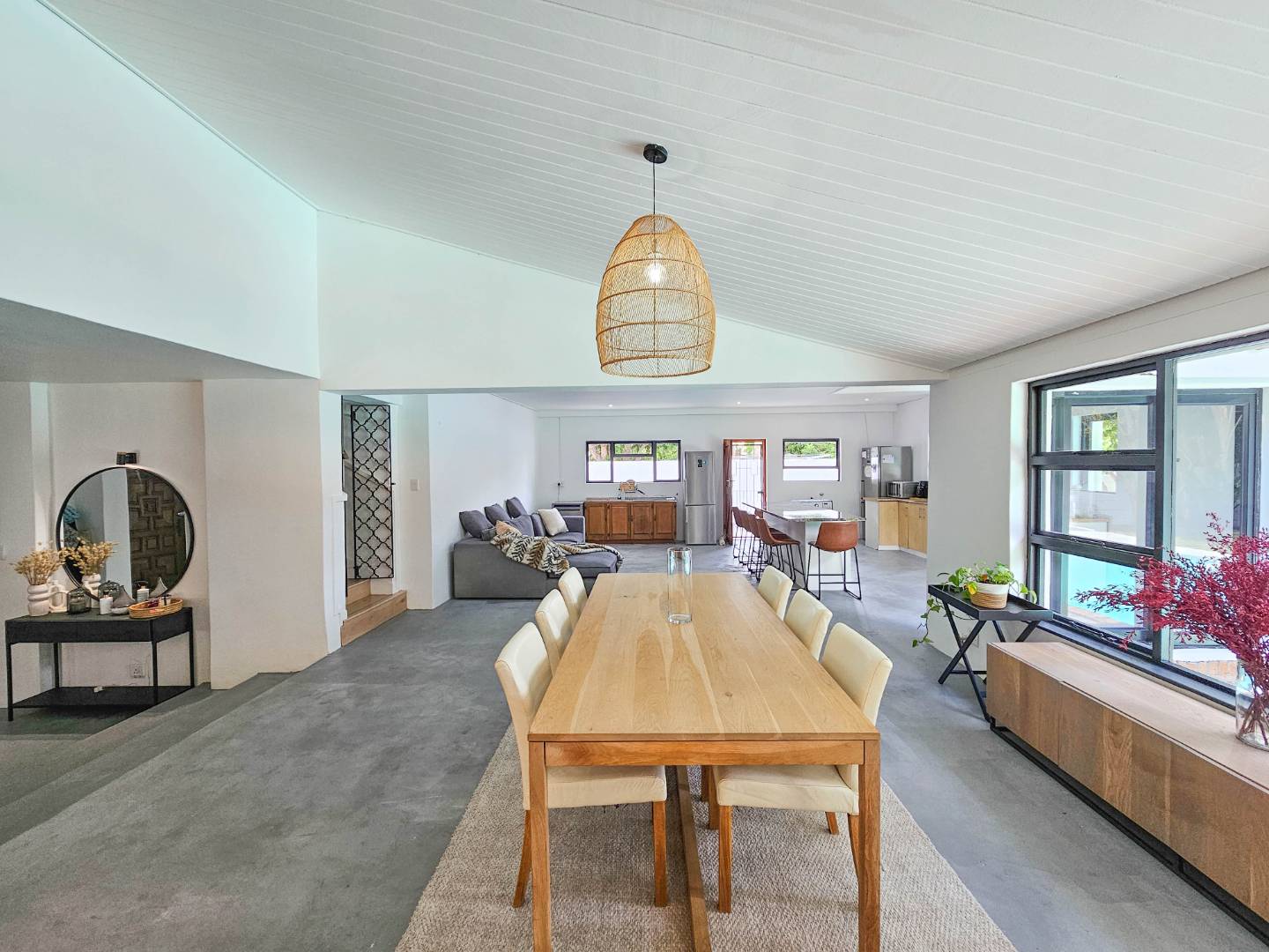 The double garage has a door into a covered walkway, so you won’t get wet bringing in your groceries. The house is in a safe, quiet neighbourhood with a very active crime watch. In the large back garden, you will find a sparkling pool with trendy black and white tile, tall trees, and a covered patio with braai. With its classic white walls and black trim this house has a traditional feel with Spanish style accents.