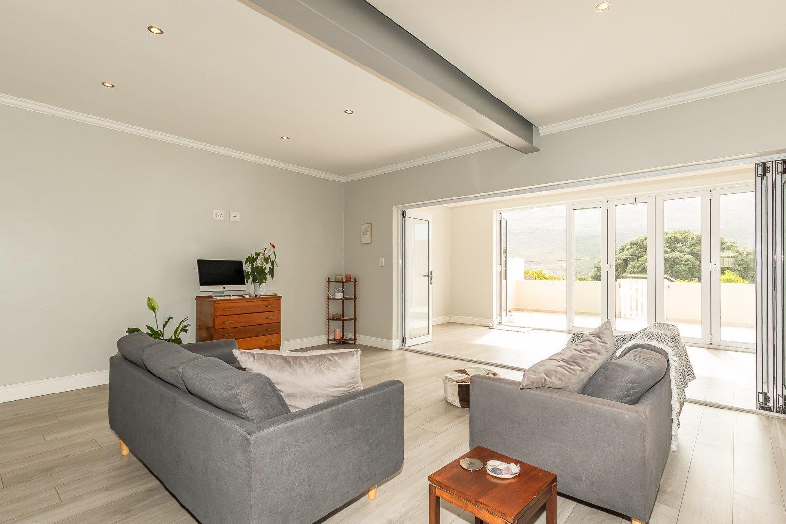 The home features 3 bedrooms, as well as 3 bathrooms, all being en suite. The bedrooms are situated upstairs of the unit. The main bedroom has stacking doors leading out onto a large balcony with beautiful mountain and sea views. The living area is situated on the main level of the property which has an enclosed built-in braai area for entertainment and an open plan living area, lounge, dining room, and kitchen with stylish finishes and space for 2 appliances. In addition, there is a separate guest bathroom and a sizable garden with direct access to the road. A storeroom as well as a Jojo tank. Double automated garage and extra parking. The sectional title has automated gates and only consists of 2 units.