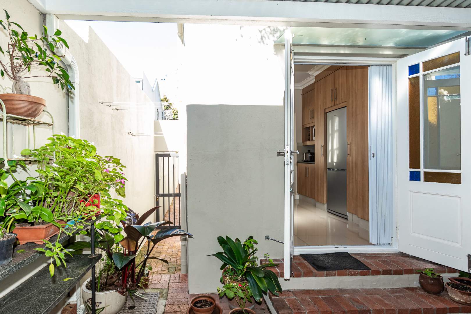 This pristine house comprises 2 bedrooms, 1 bathroom, small office/study space, lounge/dining area, modern open plan kitchen with granite kitchen tops, glass top stove with oven, and a neatly enclosed cupboard space for a washing machine and tumble dryer. The kitchen has double doors leading out onto a totally private undercover entertainment patio/conservatory providing a peaceful retreat. Access this smaller home from the street level onto a brickpaved courtyard with security doors leading into a tiled entrance hall. This property offers excellent security viz security doors, burglar alarm and outside beams.