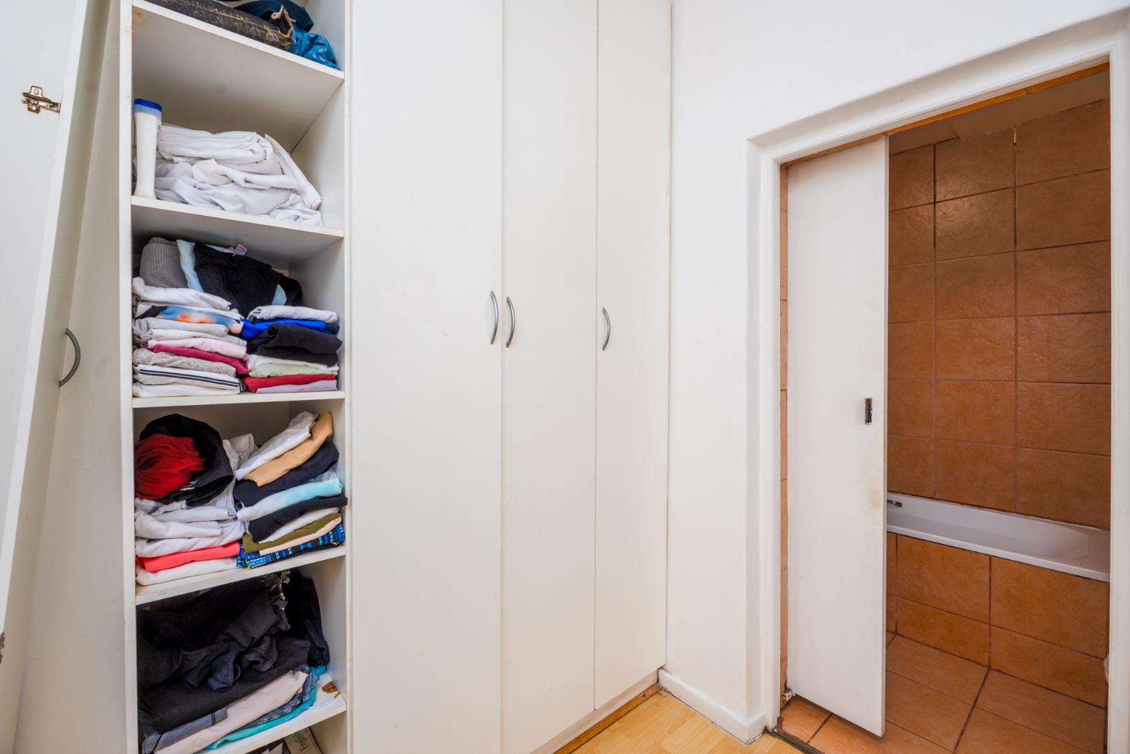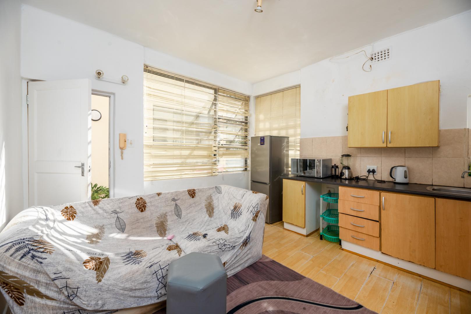 The open plan lounge and kitchen create a seamless flow, making the space feel inviting and practical. The bedroom features built-in cupboards and an ensuite bathroom with a shower, bath, basin, and toilet.