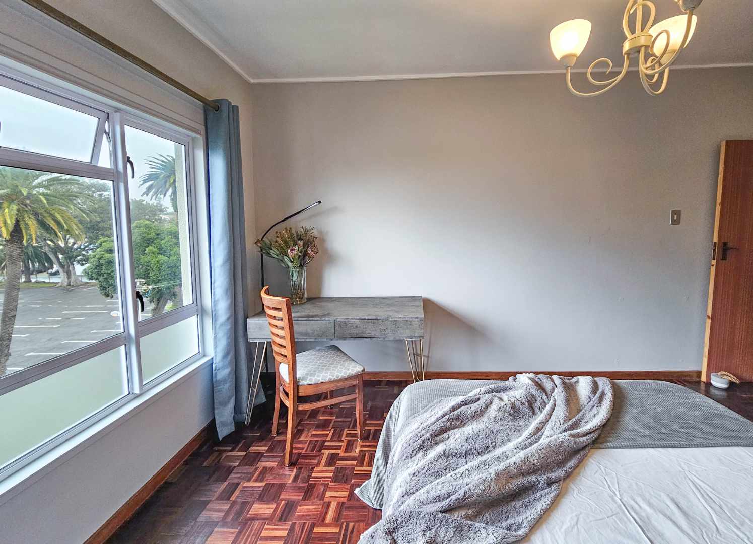 The sunny kitchen has space for all appliances with plenty of cupboards and counter space. The apartment includes a secure parking bay.