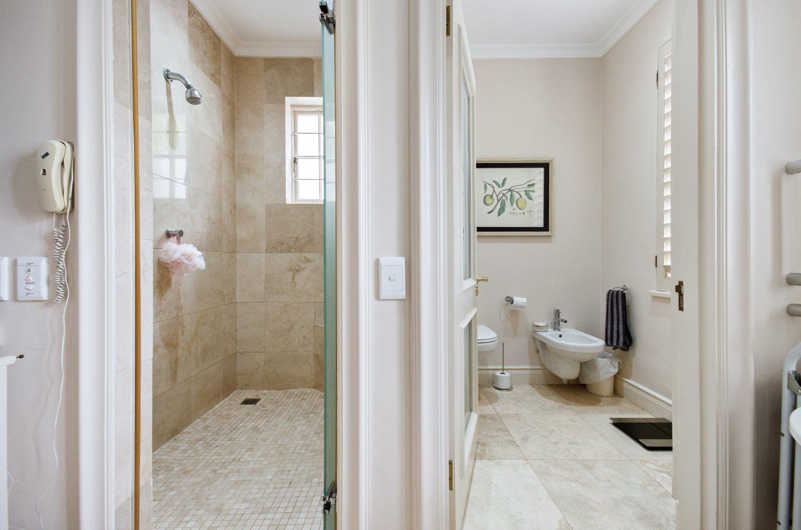 The second bathroom is equipped with a bathtub, shower, toilet, basin, and heated towel rails.