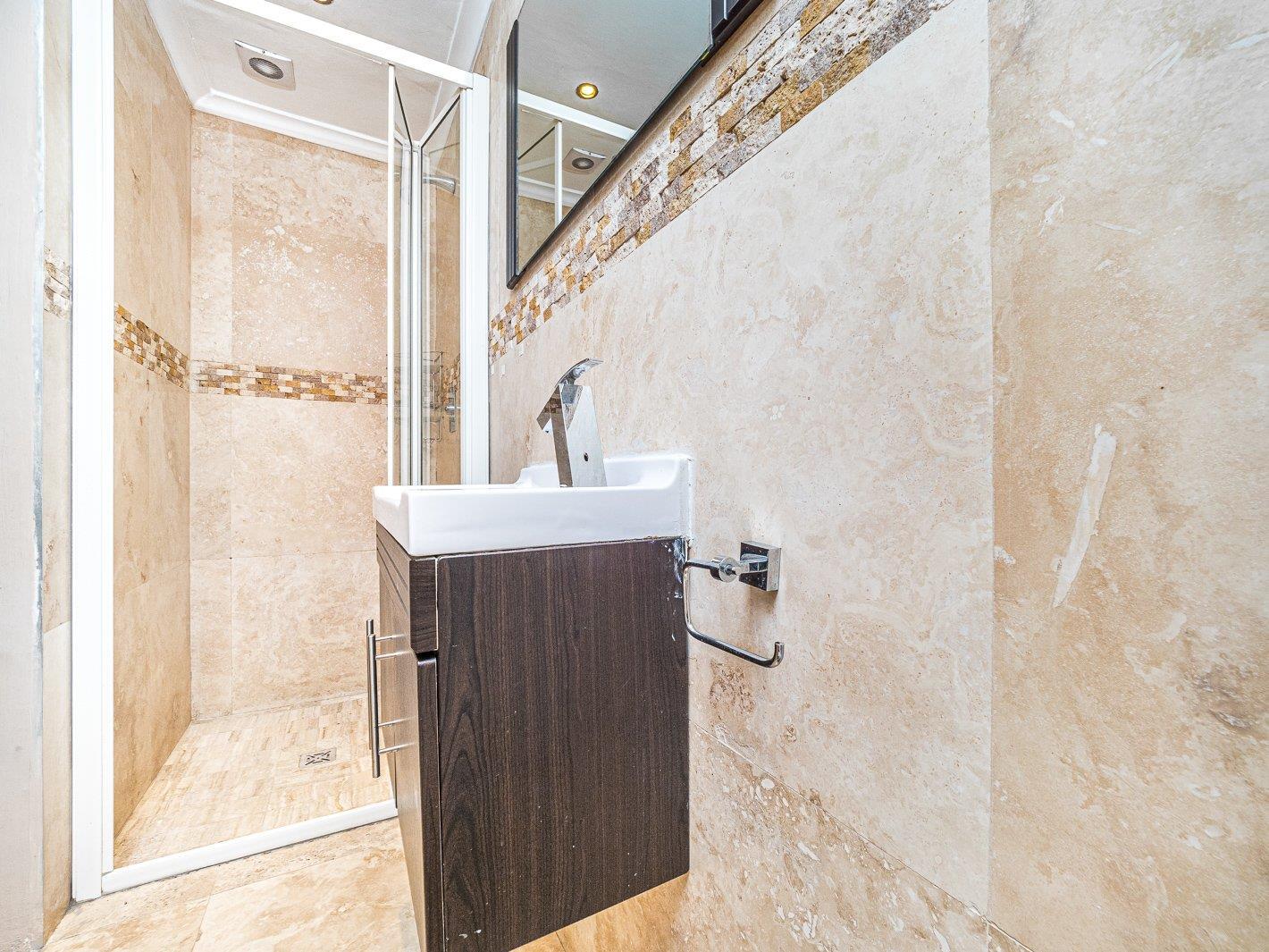 There are 3 spacious bedrooms that have porcelain tiles, one bedroom has an ensuite with shower. There is a family bathroom that has travertine tiles a bath, shower and dual sinks. Also has a private work from home space/study room