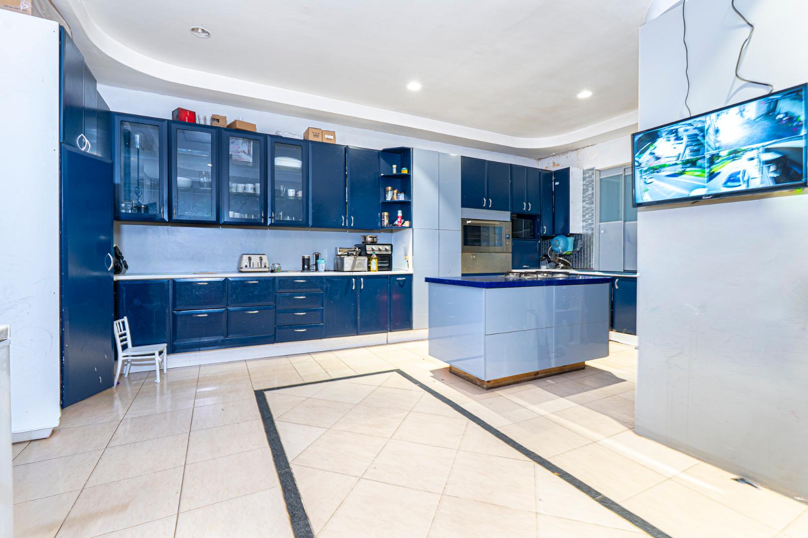 The kitchen is massive and fully fitted with a center island, eye-level oven, gas hob, and space for a double-door fridge. The floors are tiled throughout. The open-plan lounge and dining area feature parquet flooring, high ceilings, a fireplace with modern cladding, and direct access to the double garage.