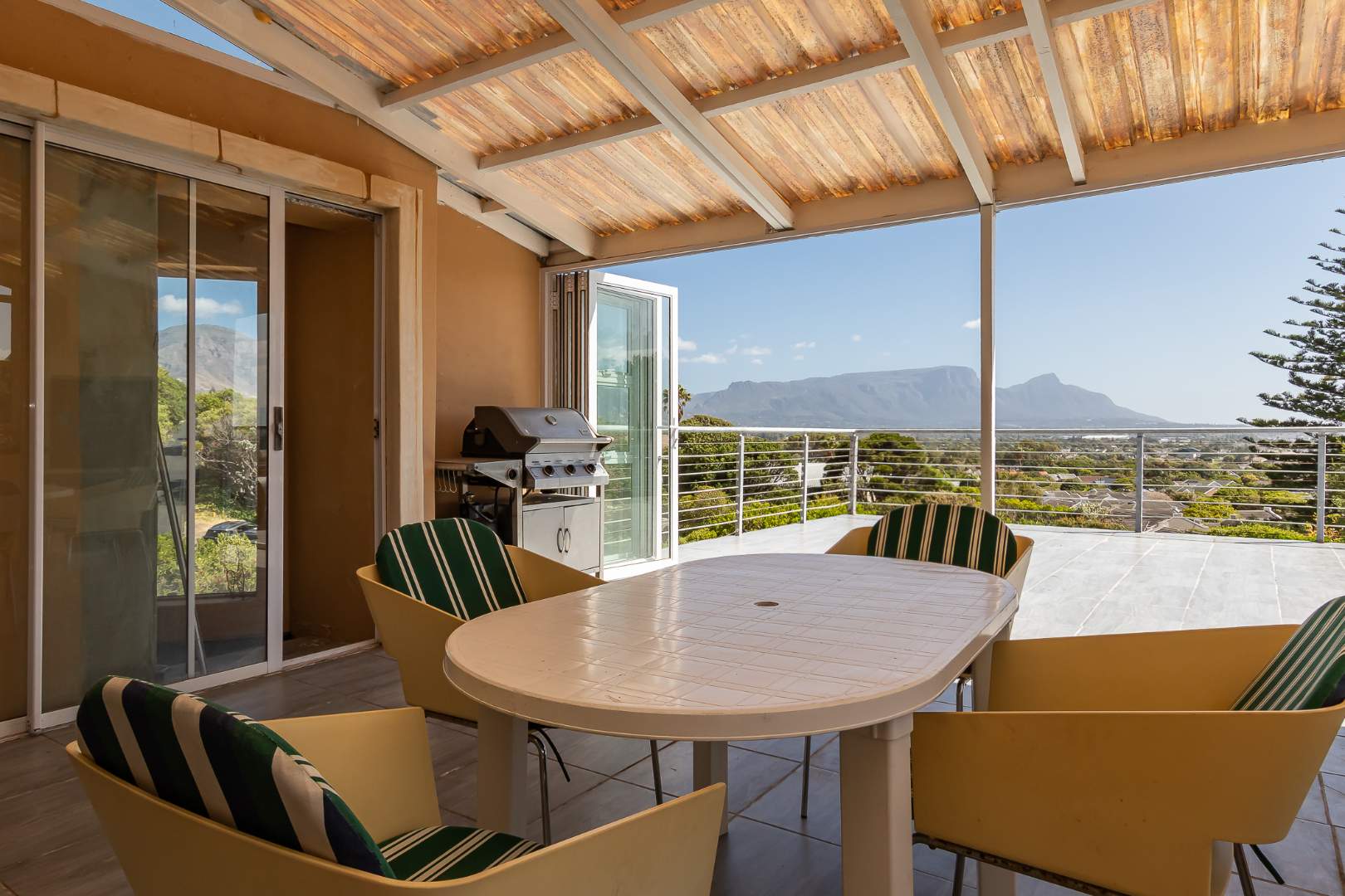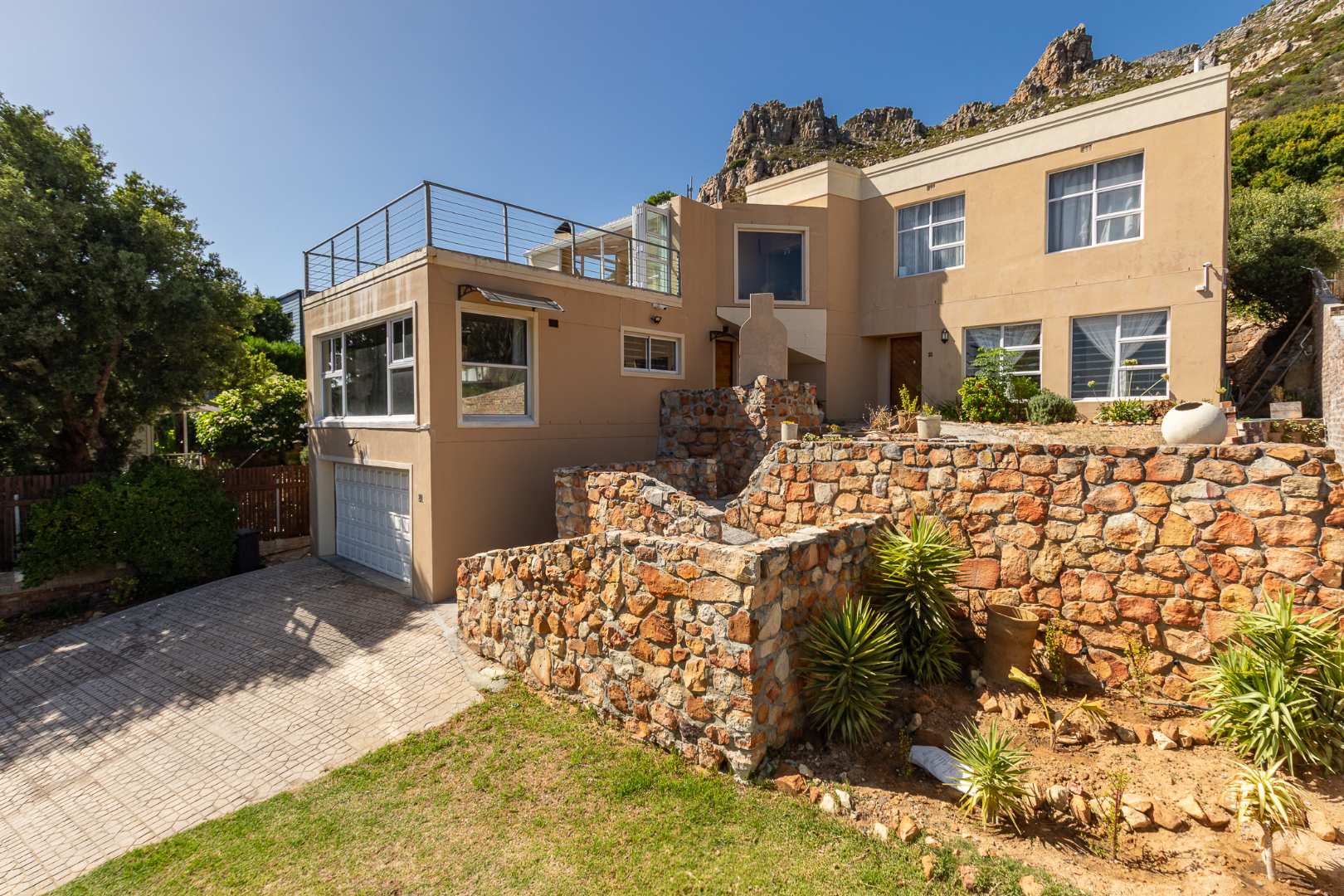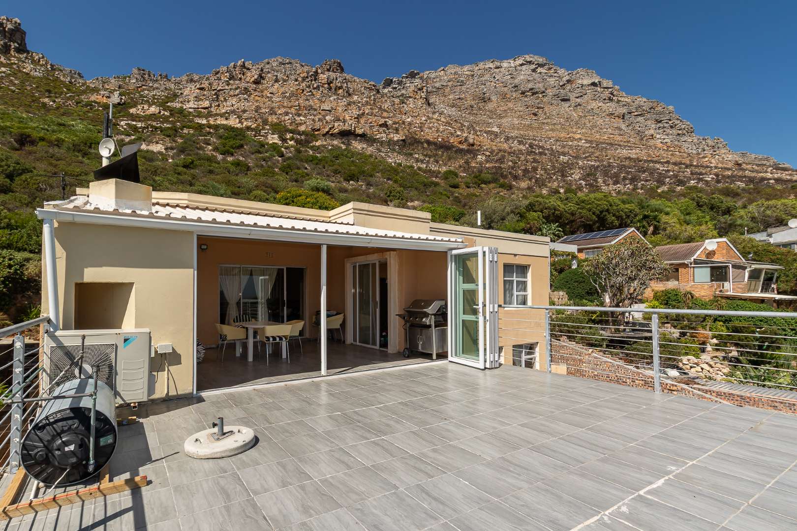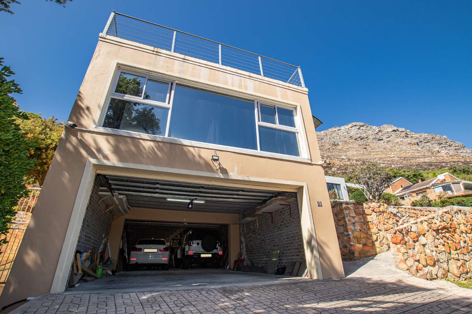 Upstairs on the second floor, the main bedroom offers a dressing room and a full en-suite bathroom. Two additional bedrooms with built-in cupboards enjoy beautiful views. A large family room opens out to the mountain garden, while the impressive entertainment area with built-in braai flows onto a deck showcasing spectacular panoramic views.