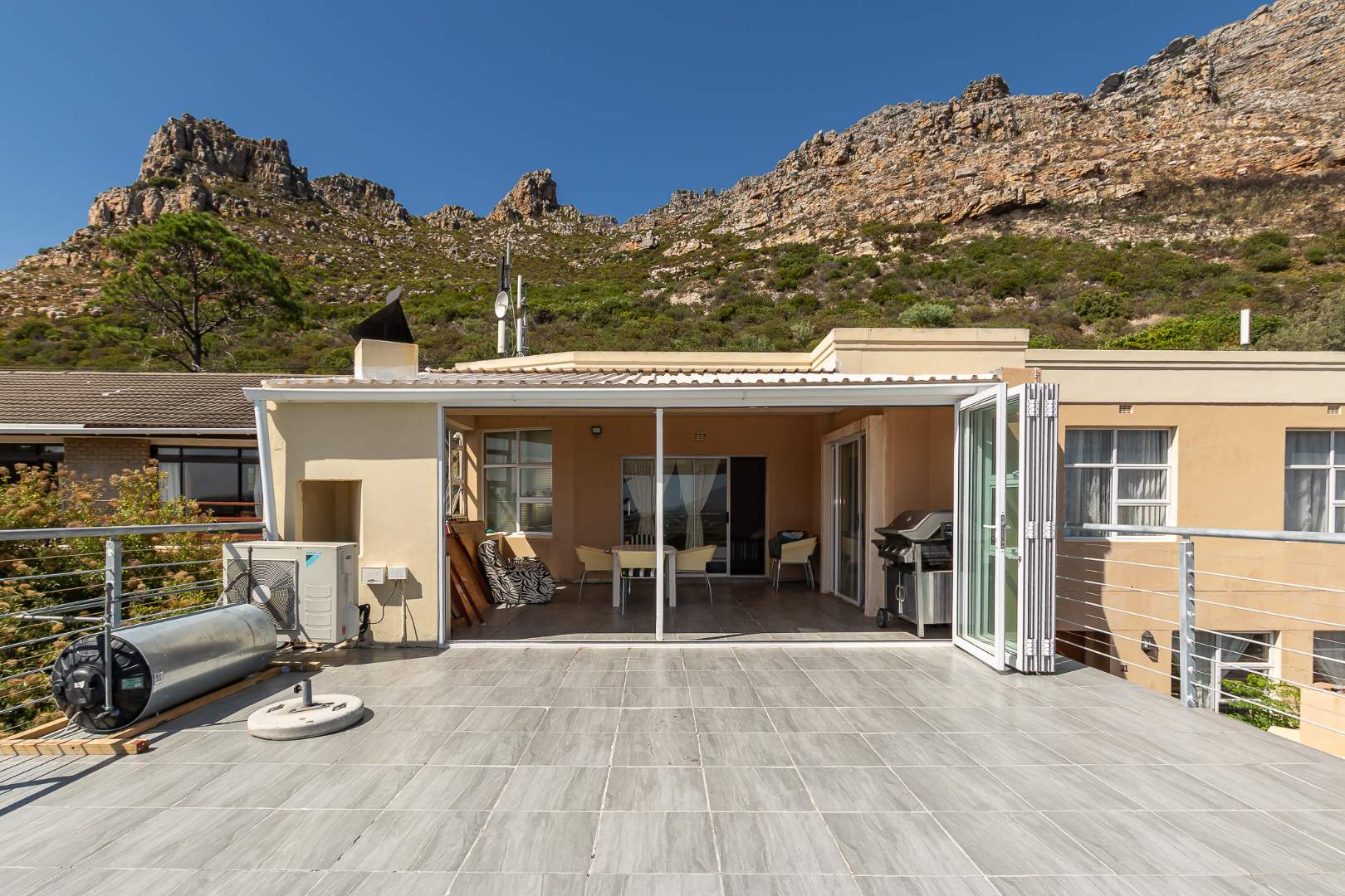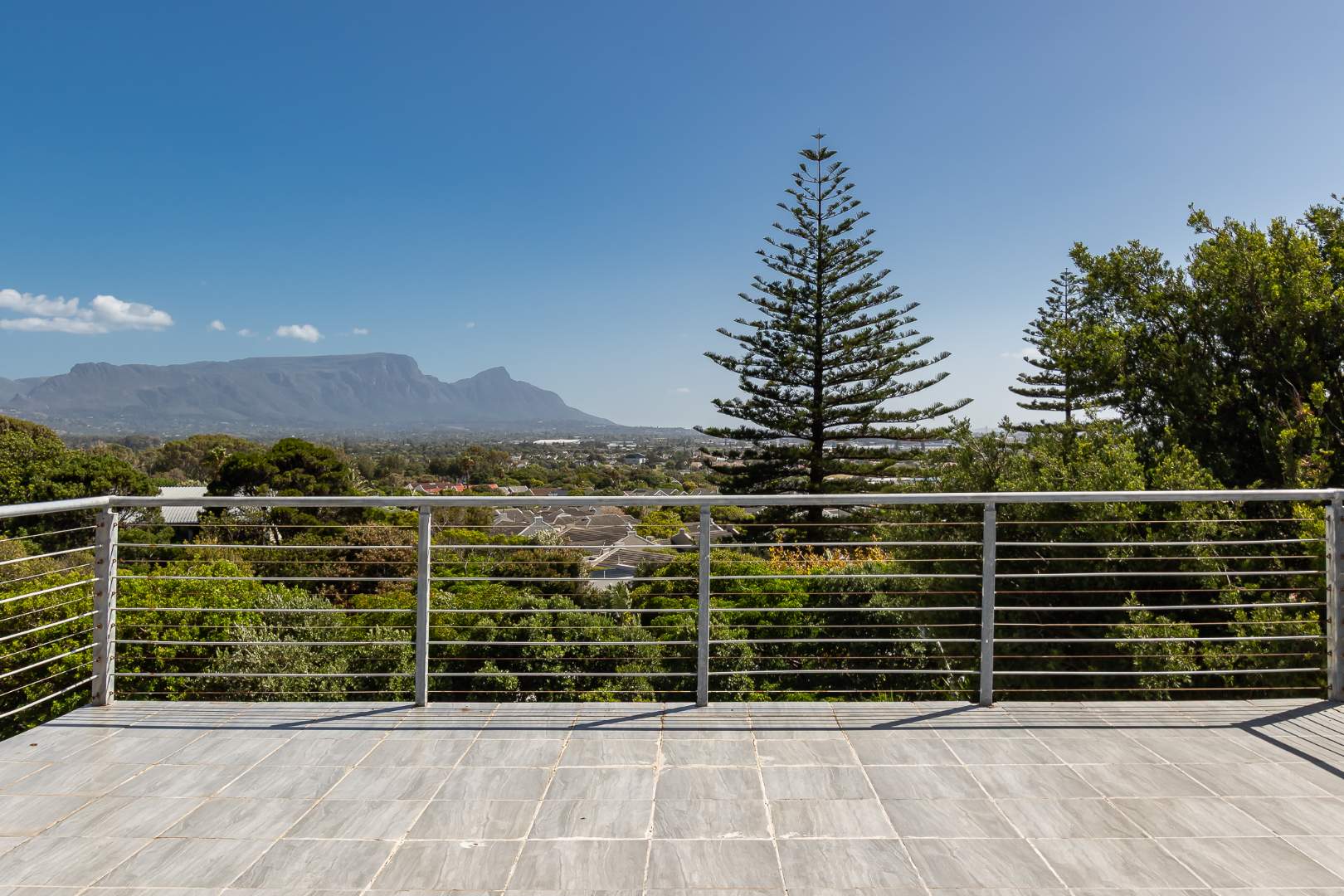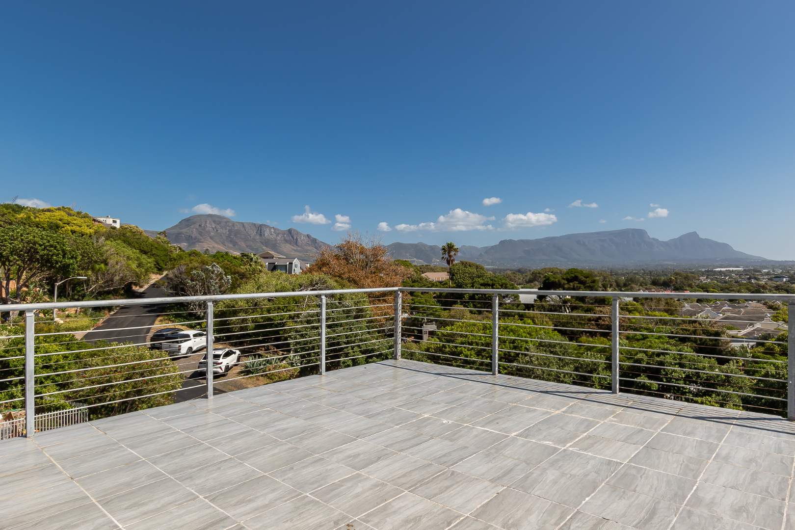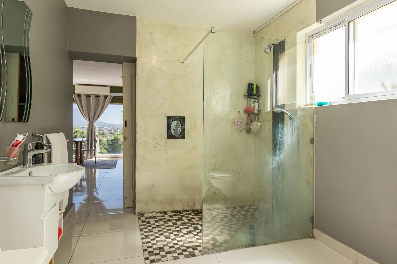 Upstairs on the second floor, the main bedroom offers a dressing room and a full en-suite bathroom. Two additional bedrooms with built-in cupboards enjoy beautiful views. A large family room opens out to the mountain garden, while the impressive entertainment area with built-in braai flows onto a deck showcasing spectacular panoramic views.