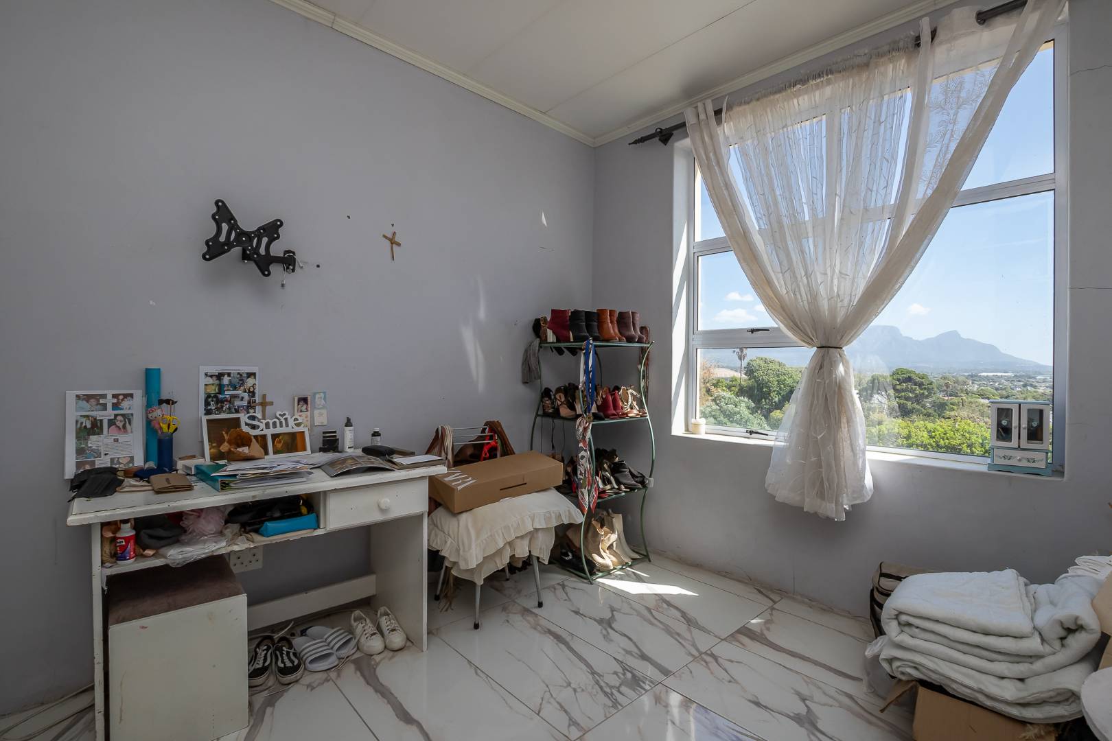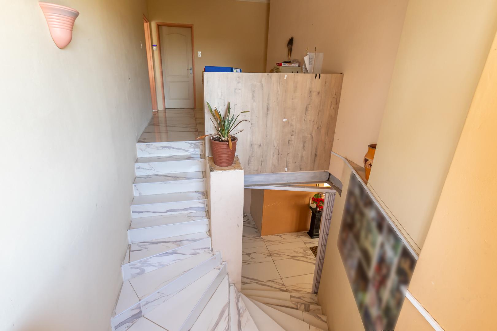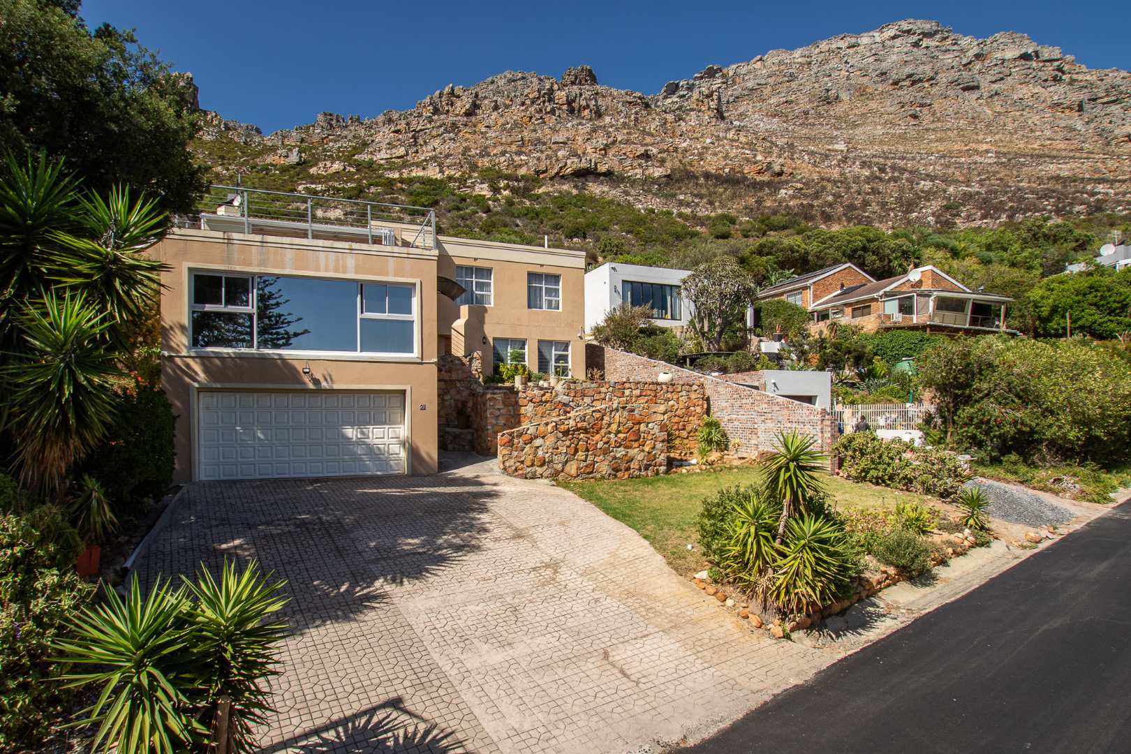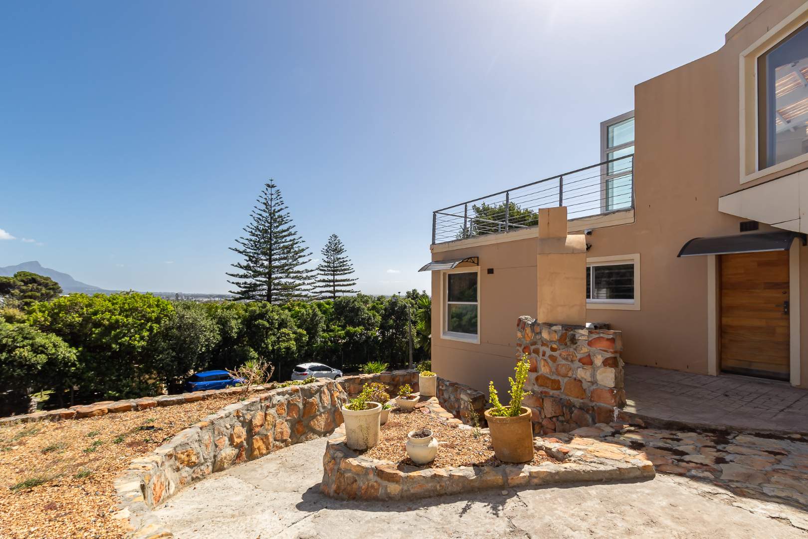 Upstairs on the second floor, the main bedroom offers a dressing room and a full en-suite bathroom. Two additional bedrooms with built-in cupboards enjoy beautiful views. A large family room opens out to the mountain garden, while the impressive entertainment area with built-in braai flows onto a deck showcasing spectacular panoramic views.