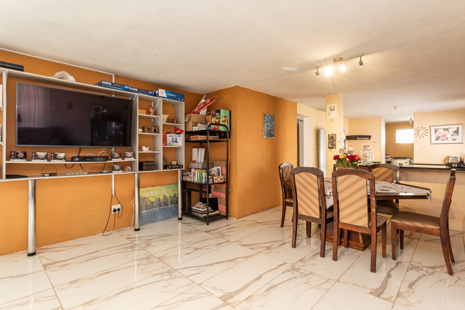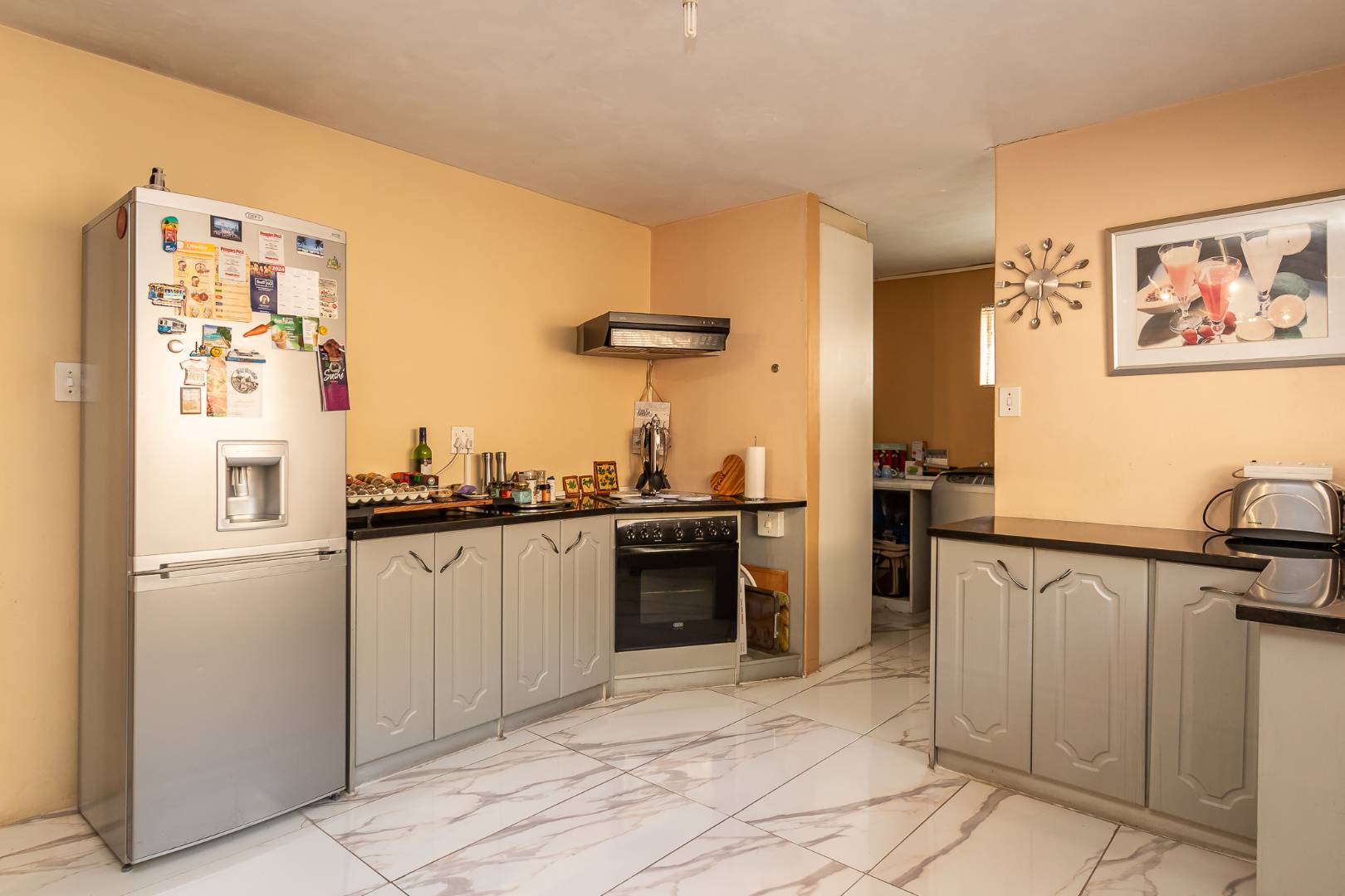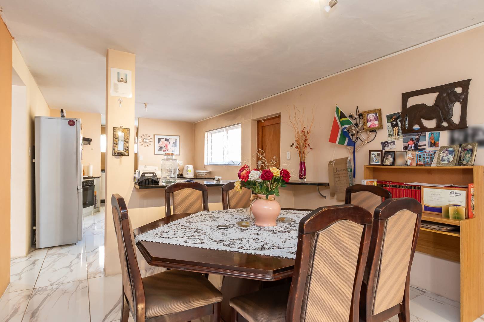 The open-plan dining room flows seamlessly into a well-appointed kitchen featuring an eat-at counter, complemented by a separate scullery and laundry.