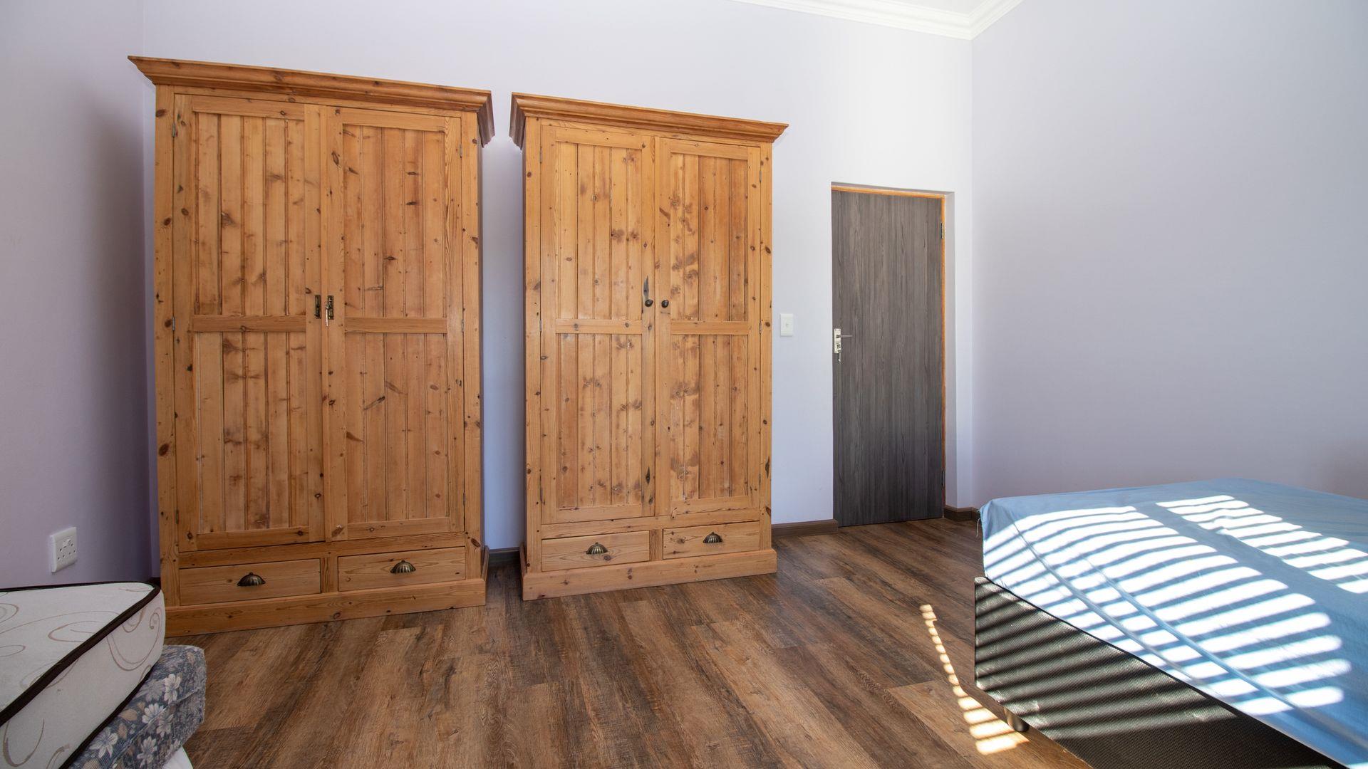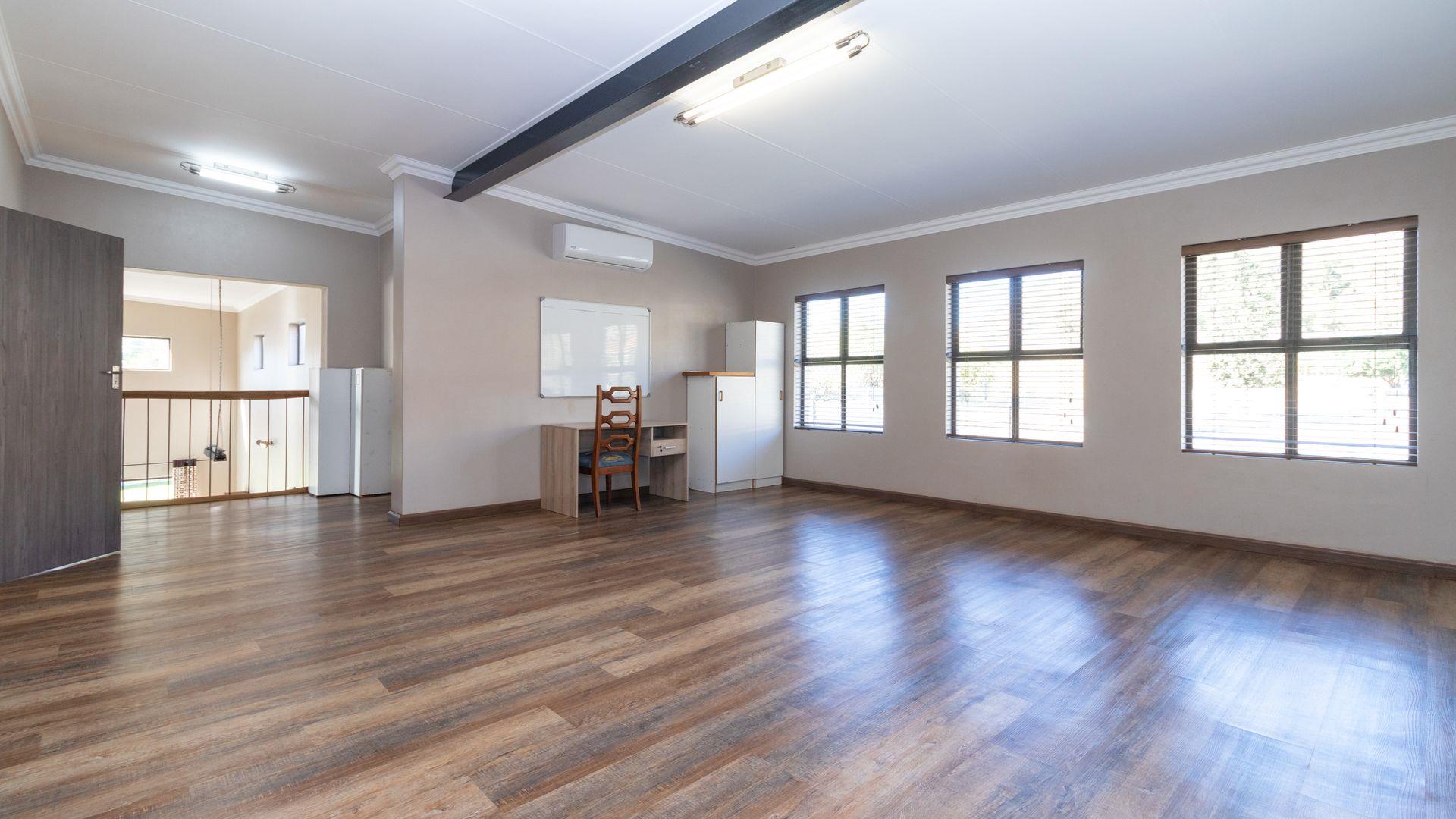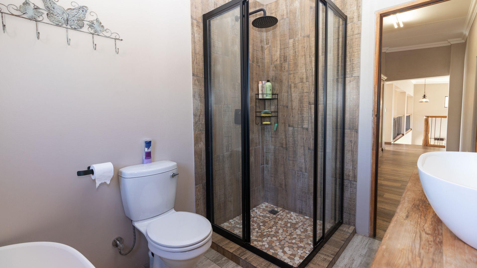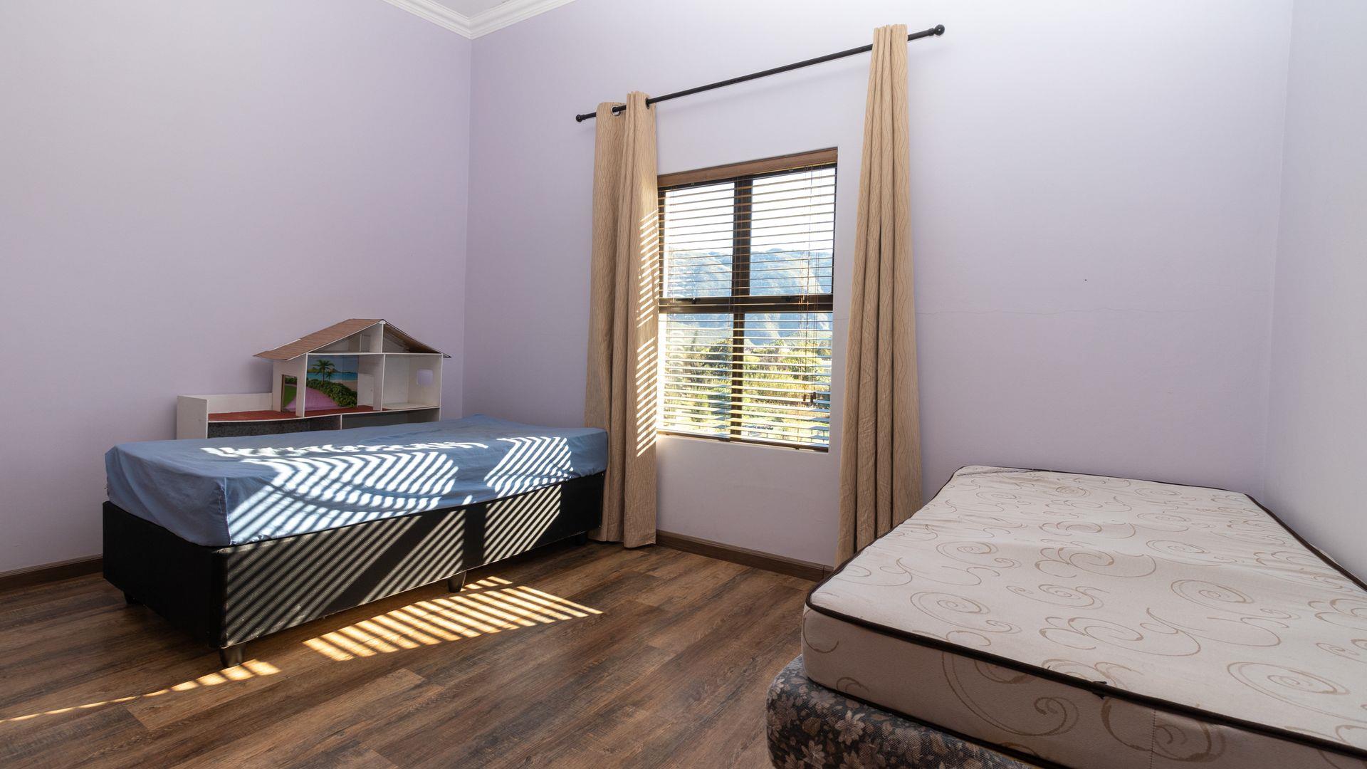Upstairs: Two well-sized bedrooms (one with en suite), an expansive entertainment and living area, and a large patio with built-in braai and sweeping garden and river views.