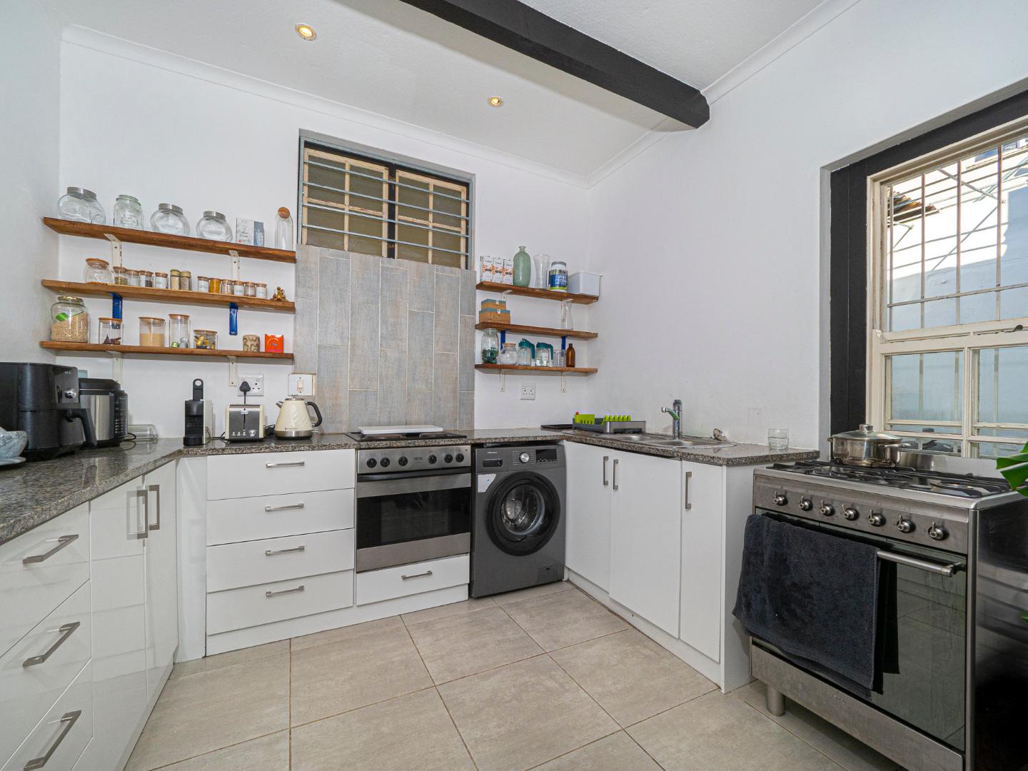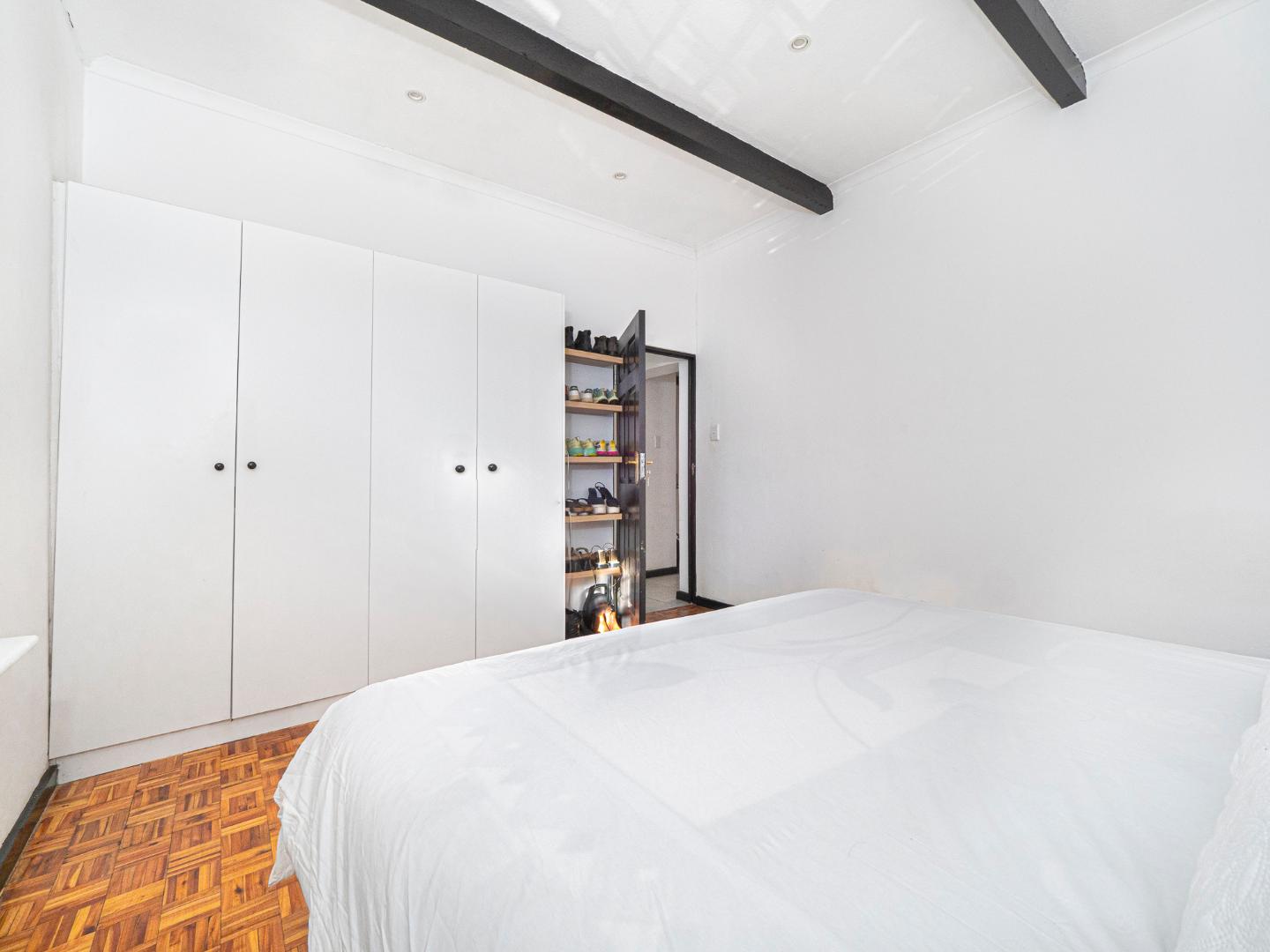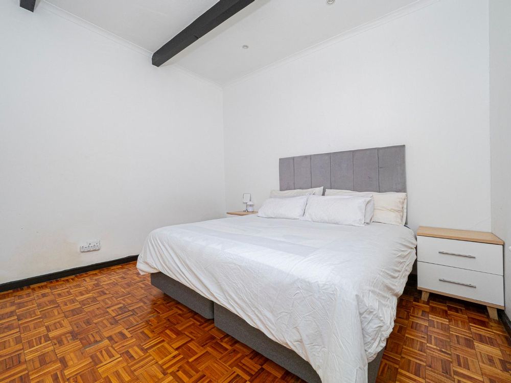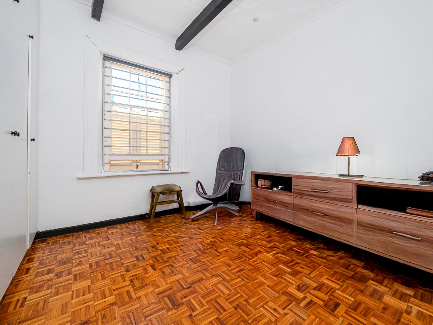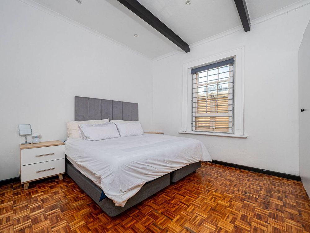 Both bedrooms are spacious with beautiful high ceilings, Oregon wooden floors and Sash windows with shutters as well as burglar bars.