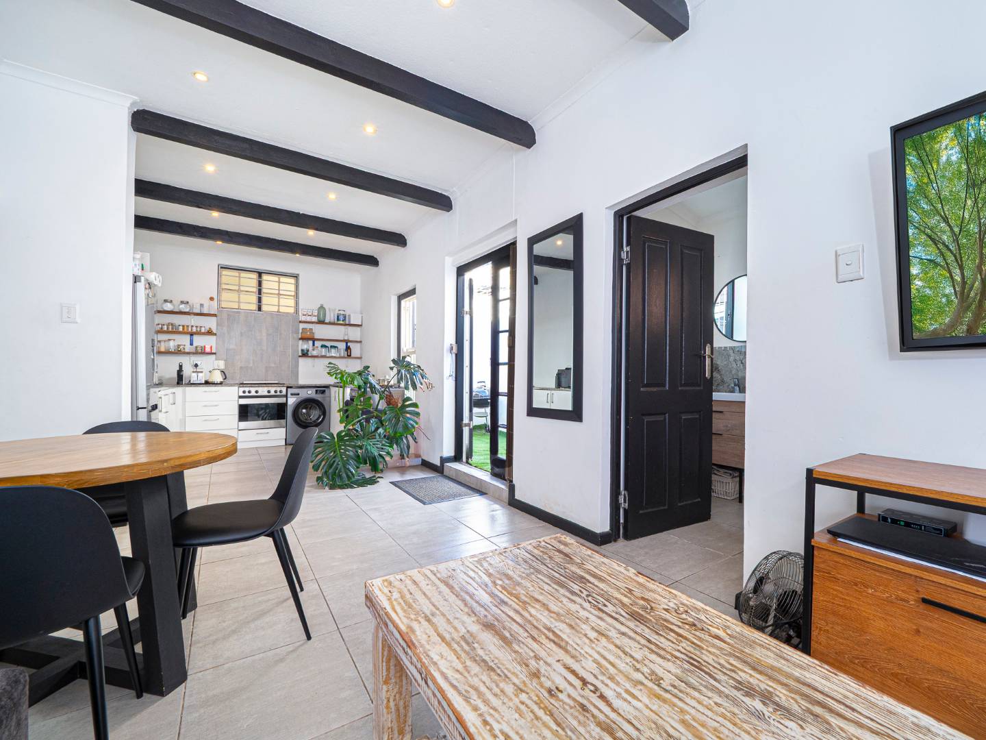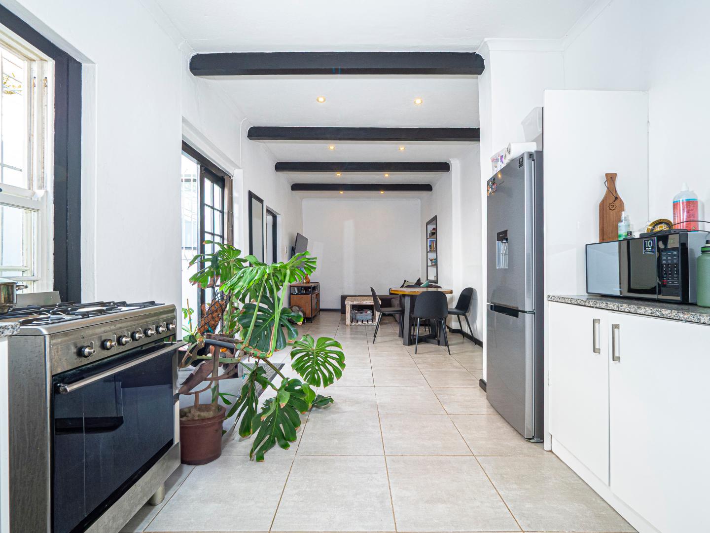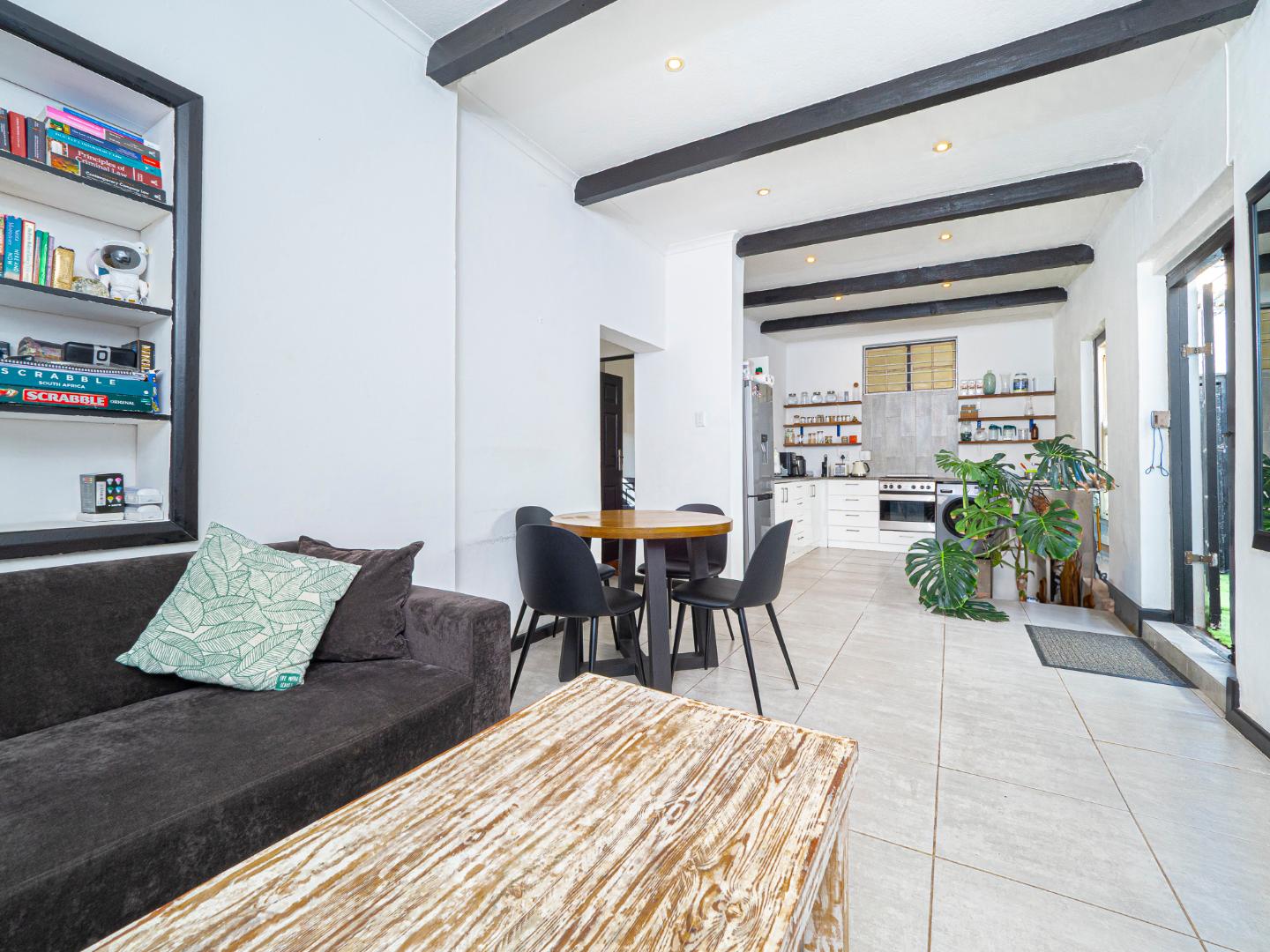 The lounge is open plan and it's tiled with exposed beams and downlights.
