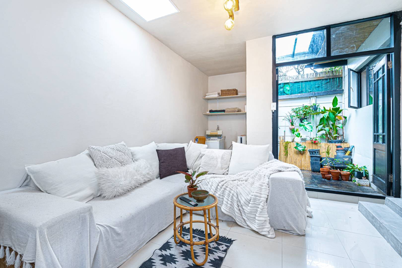 The attractive living room has French- doors that open to a small paved courtyard that leads on to a passageway with an undercover washing line tucked away out of view and links to yet another secluded courtyard garden.