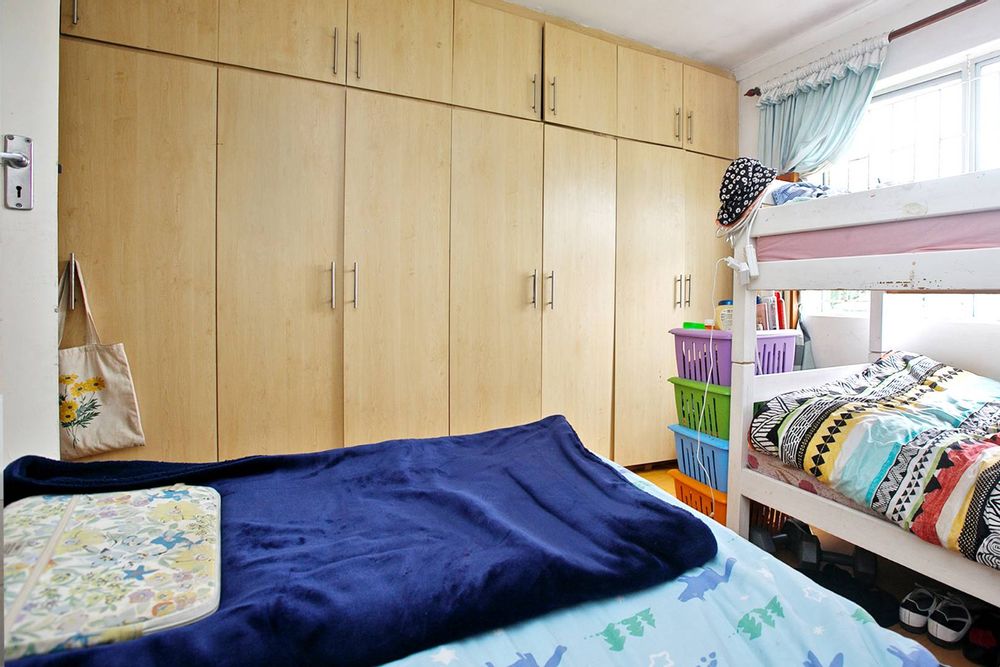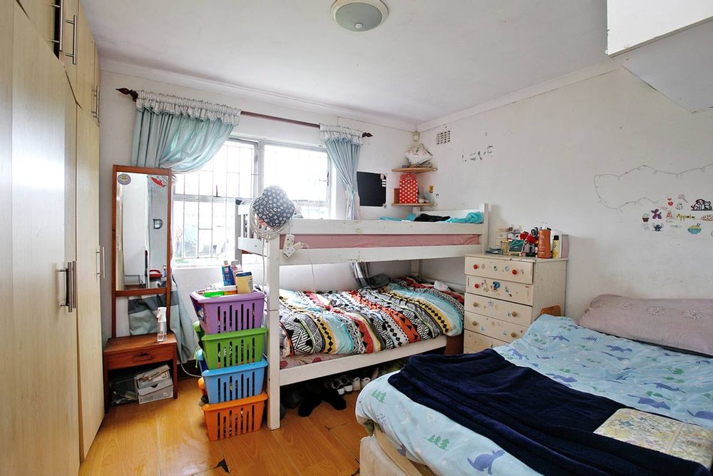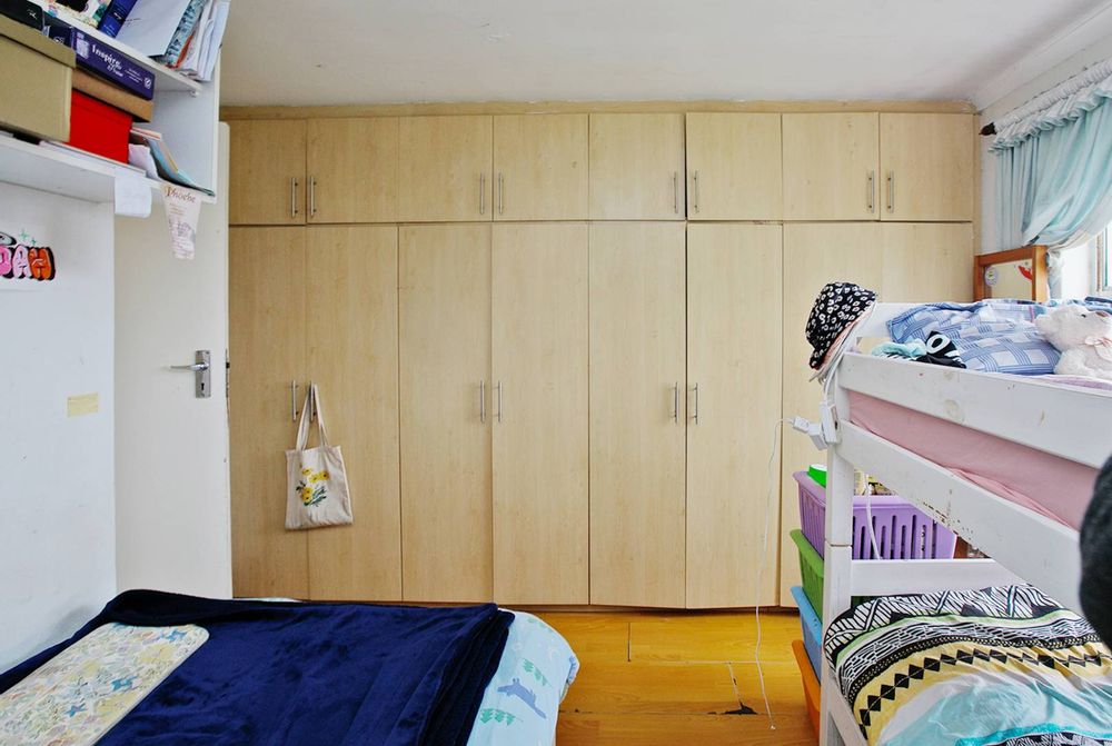 The generously sized bedrooms feature built-in cupboards and beautiful wooden floors, offering both style and practicality. The bedrooms are conveniently grouped together, providing an added sense of privacy.