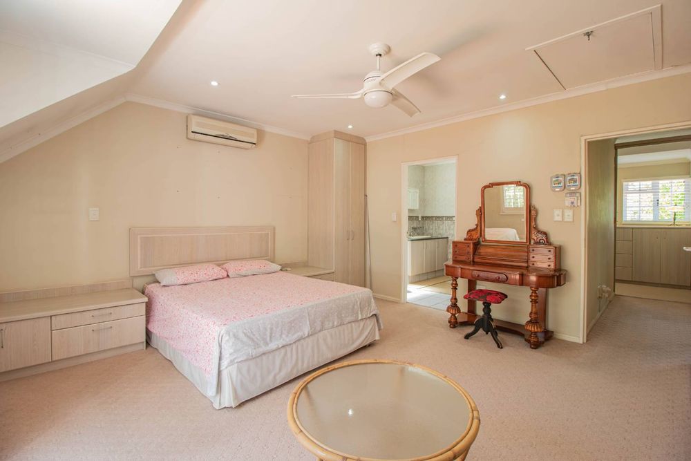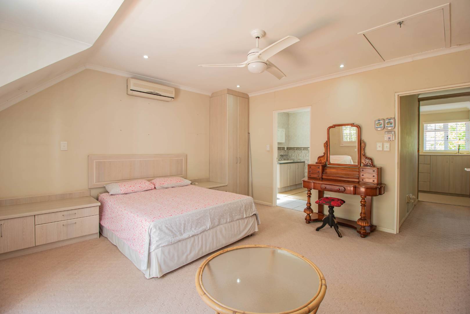 The generous-size main bedroom with built-in wardrobes, a dressing table with mirror, plus American shutters and air-conditioning, leads out to its own balcony with a leafy outlook and a lovely view of the mountains.