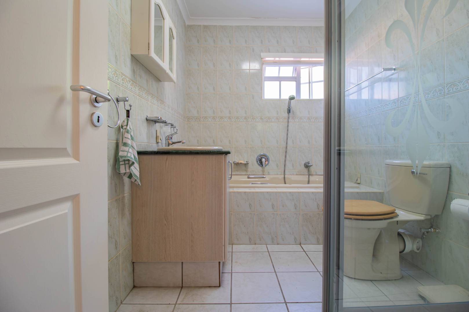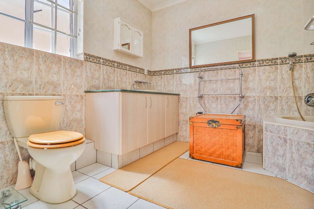 The full en-suite bathroom includes a corner bath plus a shower, loo, and basin with vanity cupboards and window blinds.