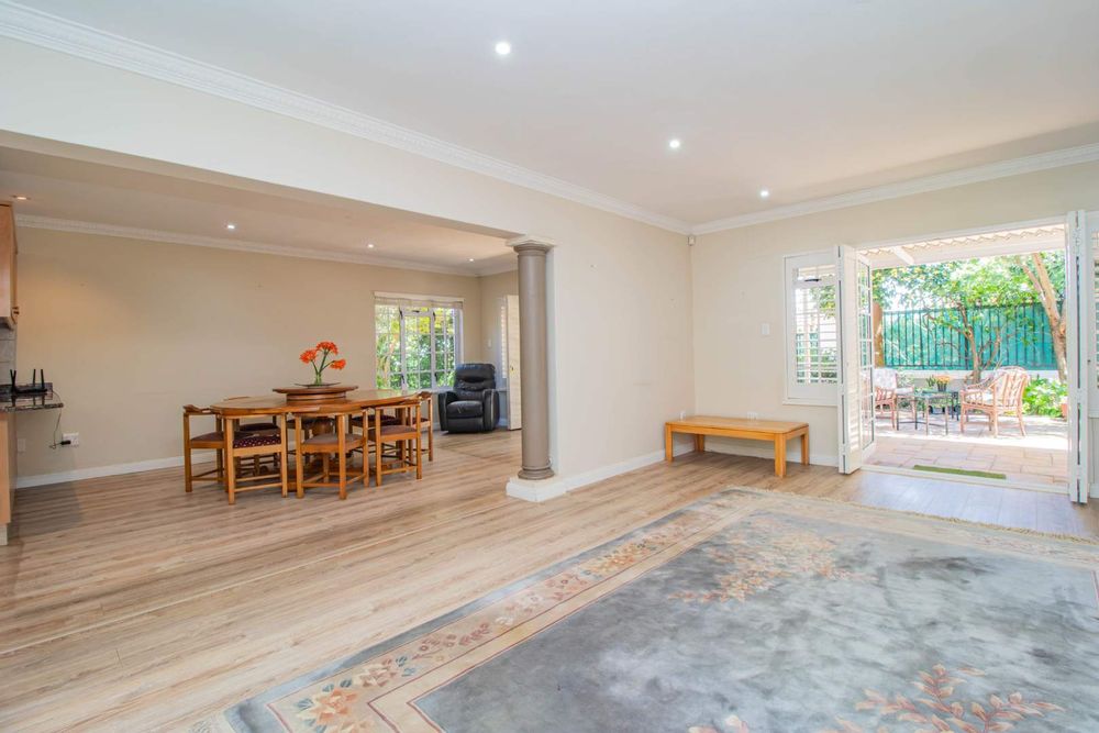 Spacious, open-plan living area with a built-in feature gas fireplace and dining room area. Both include Vinyl/Laminate flooring and stylish American security shutters and lead out through cottage pane double-doors to the back patio with an adjustable louvre-aluminium pergola and surrounding greenery and nature.