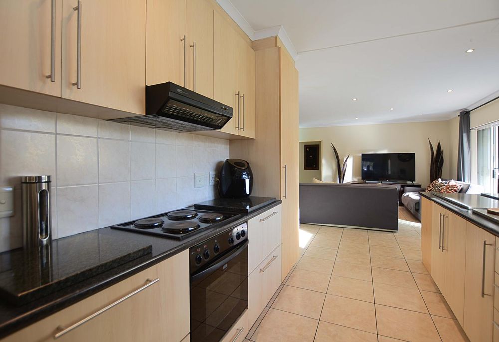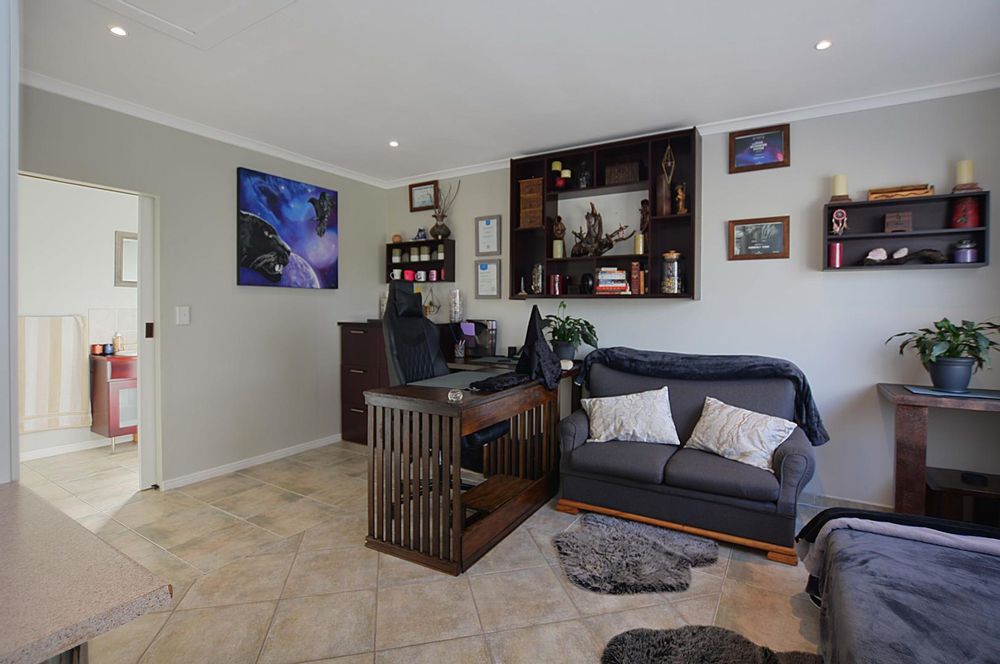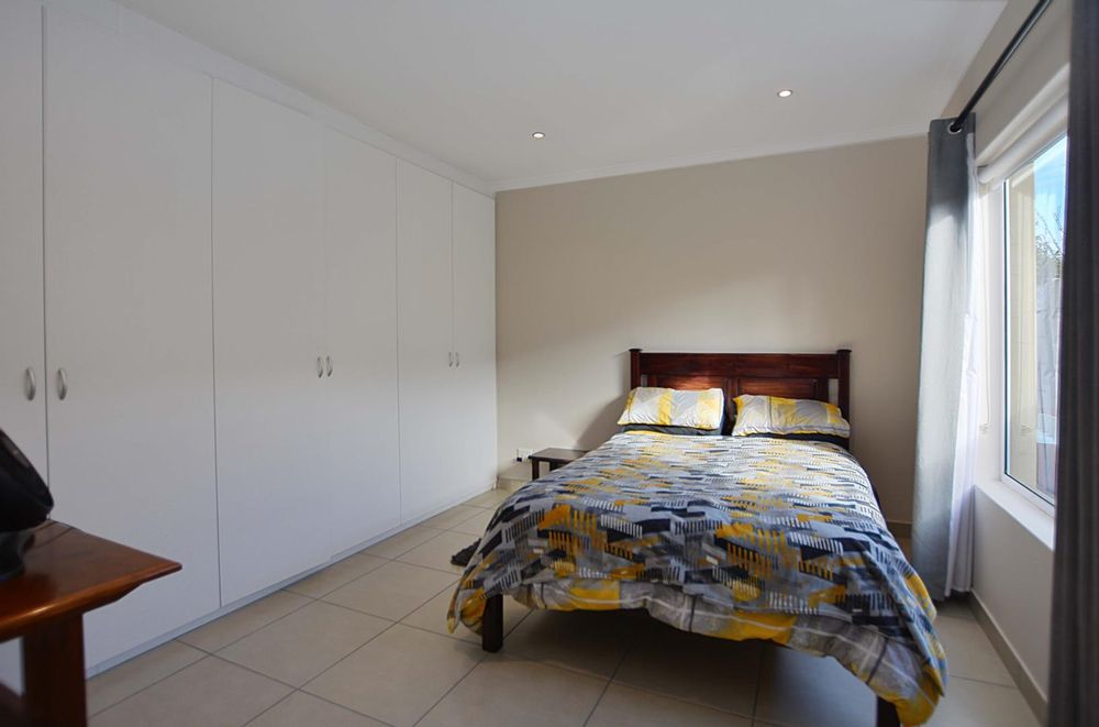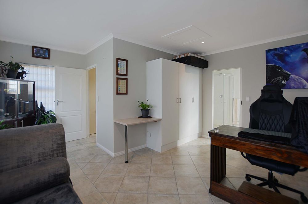 Above the triple garage, the first flatlet provides a private retreat with a bathroom, combined living and bedroom area, and an adjoining gym or workspace—ideal for guest accommodation or a home office. The second flatlet is a well-appointed unit featuring an air-conditioned bedroom with built-in cupboards, an integrated bathroom, and an open-plan kitchen and lounge. Additional amenities include a storeroom, an 8 KW solar system, burglar bars, a safety gate, and an electric fence, ensuring security and sustainability. The back garden is thoughtfully designed with irrigation systems, play areas for children and pets, and dual JoJo tanks for water storage, enhancing the property’s appeal and adaptability for various needs and aspirations.
