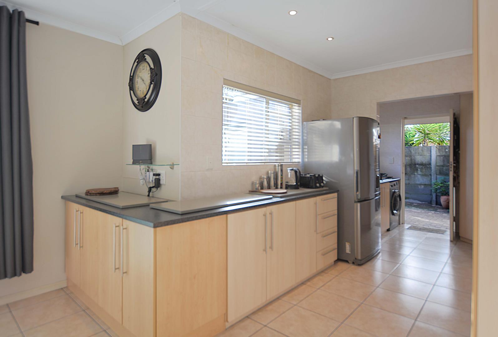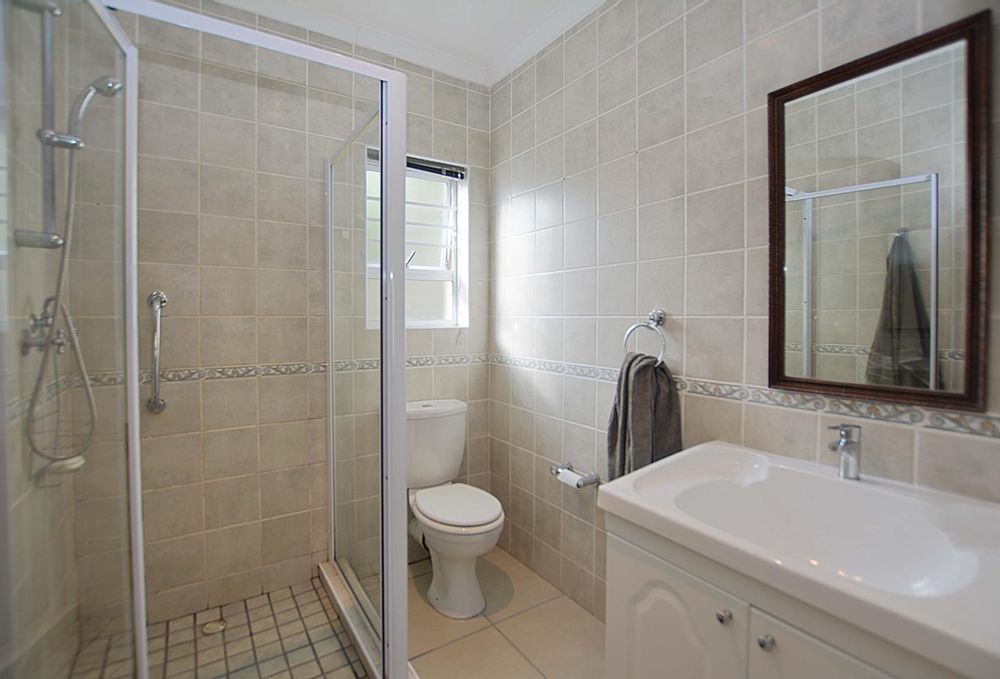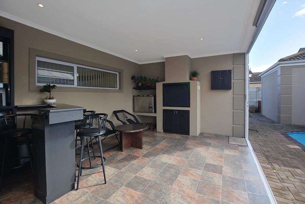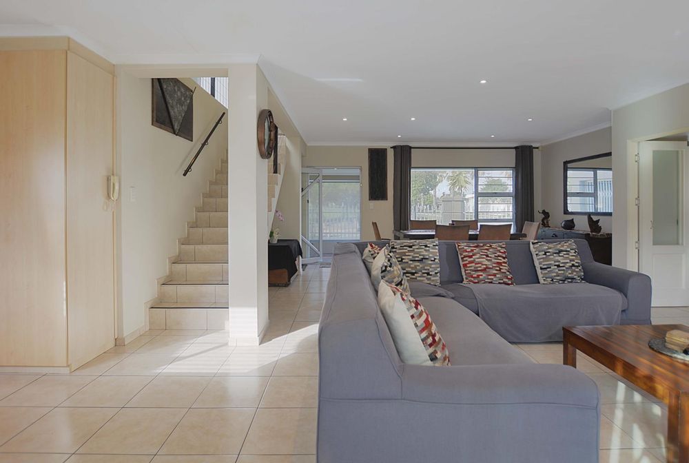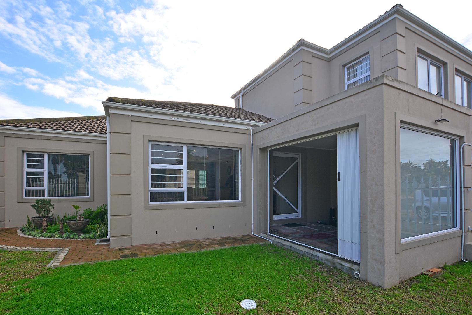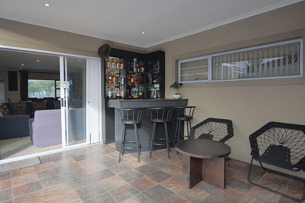 This exceptional corner-lot property is a modern gem with impressive potential for passive income. It features a spacious family residence and two versatile flatlets, offering both contemporary living and income-generating opportunities. The main house boasts an open-plan layout, seamlessly integrating the lounge and dining areas with an enclosed braai and entertainment space, complete with a stylish corner bar. Stack doors open onto a paved pool area with rooftop heating, while the kitchen impresses with ample built-in cupboards, extensive countertops, and a convenient scullery. The residence includes three generously sized bedrooms with built-in wardrobes, a main bedroom with air conditioning and a full ensuite bathroom featuring a corner bathtub. A fully tiled family bathroom with a shower, bathtub, toilet, and vanity unit adds to the home's functionality. The property also offers secure parking with a double and single garage, both equipped with automated doors.