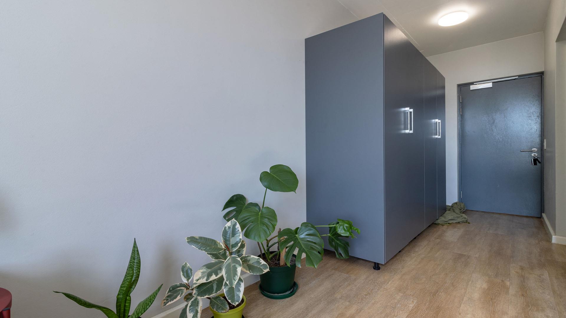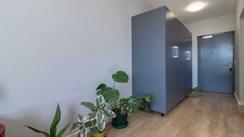 Inside, the apartment is bright, clean, and well-laid-out. As you enter, you’re welcomed by built-in cupboards to the right and a modern bathroom on the left, featuring a large shower, window and extractor fan for ventilation. The open-plan living area accommodates a double bed with space to spare – perfect for home workouts or a cozy work-from-home setup.