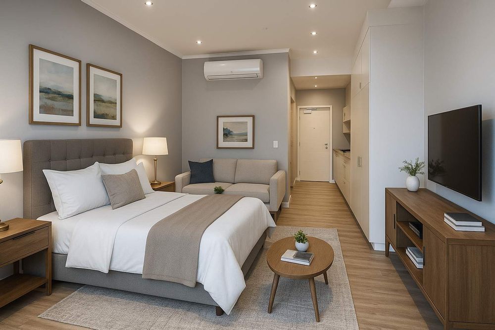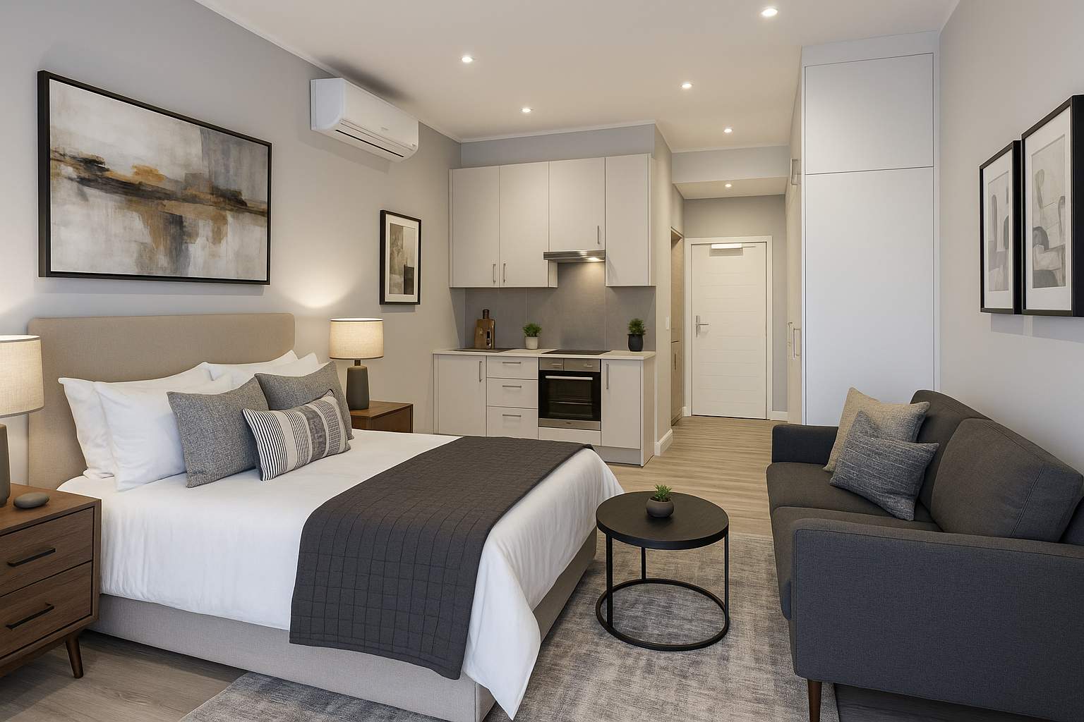 This beautifully appointed studio apartment boasts upmarket finishes throughout, featuring modern state-of-the-art appliances, elegant vinyl flooring, and a thoughtfully designed layout that maximizes comfort and ease of living. Please note the Pictures have been Photoshopped to highlight the options in the unit
