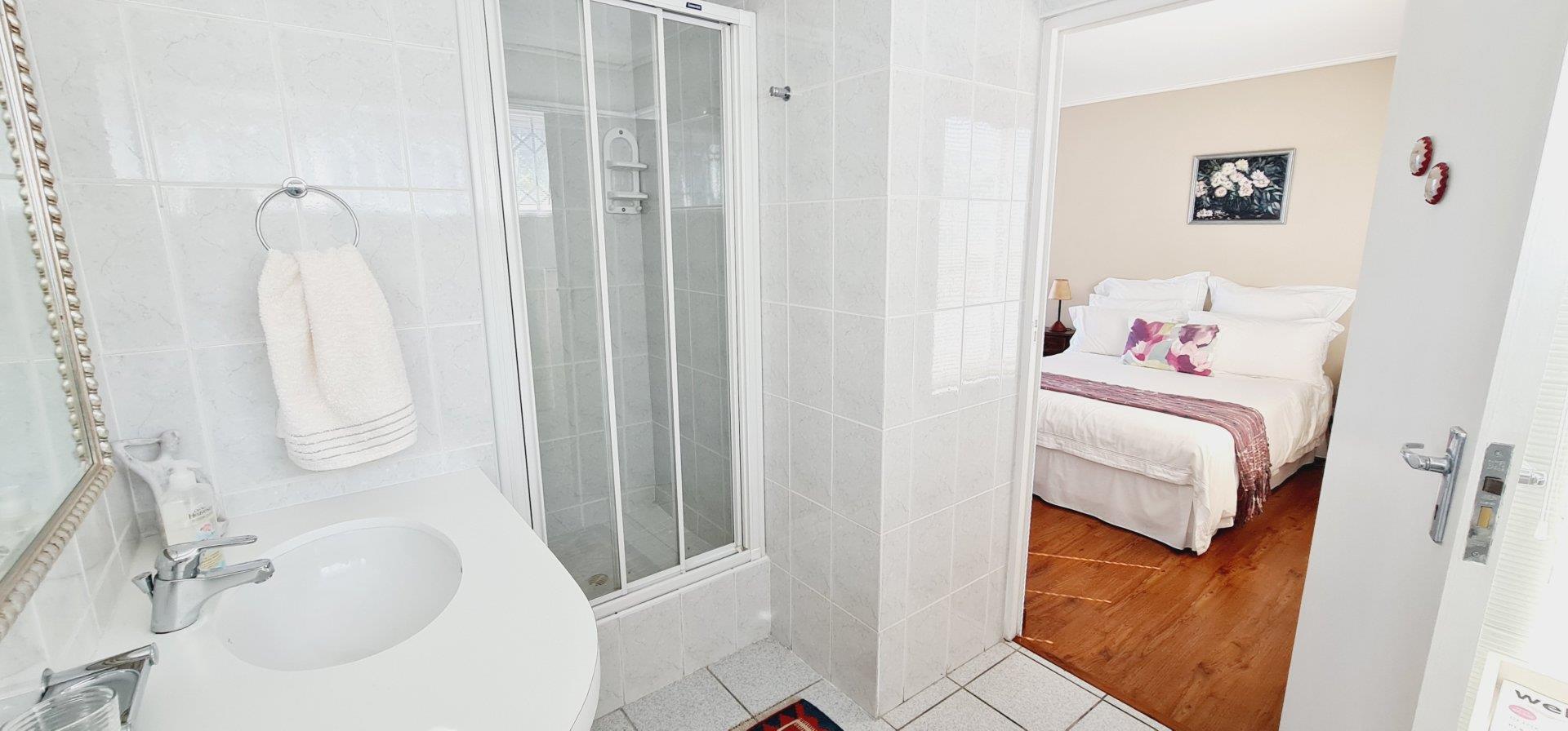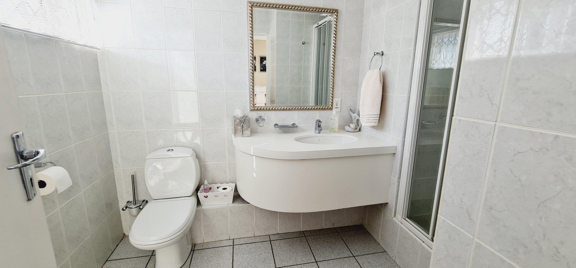 The main dwelling welcomes you with a grand foyer leading to a double garage with direct access. Adjacent to the foyer is a versatile bedroom, ideal for a home office or study, complete with an ensuite bathroom. Down the hallway, you'll find three more spacious bedrooms, including a master suite with its own ensuite and garden access. A family bathroom and a separate guest toilet enhance the convenience. The living spaces include a lounge with a fireplace, a dining area with ocean views, and an open-plan kitchen equipped with modern appliances and abundant storage. The kitchen seamlessly connects to a large laundry area featuring built-in cupboards and Caesarstone countertops, all with upmarket finishes.