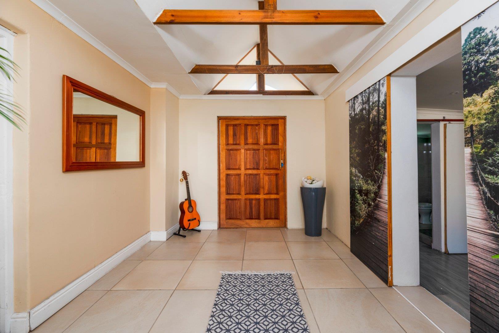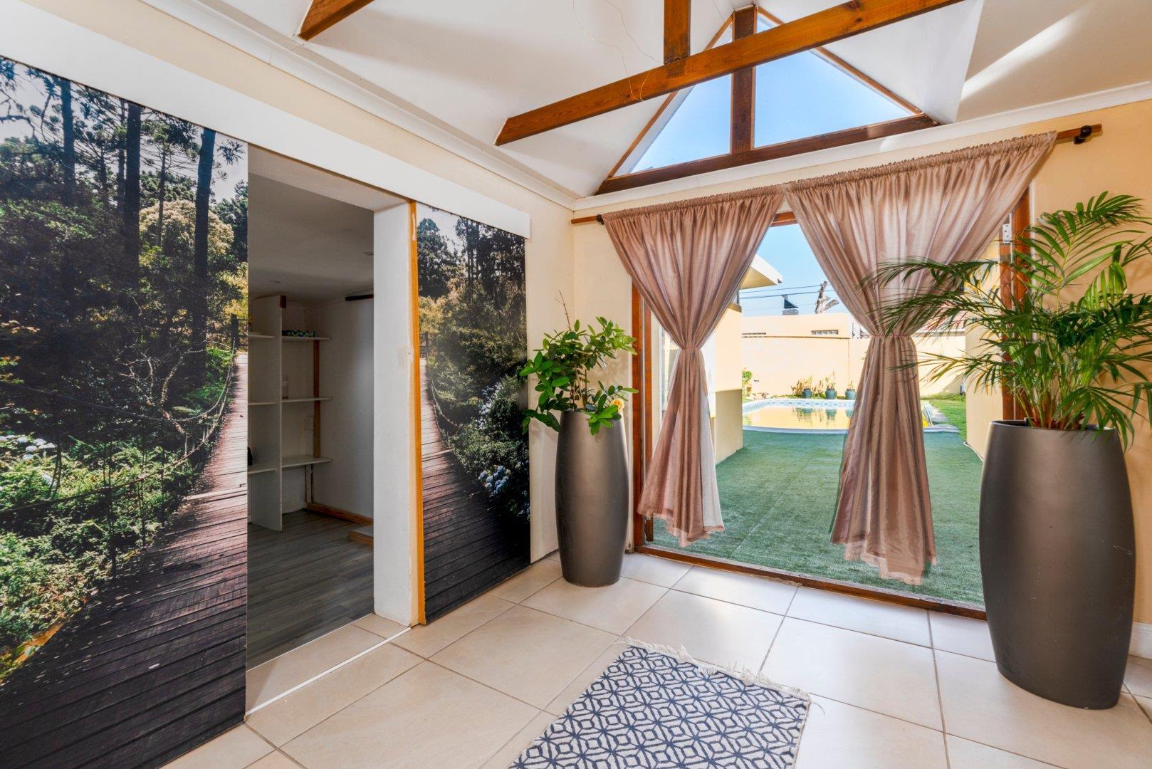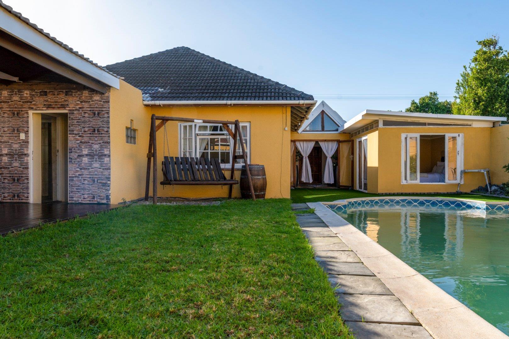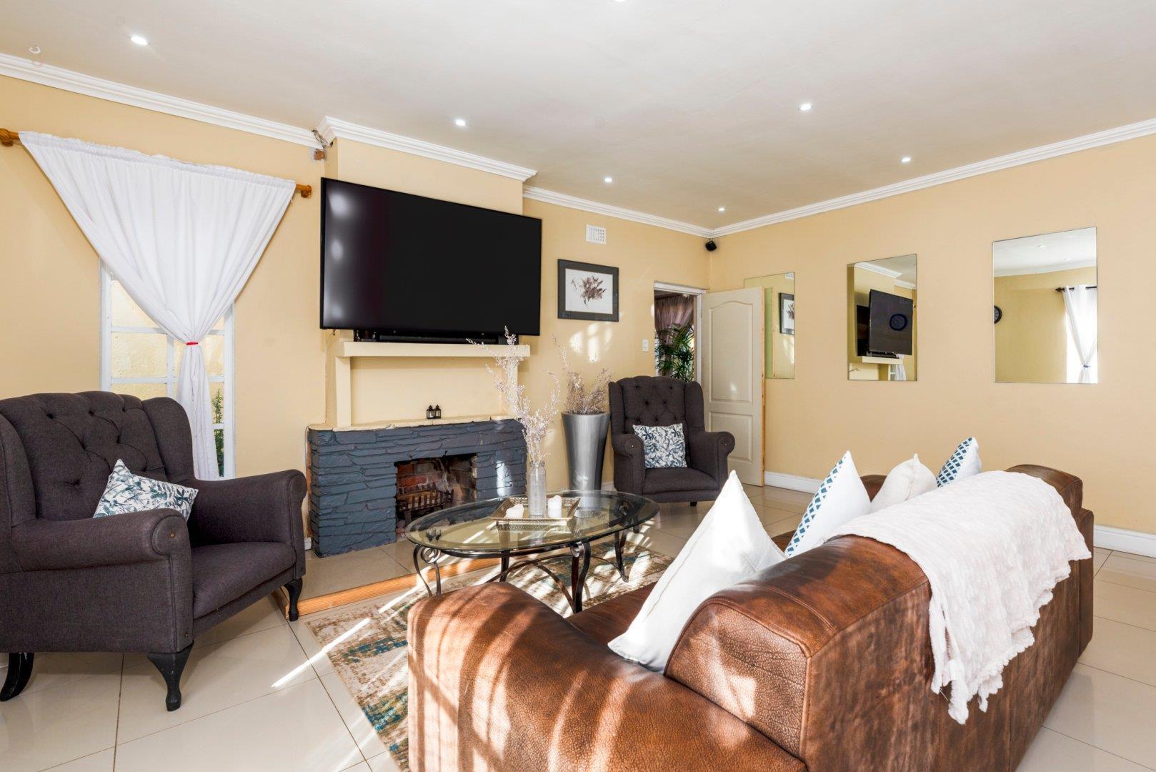This home boasts four comfortable bedrooms, including a luxurious main bedroom with a spacious ensuite, built-in cupboards, and a dressing room. The additional three bedrooms are serviced by a well-appointed, recently renovated bathroom, and there's also a convenient guest toilet. The open-plan, fully tiled lounge and dining area, complete with a cozy fireplace, create the perfect space for family gatherings and cozy evenings. The open-plan kitchen features built-in cupboards, an electric stove, and an oven. This property offers a seamless flow, with every exit leading you to the entertainment area.