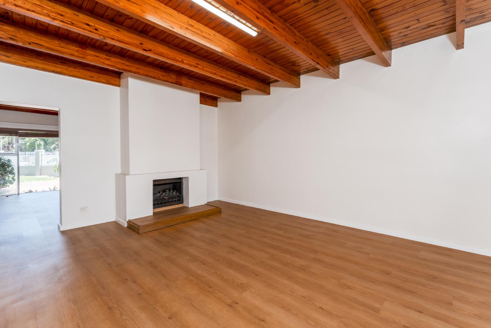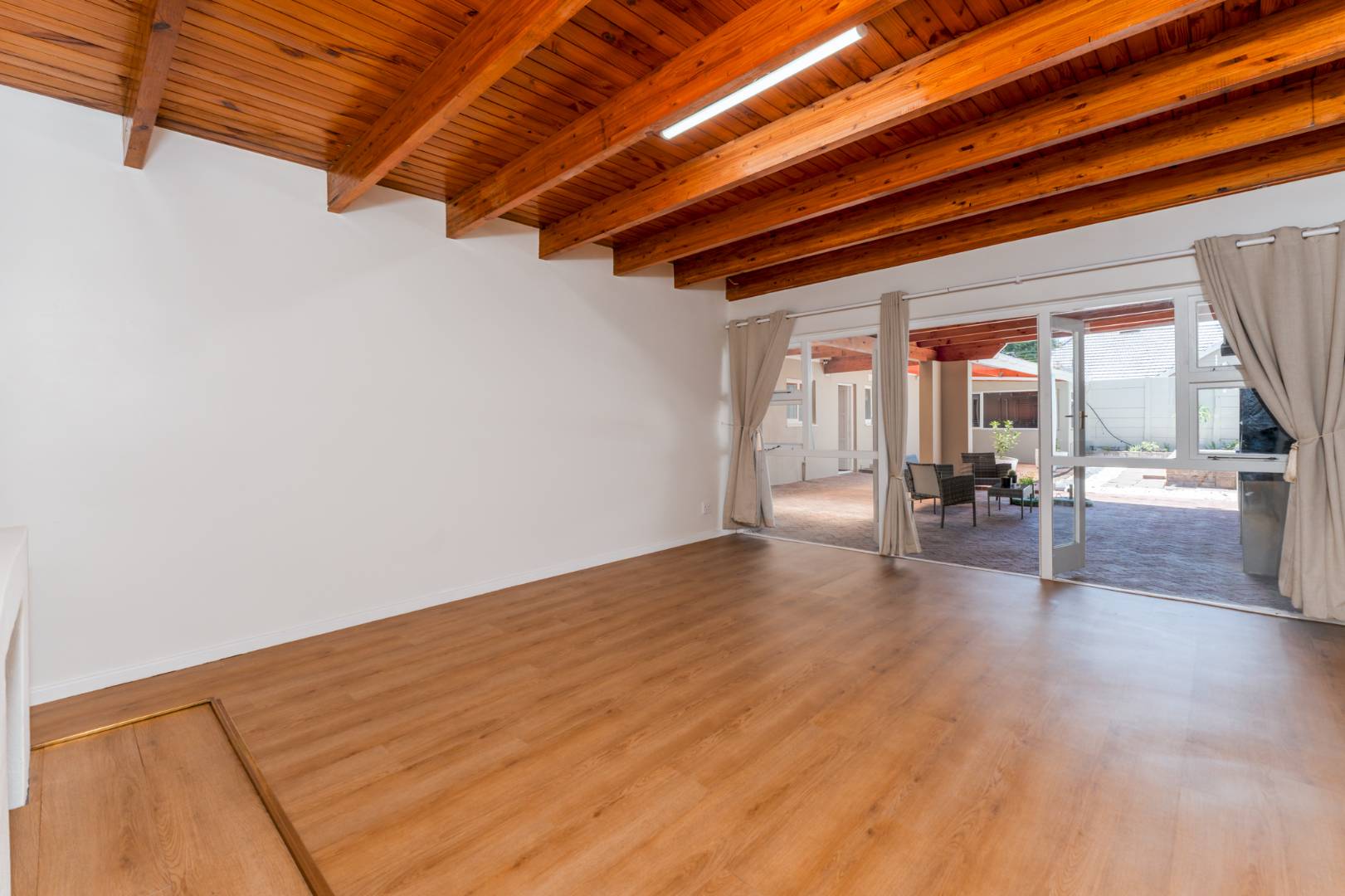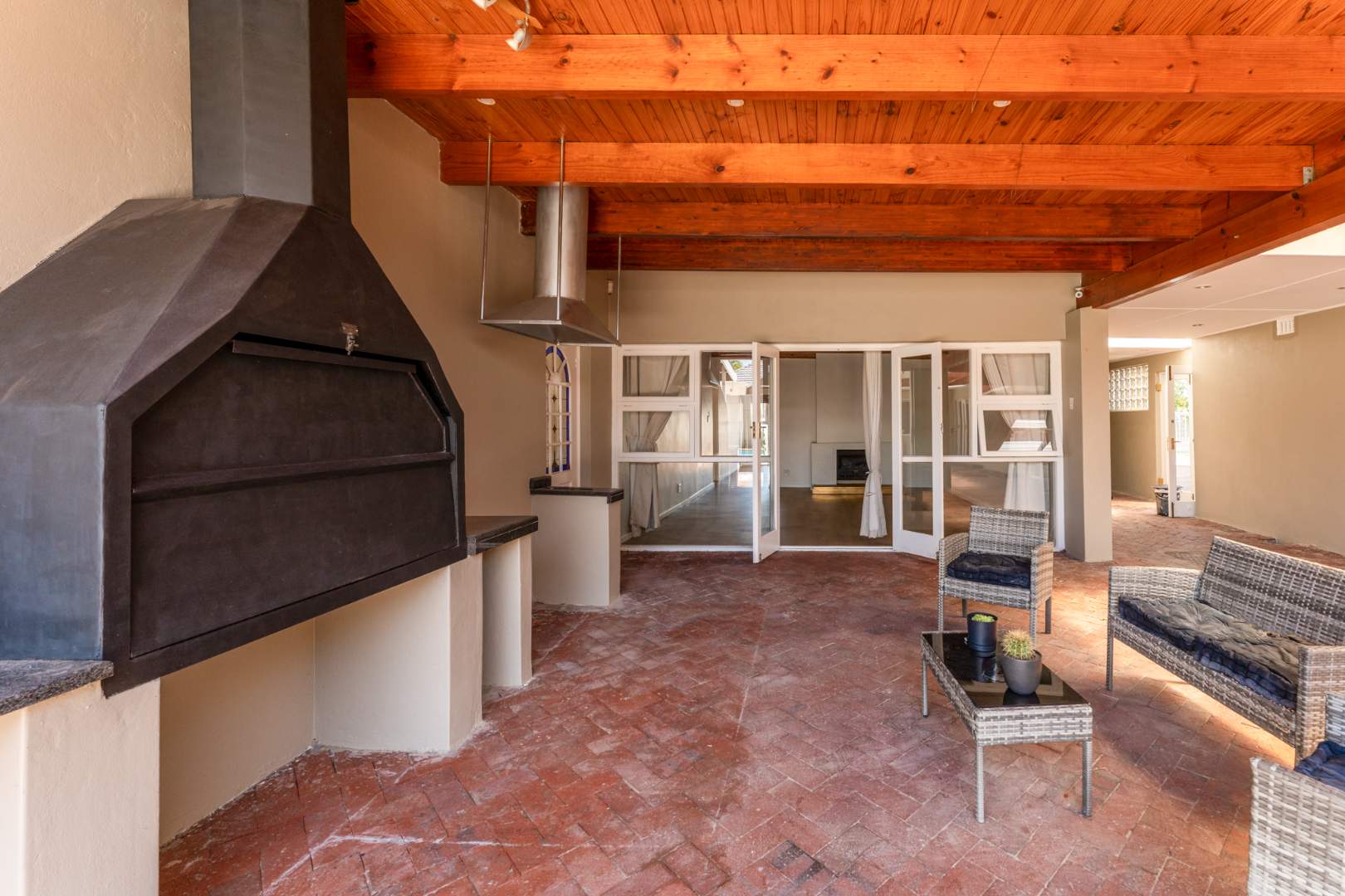 The inviting lounge is fitted with a gas fireplace and opens via patio doors to the sparkling swimming pool and braai area, perfect for entertaining. The modern kitchen includes ample built-in cupboards, sleek Caesarstone countertops, and a central island, flowing seamlessly into the open-plan dining room. A separate scullery completes this space.