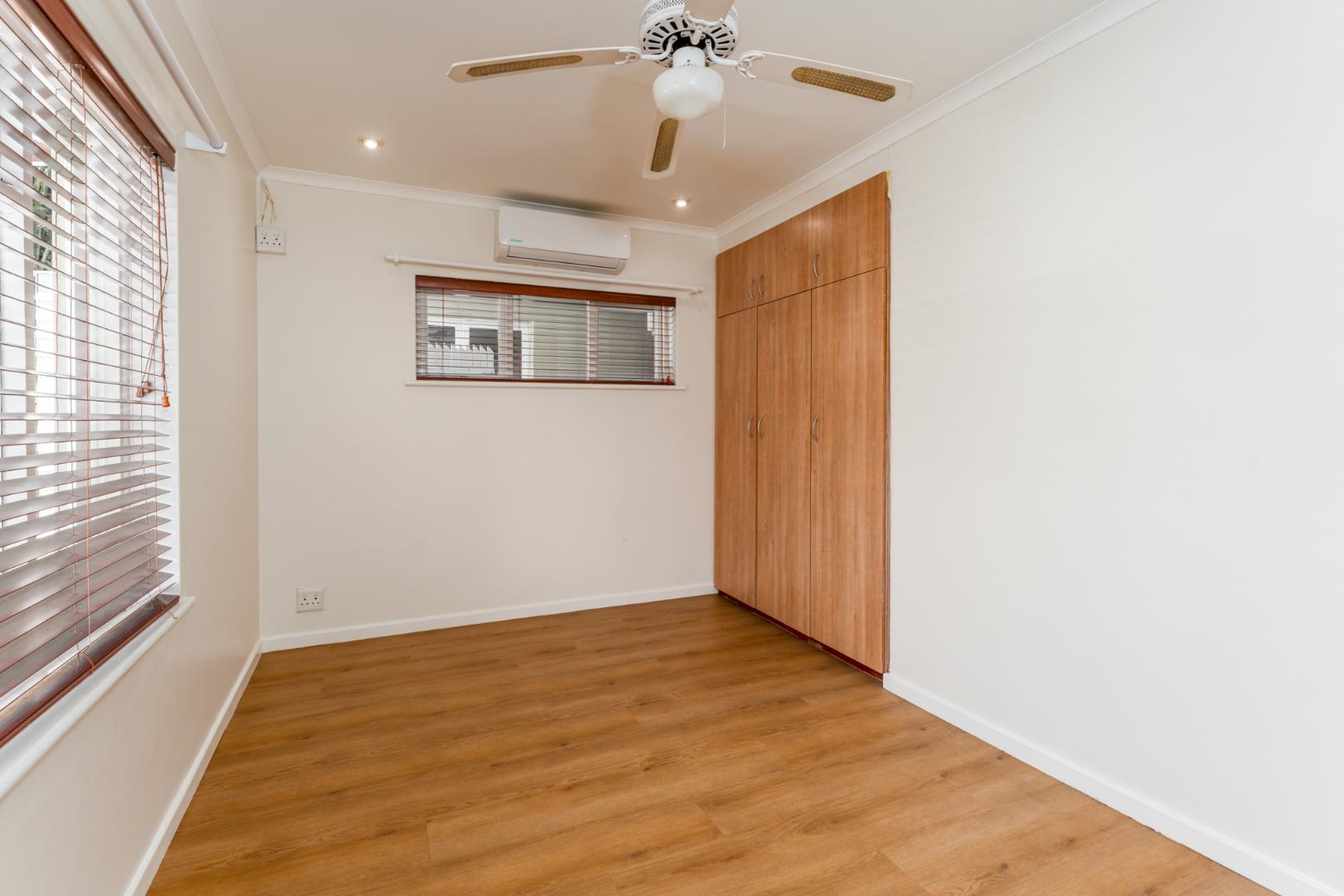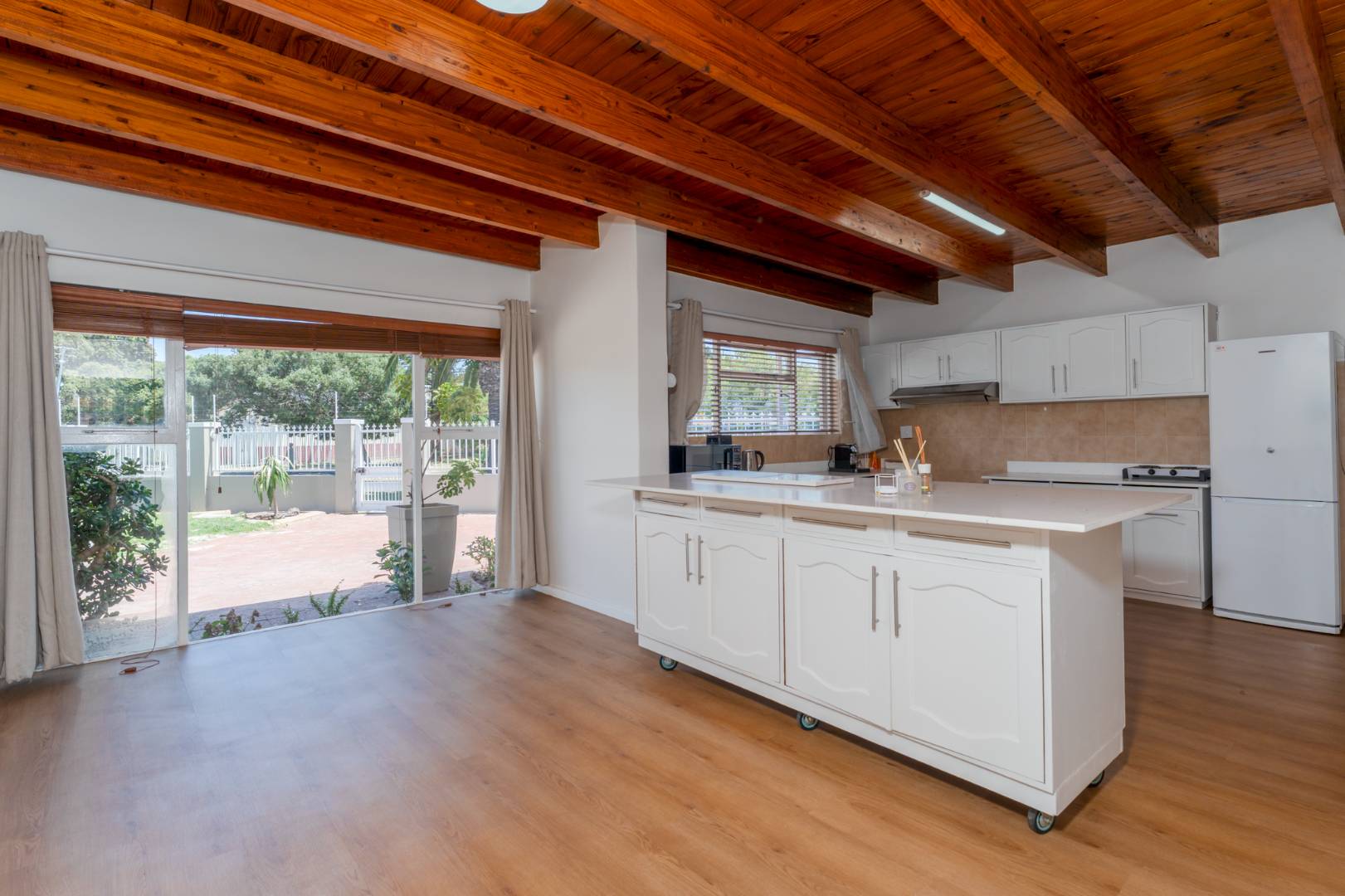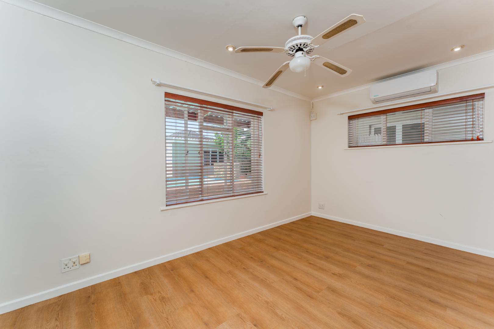 The inviting lounge is fitted with a gas fireplace and opens via patio doors to the sparkling swimming pool and braai area, perfect for entertaining. The modern kitchen includes ample built-in cupboards, sleek Caesarstone countertops, and a central island, flowing seamlessly into the open-plan dining room. A separate scullery completes this space.