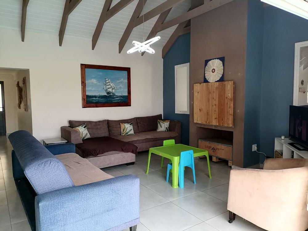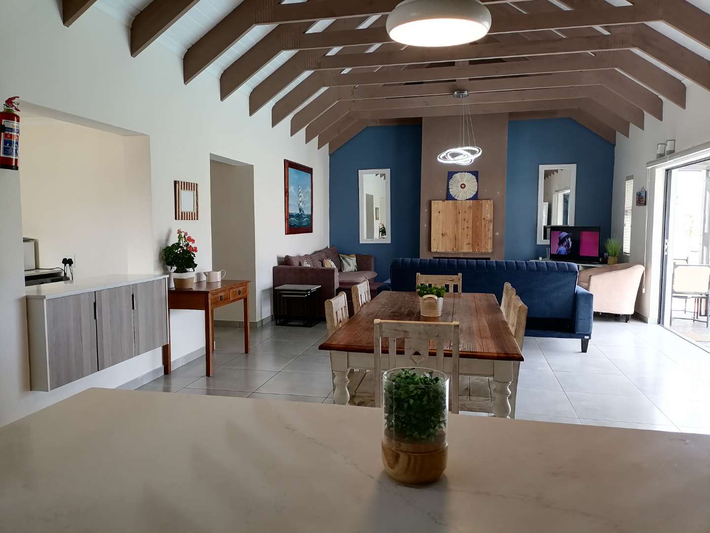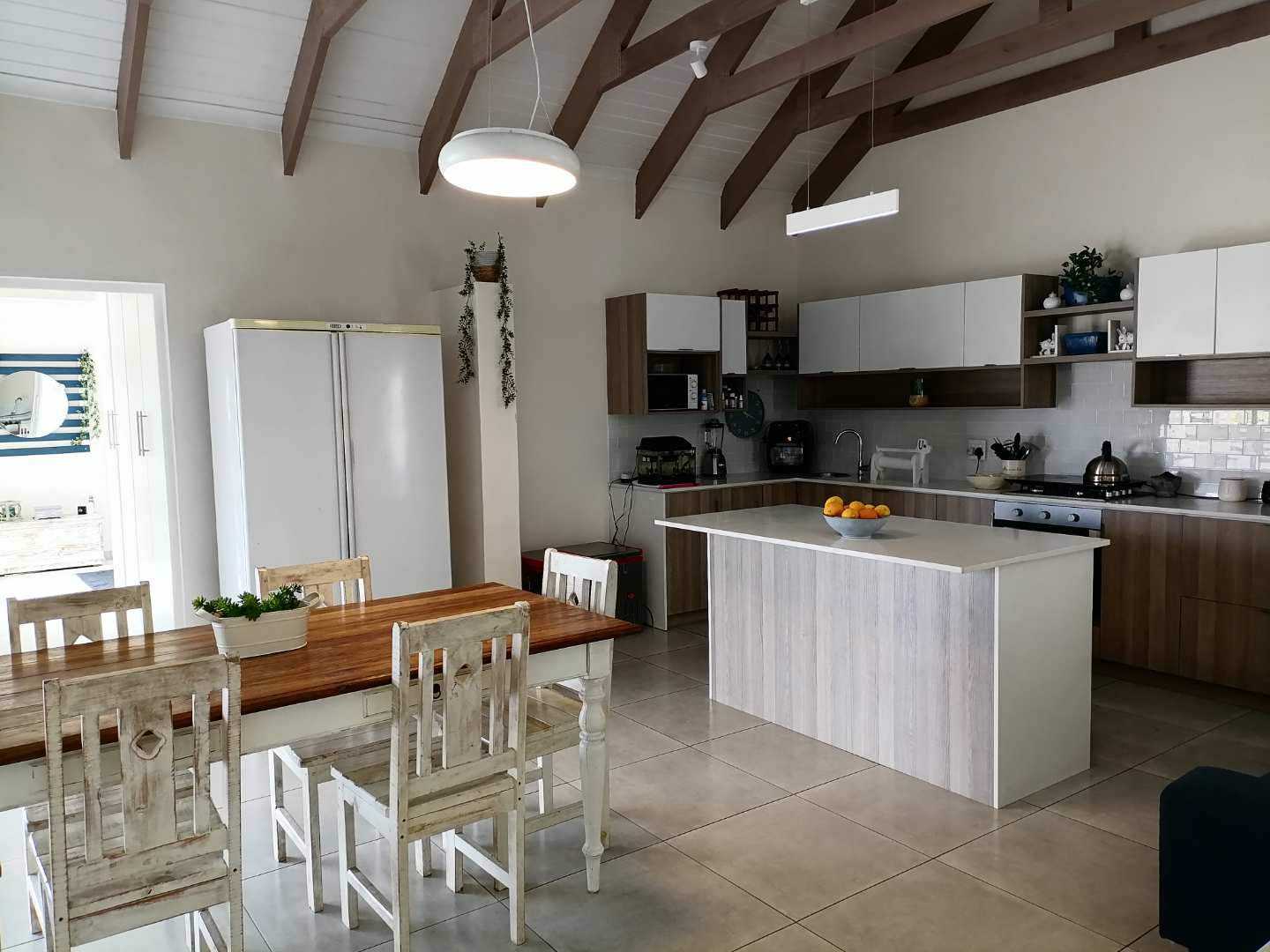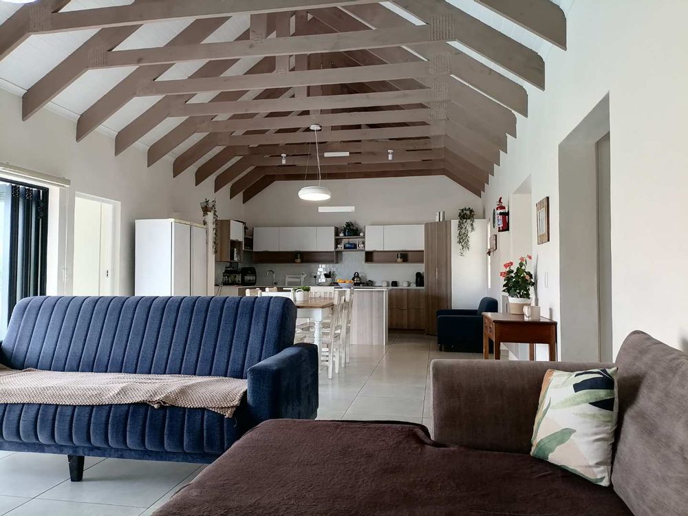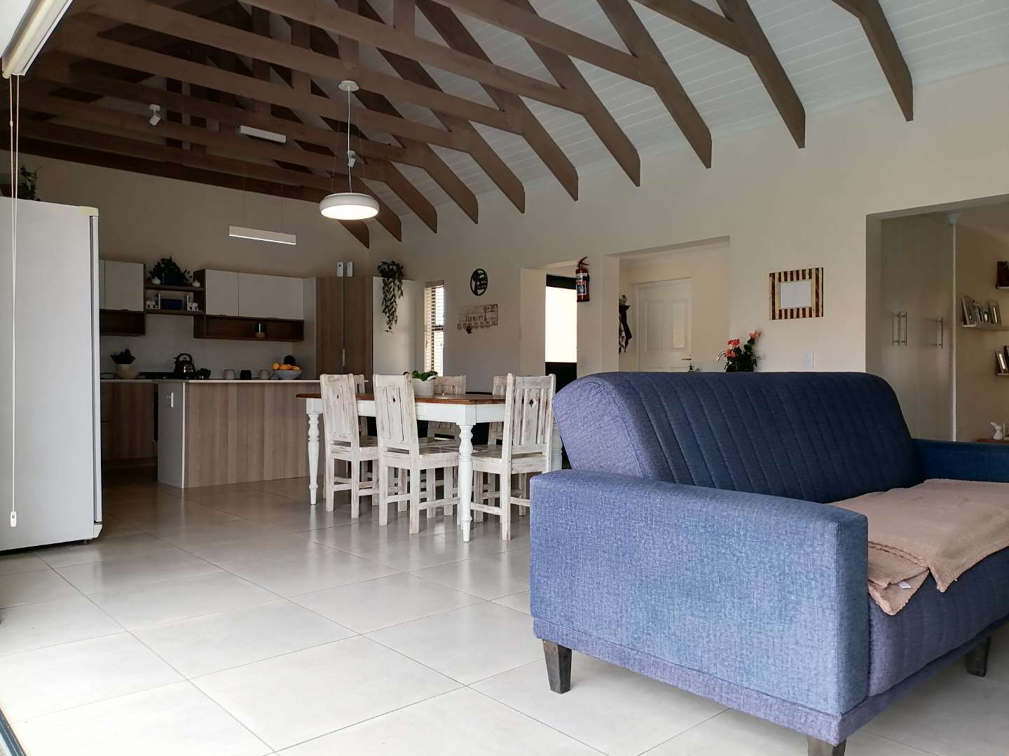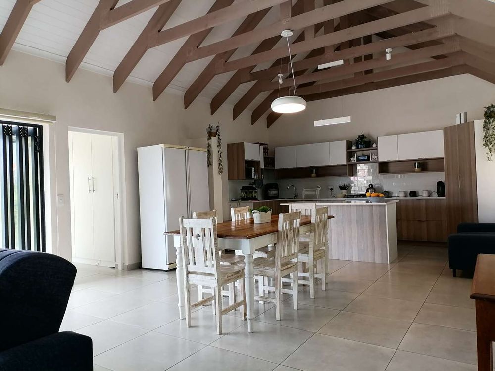 This newly built 3-bedroom, 2-bathroom residence has been thoughtfully designed to combine comfort, style, and functionality. Soaring double-volume ceilings with exposed rafters create a sense of spaciousness and architectural drama, while the open-plan layout seamlessly integrates the lounge, dining area, and kitchen—complete with a central island and an internal fireplace/braai for year-round entertaining. A separate scullery with wash-up facilities and a dishwasher adds convenience.