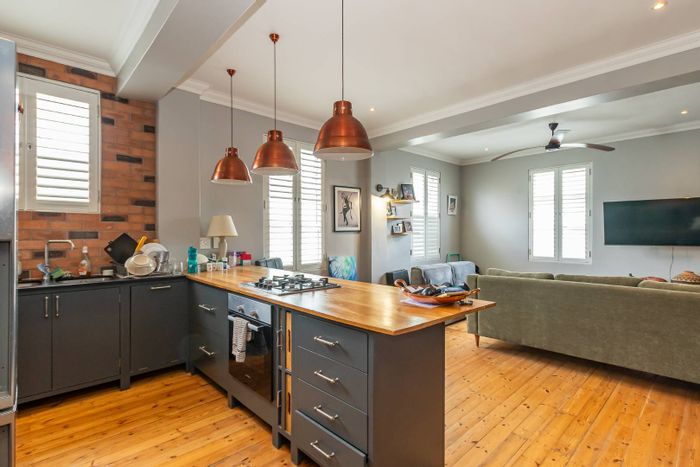 Morning-lit east-facing apartment with patio views of the Hottentot Holland Mountains in Claremont, open-plan living with American shutters, pool, gym and biometric access. 2 beds, 1.5 baths, 2 parking.