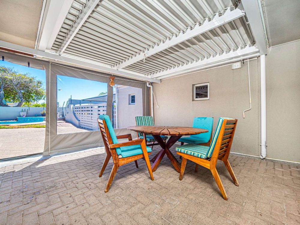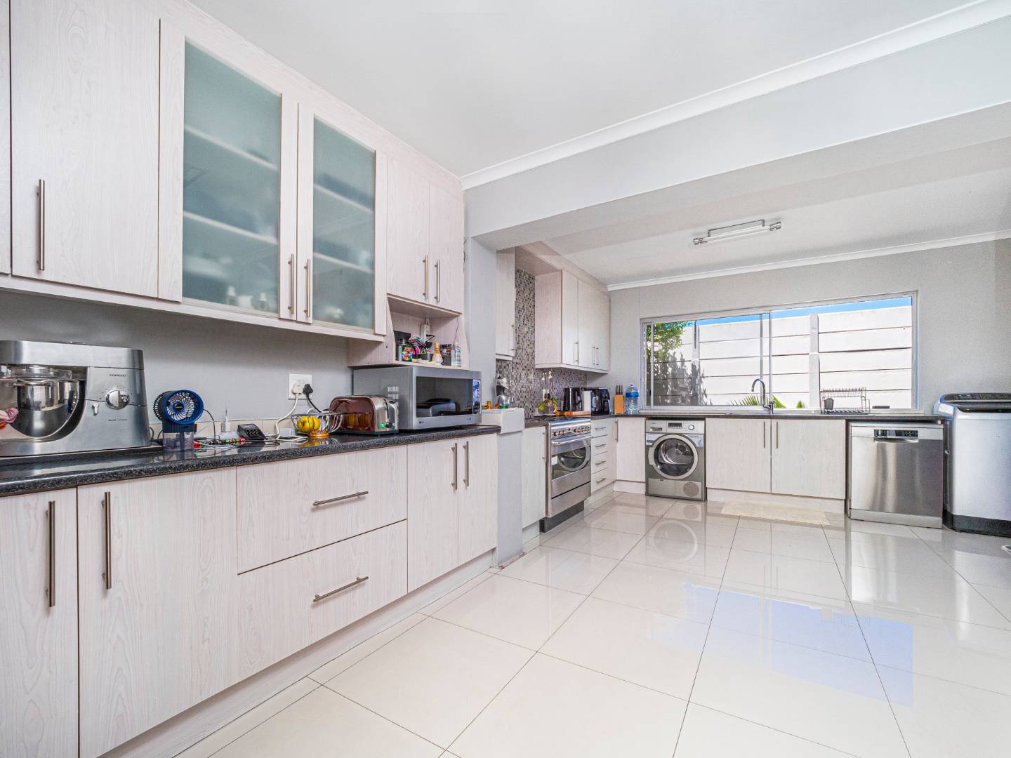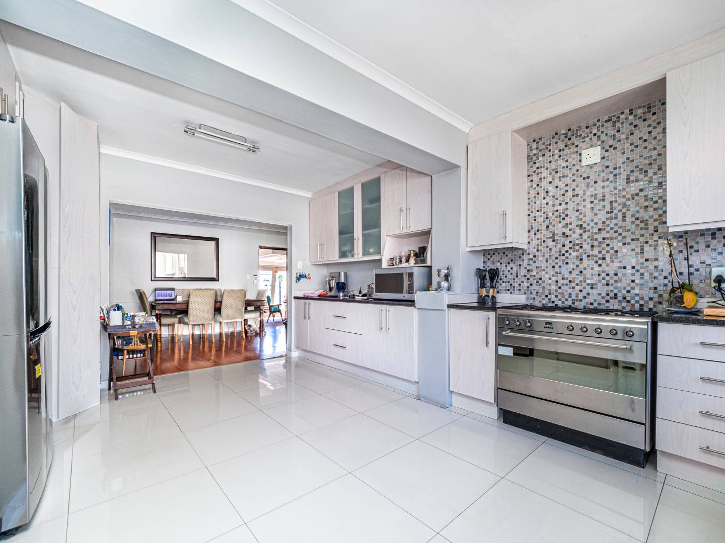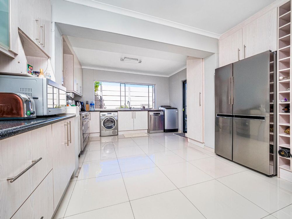 Masive modern open plan design kitchen with space for a double door fridge and plumbing for 2 appliances,porcelain tiles and granite counter tops. The dining and lounge area leads to the entertainment/braai area that has an aluminium roof with louvres that can be adjusted. And it's overlooking the pool.