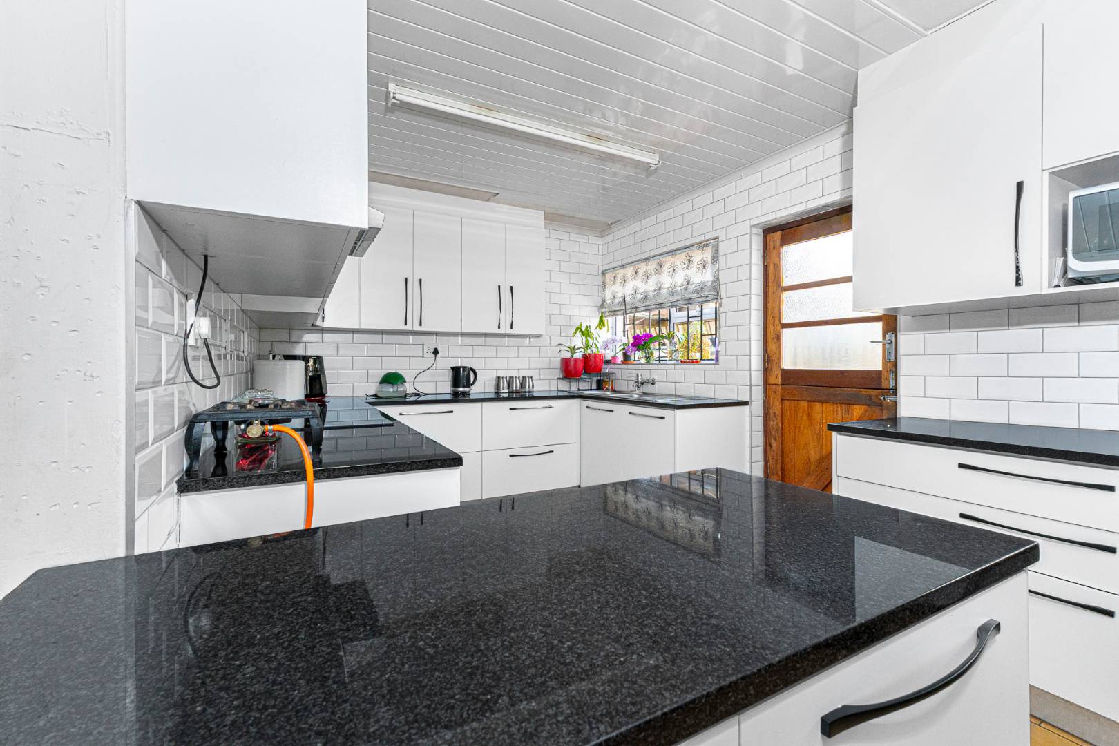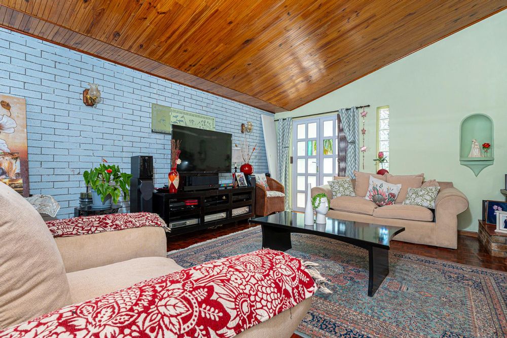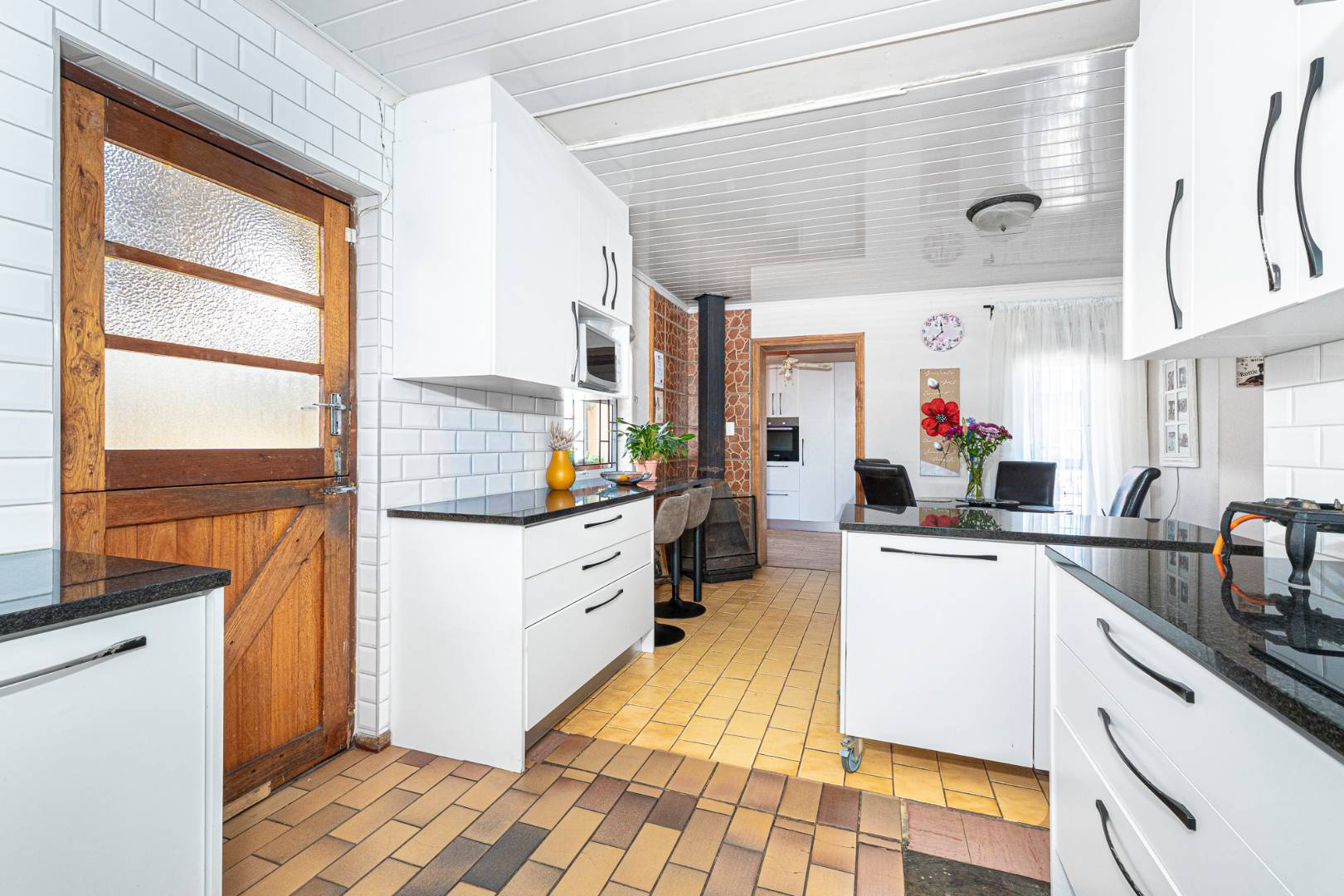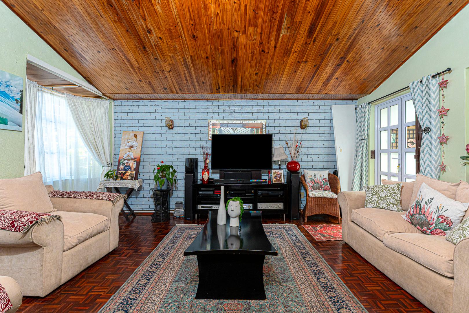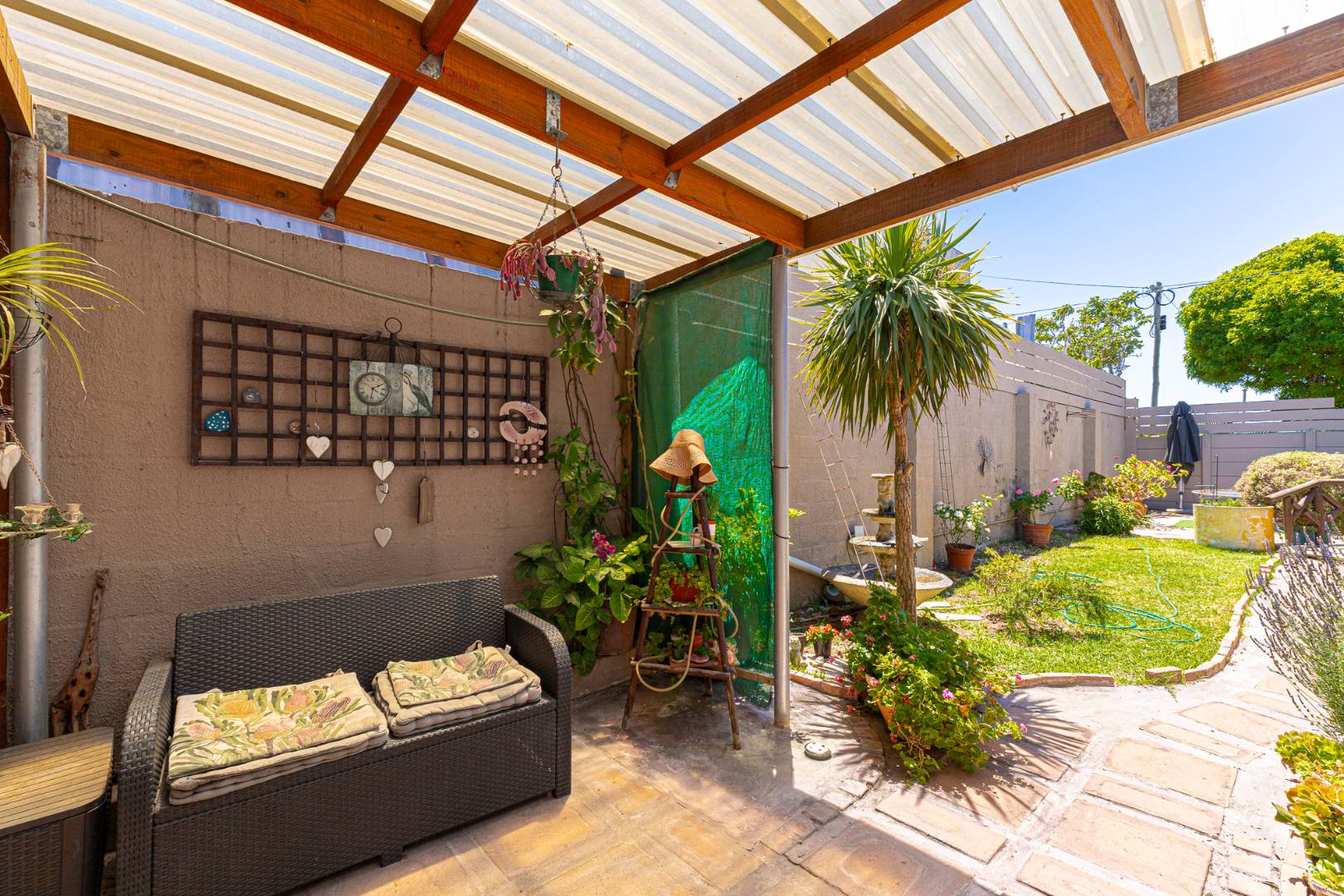 Step inside to a bright and airy living space that flows seamlessly into a neat, modern kitchen. The kitchen features granite countertops, ample cupboard space, quality finishes, a stove with extractor fan and generous natural light. The open-plan dining area and sunken lounge overlook the private back garden, complete with an undercover braai and entertainment area—perfect for relaxed gatherings.