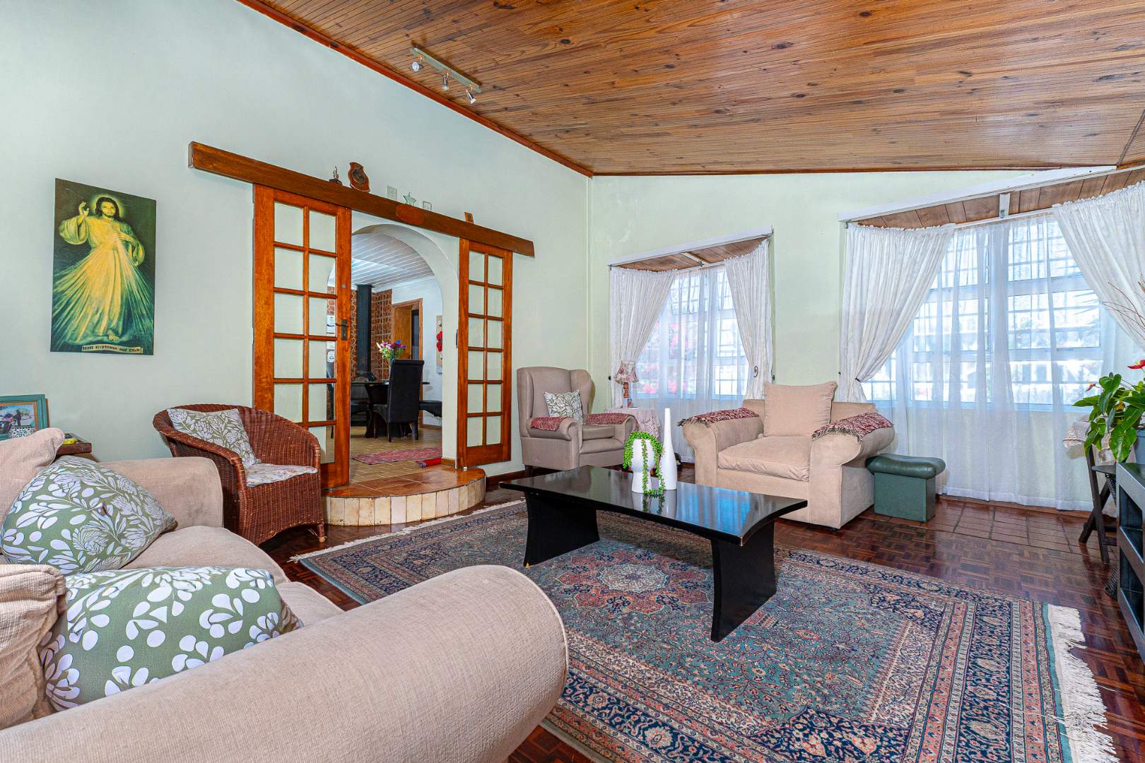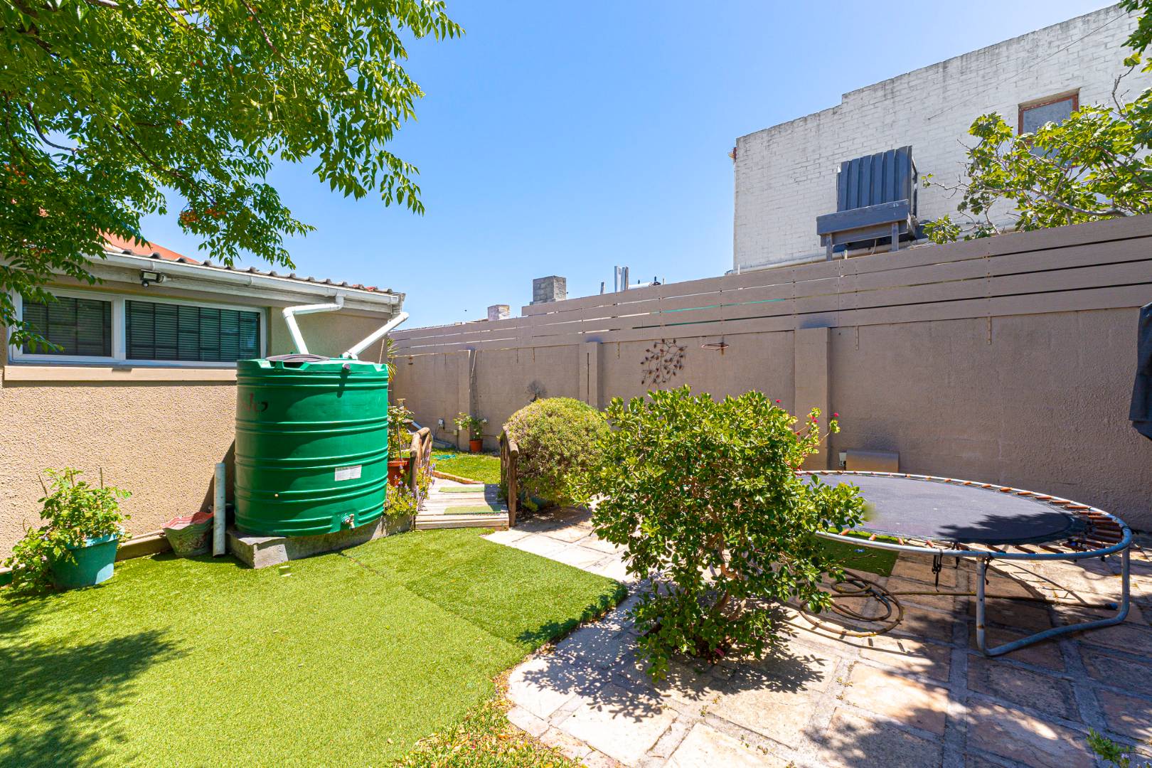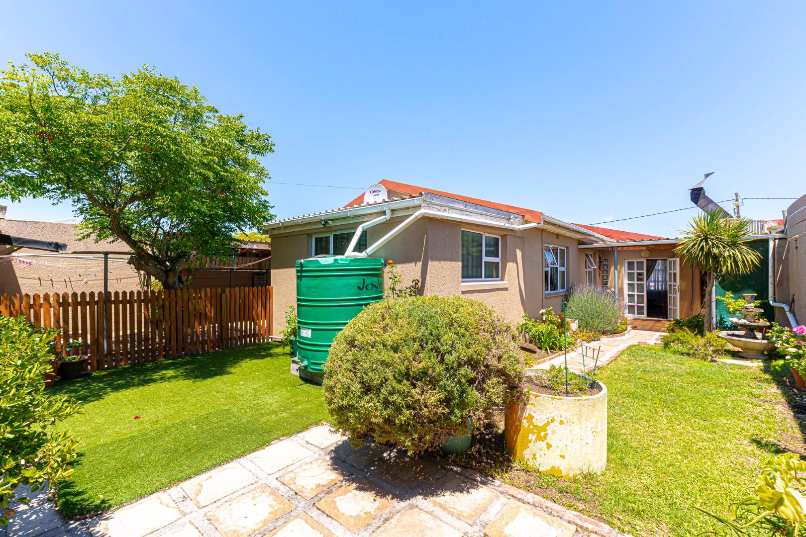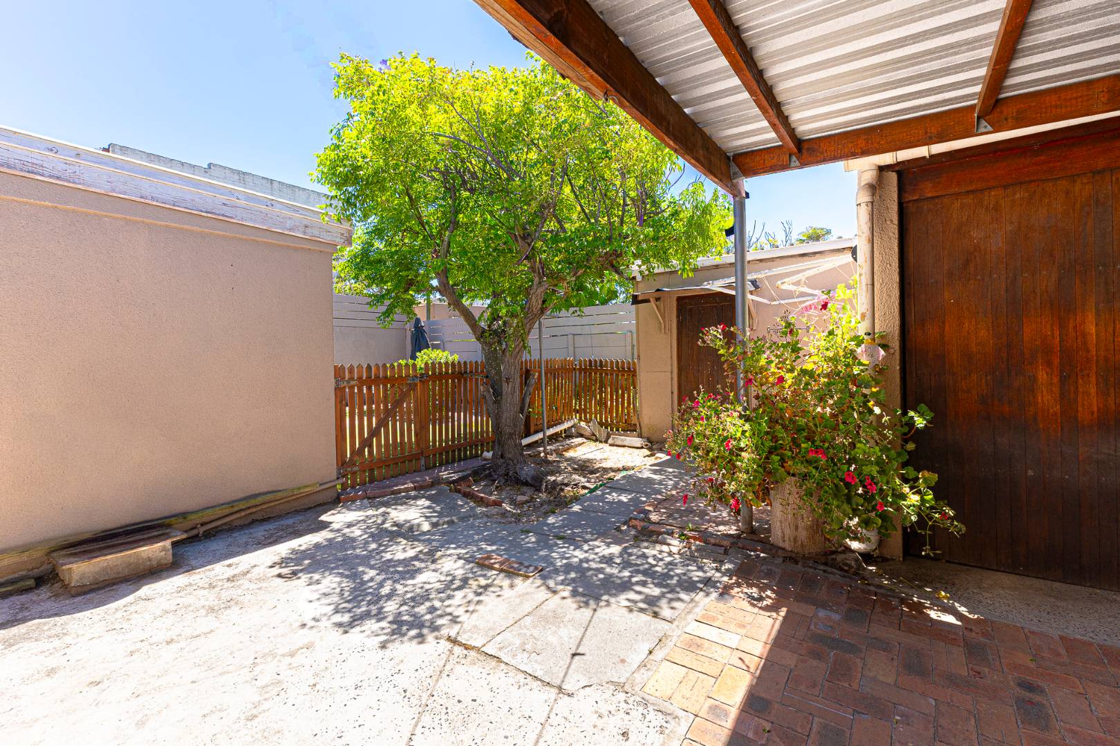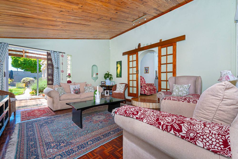 Step inside to a bright and airy living space that flows seamlessly into a neat, modern kitchen. The kitchen features granite countertops, ample cupboard space, quality finishes, a stove with extractor fan and generous natural light. The open-plan dining area and sunken lounge overlook the private back garden, complete with an undercover braai and entertainment area—perfect for relaxed gatherings.