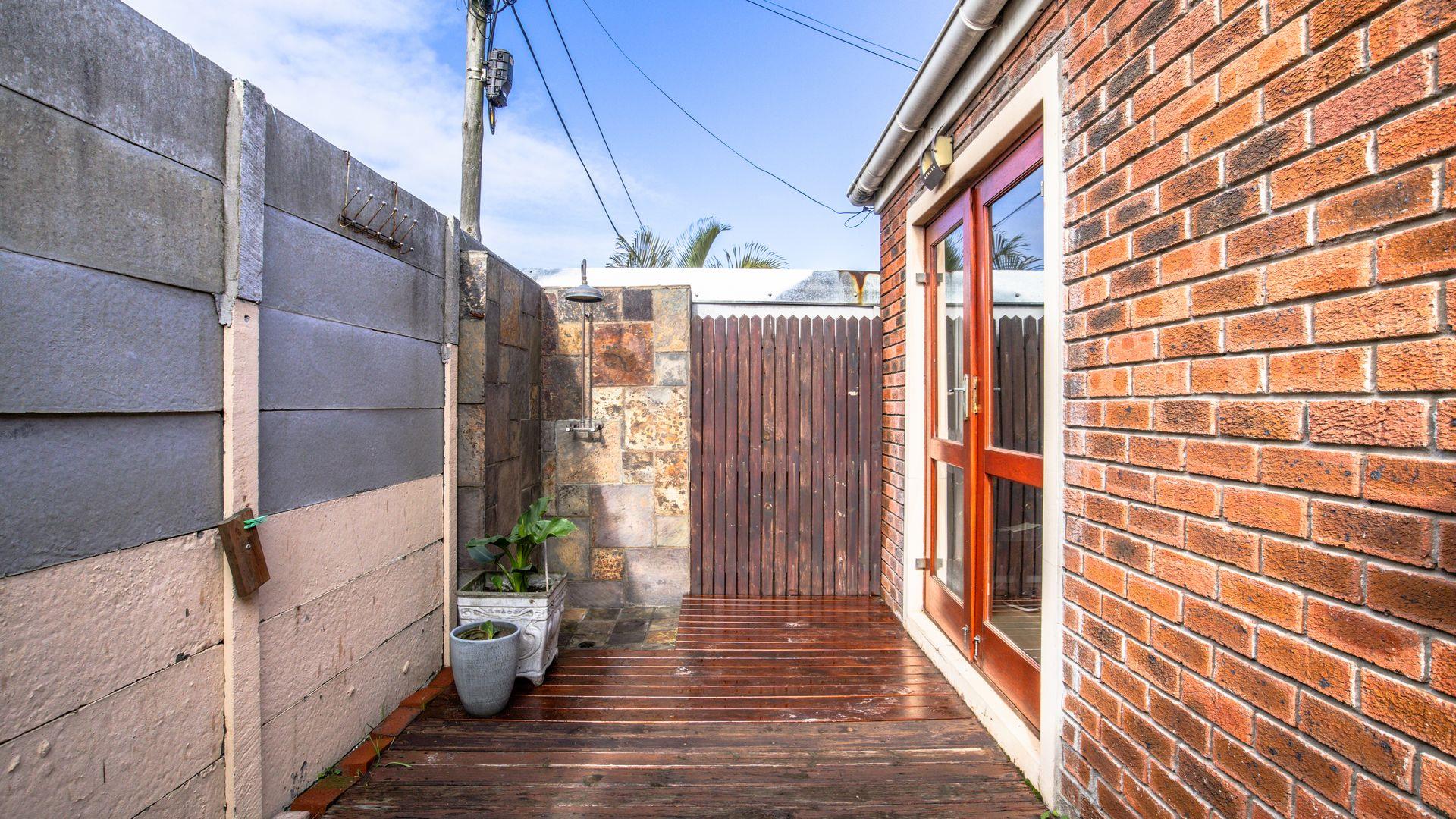 French doors of the main bedroom leading out to a small private space with wooden decking.