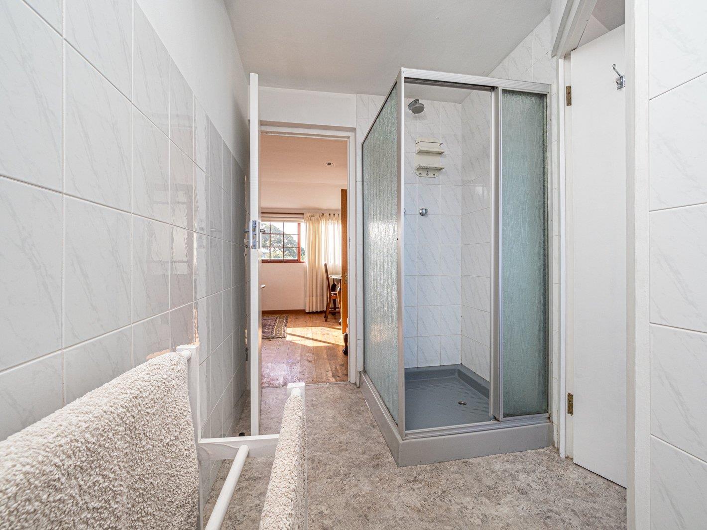 Staircase leading to the one-bedroom flat upstairs, ample storage space, open plan lounge, dining room with a kitchenette and bedroom. There is also a bathroom with shower, toilet and basin.